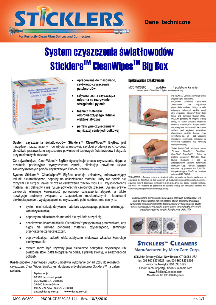 Dane techniczne For Perfectly Clean Fiber Splices and Connectors System czyszczenia światłowodów SticklersTM CleanWipesTM Big Box opracowane do masowego, szybkiego czyszczenia patchcordów sztywna taśma czyszcząca odporna na rozrywanie, strzępienie i pylenie taśma z materiału odprowadzającego ładunki elektrostatyczne perfekcyjne czyszczenie w najniższej cenie jednostkowej System czyszczenia światłowodów Sticklers™ CleanWipes™ BigBox jest narzędziem przeznaczonym do użycia w masowej, szybkiej produkcji patchcordów. Umożliwia pracownikom czyszczenie powierzchni czołowych światłowodów i złączek przy minimalnych kosztach. Co najważniejsze, CleanWipesTM BigBox dyscyplinuje proces czyszczenia, dając w rezultacie perfekcyjnie wyczyszczone złączki, eliminując powtórne użycie zanieczyszczonych płynów czyszczących i/lub chusteczek. System Sticklers™ CleanWipes™ BigBox cechuje unikatowy, odprowadzający ładunki elektrostatyczne, odporny na odkształcenia materiał, który nie będzie się rozrywał lub strzępił, nawet w czasie czyszczenia złączek typu LC. Wysokochłonny materiał jest delikatny i nie rysuje powierzchni czołowych złączek. System prawie całkowicie eliminuje konieczność ponownego czyszczenia złączek, a także rozwiązuje problemy związane z cząsteczkami mechanicznymi i ładunkami elektrostatycznymi, występującymi na czyszczenie patchcordów. Inne cechy to: system minimalizuje dotykanie materiału czyszczącego palcami, eliminując zanieczyszczenia, Opakowania i oznakowanie MCC-WCS800 1 pudełko 4 pudełka w kartonie Okres trwałości CleanWipes™ BigBox jest nieograniczony INSTRUKCJA: Dokładna instrukcja użycia znajduje się na opakowaniu. PRODUKTY ZWIĄZANE: Czyszczenie „mokro-suche” daje najczystsze powierzchnie czołowe, dlatego w celu osiągnięcia najlepszych wyników stosuj płyn czyszczący SticklersTM Fiber Optic Splice and Connector Cleaner (MCCPOC03M, pokazany na fotografii z lewej strony, w czasie zwilżania chusteczki Benchtop CleanWipeTM). Rozpuszczalnik ten przewyższa starsze środki alkoholowe zarówno pod względem parametrów chemicznych (gęstość, lepkość, czas wysychania itd.) jak i pod względem unikatowego opakowania, pozwalając na wykonanie czyszczenia przy najniższej cenie jednostkowej. ZNAKI TOWAROWE: Wszystkie nazwy „Sticklers”, „CleanStixx”, „CleanWipe”, CleanSlots”, „TravelSAFE” i „Triton” są znakami towarowymi MicroCare Corp. Nazwa MicroCare i logo są zarejestrowanymi znakami handlowymi MicroCare Corp. Pałeczki czyszczące chronione są patentem US 7,401,374. Pokrywki dozujące TritonTM są chronione patentem US 7,784,647. WYŁĄCZENIA: Informacje podane w niniejszej ulotce są oparte na danych uważanych za prawdziwe, ale MicroCare nie daje wyraźnych lub dorozumianych gwarancji ich dokładności i nie przyjmuje żadnych zobowiązań wynikających z ich użycia przez inne osoby. Niniejsza publikacja nie może być uważana za pozwolenie na działania według ani naruszania patentów nie wymienionych bezpośrednio w niniejszej publikacji. Poniżej pokazano mikrofotografie powierzchni czołowych światłowodów. Od lewej do prawej: złączka zanieczyszczona obcym włóknem z chusteczki czyszczącej lub włókniny; tłuszcz odcisków palców; wyniki połączenia czystej złączki z zanieczyszczoną złączką z lewej strony; czysta złączka, doskonale przesyłająca sygnały danych. Powiększenie około 200x. odporny na odkształcenia materiał nie pyli i nie strzępi się, oznakowane kolorami ścieżki CleanSlotsTM przypominają pracownikom, aby nigdy nie używać ponownie materiału czyszczącego, eliminując przenoszenie zanieczyszczeń, odprowadzająca ładunki elektrostatyczne metalowa wkładka kontroluje elektryzowanie, system może być używany jako niezależne narzędzie czyszczące lub płasko na stole (patrz fotografia na górze, z prawej strony), w zależności od potrzeb. Każde pudełko CleanWipes BigBox umożliwia wykonanie ponad 3200 doskonałych czyszczeń. CleanWipes BigBox jest dostępny u dystrybutorów SticklersTM na całym świecie. Dystrybucja: DASAP Jarosław Lipiński ul. Słowicza 1A, Ustanów 05-540 Zalesie Górne tel: 22 7267767 fax: 22 2138381 [email protected] www.dasap.com.pl MCC-WC800 PRODUCT SPEC PS-144 Rev. 10/8/2010 595 John Downey Drive, New Britain, CT 06051 USA tel: 001 860 827 0626 fax: 001 860 827 8105 Północna Ameryka: 800 638 0125 Email: [email protected] www.SticklersCleaners.com MicroCare Is ISO 9001:2008 Registered str. 1/1 Inne ważne wyroby do czyszczenia światłowodów ZESTAW CZYSZCZĄCY STICKLERSTM DO ŚWIATŁOWODÓW zawiera wszystko, co jest potrzebne do czyszczenia włókien światłowodowych, gniazd oraz wtyków pachcordów, idealny rozmiar ok. 20 x 12 x 12cm umożliwia wygodne przechowywanie wystarczającej ilości materiałów, odpowiedni kolor – jasnopomarańczowa torba, którą łatwo zlokalizować w samochodzie, nawet przy słabym oświetleni, wyposażona w dwie dodatkowe kieszenie do przechowywania dodatkowych narzędzi, obcinarek, ściągaczek izolacji lub dodatkowych materiałów czyszczących, zawiera dwa opakowania z pompką rozpylającą płynu czyszczącego, dwa opakowania chusteczek Benchtop Wipes, 25 chusteczek Outdoor Wipes do używania w trudnych warunkach, 50 CleanStixxTM i latarka z diodą LED. może być przesyłana w dowolne miejsca bez dodatkowych opłat za transport materiałów niebezpiecznych czy konieczności wypełniania specjalnych dokumentów. Środki czyszczące SticklersTM są produkowane przez MicroCare MicroCare jest liderem w szybkim i zaawansowanym świecie czyszczenia, pokrywania i smarowania. Z precyzyjnymi produktami czyszczącymi dla tak zróżnicowanych zastosowań jak elektronika, transport, fotonika, aparatura medyczna i aeronautyka, MicroCare może być waszym katalizatorem zysków i wydajności. Odwiedź SticklersCleaners.com! TM Strona Sticklers jest wartościowy