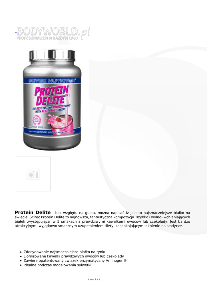 Protein Delite - bez względu na gusta, można napisać iż jest to najsmaczniejsze białko na świecie. Scitec Protein Delite to najnowsza, fantastyczna kompozycja szybko i wolno- wchłaniających białek ,występująca w 5 smakach z prawdziwymi kawałkami owoców lub czekolady. Jest bardzo atrakcyjnym, wyjątkowo smacznym uzupełnieniem diety, zaspokajającym łaknienie na słodycze. Zdecydowanie najsmaczniejsze białko na rynku Liofilizowane kawalki prawdziwych owoców lub czekolady Zawiera opatentowany związek enzymatyczny Aminogen® Idealne podczas modelowania sylwetki Strona 1 z 2 Protein Delite zawiera doskonałej jakości proteiny niezbędne do zachowania zdrowego i młodego ciała. Scitec stworzył najlepiej smakujące białko bogate w aminokwasy BCAA i zawierające opatentowany związek enzymatyczny Aminogen®, który jest odpowiedzialny za maksymalne wchłanianie i wykorzystanie protein. Scitec Nutrtion Protein Delite zawiera prawdziwe liofilizowane kawałki owców. Liofilizacja polega na natychmiastowym zamrożeniu i wysuszeniu owoców, dzięki czemu zachowują one wszystkie wartościowe składniki oraz co ważne smakują dokładnie tak samo jak świeże. Dzięki temu każdy koktajl sporzadzony z protein delite smakuje jak prawdziwy wyborny deser. Podczas odchudzania i uciążliwej diety, nadal możesz rokoszować się niezapomnianym smakiem ulubionej potrawy – słodyczy ! Protein Delite zaspokoi Twój apetyt na słodycze bez ryzyka obrośnięcia tłuszczem, pomagając Ci jednocześnie zdobyć zdrową, smukłą sylwetkę. Każdy ze smaków Protein Delite zawiera kawałki prawdziwych owoców lub czekolady. Źródłem białka jest kombinacja najwyższej jakości, wolno i szybko wchłanianych białek. Białka Budowa masy 2 Profil Aminokwasowy 3 Redukcja tłuszczu 4 Regeneracja 3 Rozpuszczalność 4 Smak 5 Strona 2 z 2