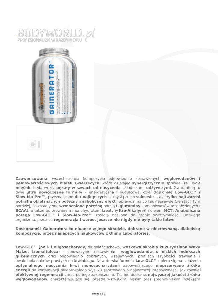Zaawansowana, wszechstronna kompozycja odpowiednio zestawionych węglowodanów i pełnowartościowych białek zwierzęcych, które działając synergistycznie sprawią, że Twoje mięśnie będą wręcz pękały w szwach od nasycenia składnikami odżywczymi. Gwarantują to dwie ultra nowoczesne formuły – energetyczna i budulcowa, czyli doskonałe Low-GLC™ i Slow-Mo-Pro™, przeznaczone dla najlepszych, z myślą o ich sukcesie… ale tylko najtwardsi potrafią okiełznać ich potężny anaboliczny efekt . Sprawdź, na co tak naprawdę Cię stać! Tym bardziej, że zostały one wzmocnione potężną porcją L-glutaminy i aminokwasów rozgałęzionych ( BCAA), a także buforowanym monohydratem kreatyny Kre-Alkalyn® i olejem MCT. Anaboliczna potęga Low-GLC™ i Slow-Mo-Pro™ została nasilona do granic wytrzymałości ludzkiego organizmu, przez co regeneracja i wzrost jeszcze nie nigdy nie były takie łatwe. Doskonałość Gaineratora to niuanse w jego składzie, dobrane w niezrównaną, diabelską kompozycję, przez najlepszych naukowców z Olimp Laboratories. Low-GLC™ (poli- i oligosacharydy, długołańcuchowa, woskowa skrobia kukurydziana Waxy Maize, izomaltuloza) - innowacyjne zestawienie węglowodanów o niskich indeksach glikemicznych oraz odpowiednio dobranych, wzajemnych, profilach szybkości trawienia i uwalniania cukrów prostych do krwiobiegu. Nowatorska formuła Low-GLC™ opiera się na założeniu optymalnego nasycenia krwi monosacharydami zapewniającego nieprzerwane źródło energii do kontynuacji długotrwałego wysiłku sportowego o najwyższej intensywności, jak również efektywnej regeneracji zaraz po jego zakończeniu. Trafnie dobrane, najwyższej jakości źródła węglowodanów, charakteryzujące się, przede wszystkim, niskim oraz średnio-niskim indeksem Strona 1 z 3 glikemicznym, stężenia zapewniają insuliny we krwi utrzymanie na optyma poziomie. Chroni to ćwiczącego przed spadkiem motywacji do treningu w trakcie jego trwania, nieprzerwanie dostarczając energii do wysiłku na jego najwyższym poziomie. Zapobiega również zmniejszaniu wrażliwości receptora insulinowego na ten hormon, co może mieć miejsce w przypadku podaży dużej ilości cukrów prostych. Węglowodany wchodzące w skład formuły Low-GLC™ stanowią niesłabnące źródło energii już po 30 minutach od chwili przyjęcia (poli- i oligosacharydy), aż do prawie 4 godzin (długołańcuchowa, woskowa skrobia kukurydziana Waxy Maize i izomaltuloza). Zapewnia to nadkompensację składników odżywczych już w chwilę po zakończeniu treningu, maksymalizując procesy odbudowy składników energetycznych. Dodatek oleju MCT i pionierskiego w swej przyswajalności, opatentowanego, buforowanego monohydratu kreatyny (Kre-Alkalyn®), ma na celu intensyfikację i skrócenie do minimum czasu trwania fazy regeneracyjnej, tak, aby następujący po treningu wzrost i adaptacja obciążanej tkanki mięśniowej mogła się odbywać bez dalszych przeszkód. Siła i piękno doskonałości doboru źródeł białek to Slow-Mo-Pro™ (kazeina micelarna, koncentrat białek serwatkowych, izolat białek serwatkowych, albuminy białka jaja, hydrolizat białek serwatkowych). Nie możesz sobie tego podarować - sprawdź jak działa zaklęta w Slow-Mo-Pro™ moc! Tym bardziej, że formuła została skomponowana w oparciu o najnowsze badania naukowe i tworzy kompleks różnych źródeł białka, z których każde charakteryzuje sięodmienną kinetyką szybkości trawienia i uwalniania aminokwasów do krwiobiegu. Ten doskonały blend proteinowy zapewnia najwyższe nasycenie krwi białkowymi produktami trawienia już w 15 minut od chwili jego podania (hydrolizat białek serwatkowych) i na wysokim, stabilnym poziomie utrzymuje ten stan przez 6 kolejnych godzin (koncentrat białek serwatkowych, izolat białek serwatkowych, albuminy białka jaja, kazeina micelarna). Skrupulatnie dobrane ilości i rodzaje źródeł białka, użyte w formule Slow-Mo-Pro™ gwarantują najbardziej pożądany, dla regeneracji mięśni, profil aminokwasowy. Jest on szczególnie bogaty w aminokwasy rozgałęzione oraz 8 niezbędnych aminokwasów do prawidłowego wzrostu i regeneracji, które w ogromnych ilościach uwalniane są w trakcie przyswajania Slow-Mo-Pro™. Gwarantuje to utrzymanie najwyższego efektu antykatabolicznego, zarówno w trakcie intensywnego wysiłku, jak i zaraz po nim. W tak sprzyjających warunkach fizjologicznych potreningowa regeneracja będzie zachodziła z najwyższą wydajnością. Ale to nie wszystko, co Slow-Mo-Pro™ oferuje. Izolat białek serwatki i micelarna kazeina dodatkowo będą ujawniały swój wysoki potencjał w intensyfikacji procesów lipolizy, czyniąc Twoją sylwetkę bardziej odtłuszczoną. Katabolizm Ci nie grozi, bo jest Slow-Mo-Pro™ i…BCAA… i L-glutamina! Dodatkowo, ponad 4 g wolnych aminokwasów rozgałęzionych (BCAA) na porcję uzbrojonych ponad 3,5 g najwyższej jakości L-glutaminy , gwarantuje osiągnięcie, w każdej komórce mięśni szkieletowych sportowca, wysoko sparametryzowanego środowiska antykatabolicznego, stojącego na straży integralności metabolicznej każdego, porażanego katatonicznym treningiem włókienka mięśniowego. Od chwili pojawienia się Gaineratora™ nawet najdłuższe i najbardziej mordercze sesje treningowe nie wpędzą Cię w katabolizm. Kompleks aż 12 witamin dodany do Gaineratora stoi na straży efektywności pracy wszystkich enzymów biorących udział w przemianach metabolicznych zaprzęgniętychw regenerację i wzrost tkanki mięśniowej. Witaminy i minerały muszą być bezwzględnie uzupełniane, gdyż ich straty w trakcie intensywnych sesji wysiłkowych są ogromne, a to znacznie upośledza jakość wszystkich przemian biochemicznych zachodzących w ciele sportowca. Nie możesz sobie na to pozwolić! Dostarczanie wyselekcjonowanych w Gaineratorze™ witamin gwarantuje intensyfikację Strona 2 z 3 efektu wynikającego z obecnoś