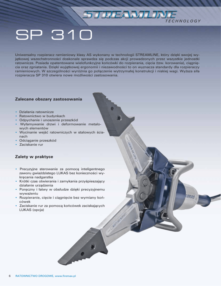 TECHNOLOGY SP 310 Uniwersalny rozpieracz ramieniowy klasy AS wykonany w technologii STREAMLINE, który dzięki swojej wyjątkowej wszechstronności doskonale sprawdza się podczas akcji prowadzonych przez wszystkie jednostki ratownicze. Posiada opatentowane wielofunkcyjne końcówki do rozpierania, cięcia (tzw. korowania), ciągnięcia oraz zgniatania. Dzięki wyjątkowej ergonomii i niezawodności to on wyznacza standardy dla rozpieraczy ramieniowych. W szczególności wyróżnia go połączenie wytrzymałej konstrukcji i niskiej wagi. Wyższa siła rozpieracza SP 310 otwiera nowe możliwości zastosowania. Zalecane obszary zastosowania • Działania ratownicze • Ratownictwo w budynkach • Odpychanie i unoszenie przeszkód • Wyłamywanie drzwi i deformowanie metalo- wych elementów • Wycinanie wejść ratowniczych w stalowych ścia- nach • Odciąganie przeszkód • Zaciskanie rur Zalety w praktyce • Precyzyjne sterowanie za pomocą inteligentnego • • • • 6 zaworu gwiaździstego LUKAS bez konieczności wykręcania nadgarstka Krótki czas otwierania i zamykania przyśpieszający działanie urządzenia Poręczny i łatwy w obsłudze dzięki precyzyjnemu wyważeniu Rozpieranie, cięcie i ciągnięcie bez wymiany końcówek Zaciskanie rur za pomocą końcówek zaciskających LUKAS (opcja) RATOWNICTWO DROGOWE, www.firemax.pl Rozpieracze TECHNOLOGY SP 310 Dane techniczne Osprzęt Nr katalogowy 171010000 Max siła rozpierania Rozwarcie ramion Waga 13,0 kg 84150/9126 122 kN Siła ciągnięcia (punkt R2) 51 kN Siła ciągnięcia (zgodnie z PN EN 13204) 40 kN Waga Zestaw łańcuchów do szybkiego montażu KSS 20 Nr katalogowy 46 kN 720 mm Siła ściskania (nakładki zaciskające) Wymiary: D x S x W Waga 13,3 kg 84150/9130 256 kN Siła rozpierania (zgodnie z PN EN 13204) Pojemność oleju Zestaw łańcuchów KSV 11 Nr katalogowy 243 cm3 790 x 300 x 180 mm 19,6 kg Końcówka zapasowa Nr katalogowy Waga 1,1 kg V 84150/0540-17 Agregaty zasilające: P 600, P 610, P 620 P 640, P660 Nakładki zaciskające Nr katalogowy Waga 1,2 kg 84150/9150 7