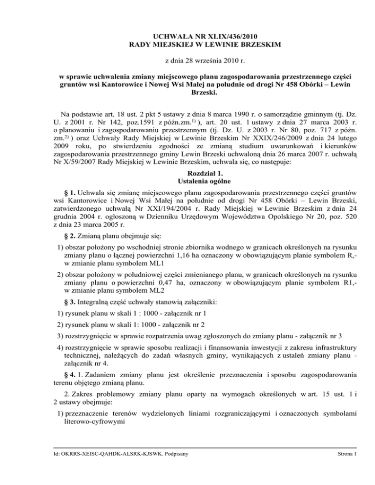 UCHWAŁA NR XLIX/436/2010 RADY MIEJSKIEJ W LEWINIE BRZESKIM z dnia 28 września 2010 r. w sprawie uchwalenia zmiany miejscowego planu zagospodarowania przestrzennego części gruntów wsi Kantorowice i Nowej Wsi Małej na południe od drogi Nr 458 Obórki – Lewin Brzeski. Na podstawie art. 18 ust. 2 pkt 5 ustawy z dnia 8 marca 1990 r. o samorządzie gminnym (tj. Dz. U. z 2001 r. Nr 142, poz.1591 z późn.zm.1) ), art. 20 ust. 1 ustawy z dnia 27 marca 2003 r. o planowaniu i zagospodarowaniu przestrzennym (tj. Dz. U. z 2003 r. Nr 80, poz. 717 z póżn. zm.2) ) oraz Uchwały Rady Miejskiej w Lewinie Brzeskim Nr XXIX/246/2009 z dnia 24 lutego 2009 roku, po stwierdzeniu zgodności ze zmianą studium uwarunkowań i kierunków zagospodarowania przestrzennego gminy Lewin Brzeski uchwaloną dnia 26 marca 2007 r. uchwałą Nr X/59/2007 Rady Miejskiej w Lewinie Brzeskim, uchwala się, co następuje: Rozdział 1. Ustalenia ogólne § 1. Uchwala się zmianę miejscowego planu zagospodarowania przestrzennego części gruntów wsi Kantorowice i Nowej Wsi Małej na południe od drogi Nr 458 Obórki – Lewin Brzeski, zatwierdzonego uchwałą Nr XXI/194/2004 r. Rady Miejskiej w Lewinie Brzeskim z dnia 24 grudnia 2004 r. ogłoszoną w Dzienniku Urzędowym Województwa Opolskiego Nr 20, poz. 520 z dnia 23 marca 2005 r. § 2. Zmianą planu obejmuje się: 1) obszar położony po wschodniej stronie zbiornika wodnego w granicach określonych na rysunku zmiany planu o łącznej powierzchni 1,16 ha oznaczony w obowiązującym planie symbolem R,w zmianie planu symbolem ML1 2) obszar położony w południowej części zmienianego planu, w granicach określonych na rysunku zmiany planu o powierzchni 0,47 ha, oznaczony w obowiązującym planie symbolem R1,w zmianie planu symbolem ML2 § 3. Integralną część uchwały stanowią załączniki: 1) rysunek planu w skali 1 : 1000 - załącznik nr 1 2) rysunek planu w skali 1: 1000 - załącznik nr 2 3) rozstrzygnięcie w sprawie rozpatrzenia uwag zgłoszonych do zmiany planu - załącznik nr 3 4) rozstrzygnięcie w sprawie sposobu realizacji i finansowania inwestycji z zakresu infrastruktury technicznej, należących do zadań własnych gminy, wynikających z ustaleń zmiany planu załącznik nr 4. § 4. 1. Zadaniem zmiany planu jest określenie przeznaczenia i sposobu zagospodarowania terenu objętego zmianą planu. 2. Zakres problemowy zmiany planu oparty na wymogach określonych w art. 15 ust. 1 i 2 ustawy obejmuje: 1) przeznaczenie terenów wydzielonych liniami rozgraniczającymi i oznaczonych symbolami literowo-cyfrowymi Id: OKRRS-XEISC-QAHDK-ALSRK-KJSWK. Podpisany Strona 1 2) zasady zabudowy, zagospodarowania i kształtowania ładu przestrzennego, określone poprzez parametry, wskaźniki urbanistyczno-architektoniczne, w tym linie zabudowy, gabaryty obiektów, wskaźniki intensywności zabudowy 3) zasady ochrony środowiska, przyrody i krajobrazu kulturowego 4) zasady obsługi komunikacyjnej i wyposażenia w infrastrukturę techniczną 5) stawki procentowe, na podstawie których ustala się opłatę, o której mowa w art. 36 ust. 4 ustawy. 3. Na obszarze objętym zmianą planu nie występują elementy stanowiące problematykę pozostałych pozycji określonych w § 15 ust.2 i 3 ustawy, w tym zasad kształtowania przestrzeni publicznej, w związku z czym nie są ujęte w ustaleniach zmiany planu. § 5. Obowiązującymi ustaleniami na rysunkach planu są: . 1) granice terenu objętego zmianą planu 2) linie rozgraniczające tereny o różnym przeznaczeniu oraz symbole literowe określające przeznaczenie terenu 3) linie zabudowy nieprzekraczalne 4) zasady obsługi komunikacyjnej . § 6. Na obszarze objętym planem występują użytki rolne III klasy bonitacyjnej o powierzchni 0,5980 ha w związku z czym zachodzi potrzeba uzyskania zgody na zmianę przeznaczenia gruntów rolnych na cele nierolnicze w trybie obowiązujących przepisów. § 7. Treść uchwały ujęta została w czterech rozdziałach: 1) Rozdział 1 Przepisy ogólne 2) Rozdział 2 Ustalenia szczegółowe dotyczące przeznaczenia i zagospodarowania terenu oraz kształtowania ładu przestrzennego 3) Rozdział 3 Ustalenia z zakresu ochrony środowiska, obsługi komunikacyjnej i infrastruktury technicznej 4) Rozdział 4 Przepisy końcowe § 8. 1. Przyjęte w uchwale pojęcia, nazwy i określenia należy rozumieć następująco: 1) teren - obszar funkcjonalny wyznaczony liniami rozgraniczającymi 2) działka letniskowa - nieruchomość gruntowa lub działka gruntu, której wielkość, cechy geometryczne, dostęp do drogi publicznej i urządzeń infrastruktury technicznej spełniają wymogi realizacji obiektów budowlanych, wynikające z odrębnych przepisów i aktów prawa miejscowego. 3) przeznaczenie podstawowe lub funkcja podstawowa przeznaczenie, które przeważa na terenie wydzielonym liniami rozgraniczającymi, oznaczone symbolem literowym 4) przeznaczenie uzupełniające - przeznaczenie wzbogacające funkcję podstawową, w tym obiekty i urządzenia małej architektury, placyki zabaw . 5) urządzenia towarzyszące - zagospodarowanie towarzyszące funkcji podstawowej, takie jak: zaplecze parkingowo-garażowe, obiekty gospodarcze związane z podstawową funkcją terenu 6) linie rozgraniczające obowiązujące - linie oznaczające obowiązujące przeznaczenie terenu 7) linie rozgraniczające orientacyjne - linie określające przeznaczenie terenu możliwe do ostatecznego sprecyzowania na etapie realizacji ustaleń planu Id: OKRRS-XEISC-QAHDK-ALSRK-KJSWK. Podpisany Strona 2 8) linie podziału wewnętrznego - linie podziału terenu o tym samym przeznaczeniu - orientacyjne, o charakterze postulatywnym, nie obowiązującym 9) linie zabudowy nieprzekraczalne - linie zamykające obszar, na którym dopuszcza się wznoszenie budynków i budowli nadziemnych nie będących liniami przesyłowymi, sieciami uzbrojenia terenu i związanymi z nimi urządzeniami. Podstawę odniesienia stanowi obrys zewnętrzny rzutu b