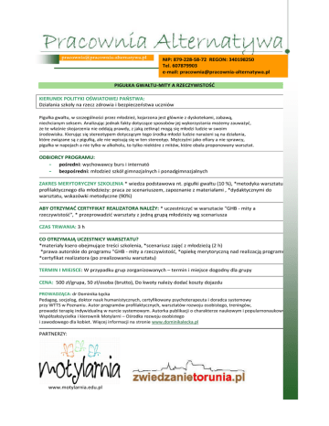 NIP: 879-228-58-72 REGON: 340198250 Tel. 607879903 e-mail: [email protected] PIGUŁKA GWAŁTU-MITY A RZECZYWISTOŚĆ KIERUNEK POLITYKI OŚWIATOWEJ PAŃSTWA: Działania szkoły na rzecz zdrowia i bezpieczeństwa uczniów Pigułka gwałtu, w szczególności przez młodzież, kojarzona jest głównie z dyskotekami, zabawą, niechcianym seksem. Analizując jednak fakty dotyczące sposobów jej wykorzystania możemy zauważyć, że te właśnie skojarzenia nie oddają prawdy, z jaką zetknąć mogą się młodzi ludzie w swoim środowisku. Kierując się stereotypem dotyczącym tego środka młodzi ludzie narażeni są na działania, które związane są z pigułką, ale nie wpisują się w ten stereotyp. Mężczyźni jako ofiary a nie sprawcy, pigułka w napojach a nie tylko w alkoholu, to tylko niektóre z mitów, które obala proponowany warsztat. ODBIORCY PROGRAMU: - pośredni: wychowawcy burs i internató - bezpośredni: młodzież szkół gimnazjalnych i ponadgimnazjalnych ZAKRES MERYTORYCZNY SZKOLENIA * wiedza podstawowa nt. pigułki gwałtu (10 %), *metodyka warsztatu profilaktycznego dla młodzieży: praca ze scenariuszem, zapoznanie z materiałami , *dydaktycznymi do warsztatu, wskazówki metodyczne (90%) ABY OTRZYMAĆ CERTYFIKAT REALIZATORA NALEŻY: * uczestniczyć w warsztacie "GHB - mity a rzeczywistość", * przeprowadzić warsztaty z jedną grupą młodzieży wg scenariusza CZAS TRWANIA: 3 h CO OTRZYMAJĄ UCZESTNICY WARSZTATU? *materiały ksero obejmujące treści szkolenia, *scenariusz zajęć z młodzieżą (2 h) *prawa autorskie do programu "GHB - mity a rzeczywistość, *opiekę merytoryczną nad realizacją programu, *certyfikat realizatora (po zrealizowaniu warsztatu) TERMIN I MIEJSCE: W przypadku grup zorganizowanych – termin i miejsce dogodny dla grupy CENA: 500 zł/grupa, 50 zł/osoba (brutto), Do kwoty należy dodać koszty dojazdu PROWADZĄCA: dr Dominika Łęcka Pedagog, socjolog, doktor nauk humanistycznych, certyfikowany psychoterapeuta i doradca systemowy przy WTTS w Poznaniu. Autor programów profilaktycznych, warsztatów rozwoju osobistego, treningów, prowadzi terapię indywidualną w nurcie systemowym. Autorka publikacji o charakterze naukowym i popularnonaukowym. Współzałożycielka i kierownik Motylarni – Ośrodka rozwoju osobistego i zawodowego dla kobiet. Więcej informacji na stronie www.dominikalecka.pl PARTNERZY: www.motylarnia.edu.pl