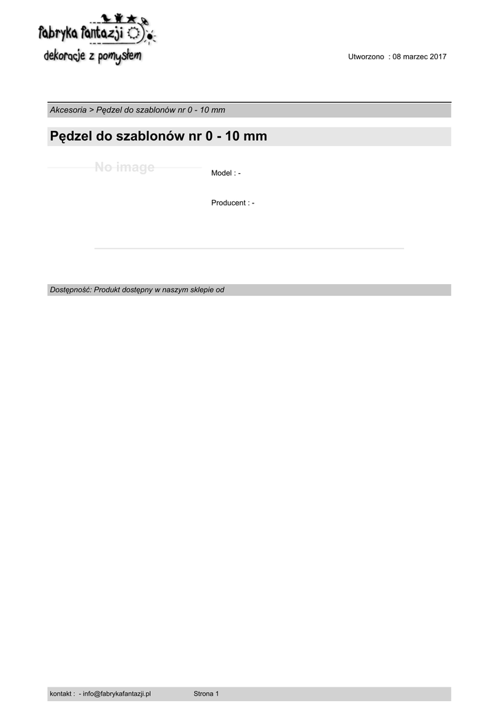 Utworzono : 08 marzec 2017 Akcesoria > Pędzel do szablonów nr 0 - 10 mm Pędzel do szablonów nr 0 - 10 mm No image Model : - Producent : - Dostępność: Produkt dostępny w naszym sklepie od kontakt : - [email protected] Strona 1
