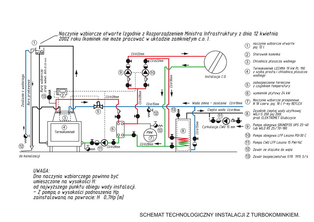 Naczynie wzbiorcze otwarte (zgodnie z Rozporządzeniem Ministra Infrastruktury z dnia 12 kwietnia 2002 roku (kominek nie może pracować w układzie zamkniętym c.o. ). 1 1 naczynie wzbiorcze otwarte poj. 12 l 2 Sterownik kominka CU Ø 22mm 3 Chłodnica płaszcza wodnego 10 4 Termokominek LECHMA 19 kW PL 190 z szybą prostą i chłodnicą płaszcza wodnego 5 zabezpieczenie termiczne z czujnikiem temperatury 6 wymiennik płytowy 24 kW 7 Naczynie wzborcze przeponowe N 18 czerw. poj. 18 l f-my REFLEX 8 Zasobnik ciepłej wody użytkowej WGJ-S 200 poj 200l prod. ELEKTROMET Głubczyce 9 Pompa obiegowa GRUNDFOS UPS 25-40 lub WILO RS 25/70-180 CU Ø 28mm 3 Termokominek PNW 7 12 11 13 12 6 CU Ø 28mm do kanalizacji Woda zimna - zasilanie CU Ø 15mm 5 4 Instalacja C.O. CU Ø 28mm CU Ø 18mm Ciepła woda CU Ø 18mm 11 12 8 CU Ø 15mm 2 CU Ø 28mm 13 9 CU Ø 18mm Rura wzbiorcza śred. wewn. min.Ø 25 mm Rura przelewowa Zasilanie z wodociągu CU Ø 22mm Cyrkulacja CWU 15 mm 10 Pompa obiegowa LFP Leszno POr30 C 11 Pompa CWU LFP Leszno 15 PWr14C 12 Zawór ze złączka do węża 13 Zawór bezpieczeństwa SYR 1915 3/4” ” UWAGA: Dno naczynia wzbiorczego powinno być umieszczone na wysokości H: od najwyższego punktu obiegu wody instalacji. - Z pompą o wysokości podnoszenia Hp zainstalowaną na powrocie: H≤ 0,7Hp [m] SCHEMAT TECHNOLOGICZNY IINSTALACJI Z TURBOKOMINKIEM.