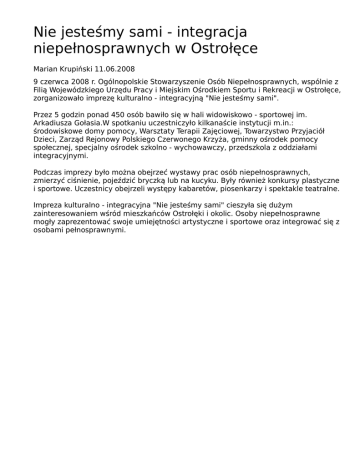 Nie jesteśmy sami - integracja niepełnosprawnych w Ostrołęce Marian Krupiński 11.06.2008 9 czerwca 2008 r. Ogólnopolskie Stowarzyszenie Osób Niepełnosprawnych, wspólnie z Filią Wojewódzkiego Urzędu Pracy i Miejskim Ośrodkiem Sportu i Rekreacji w Ostrołęce, zorganizowało imprezę kulturalno - integracyjną "Nie jesteśmy sami". Przez 5 godzin ponad 450 osób bawiło się w hali widowiskowo - sportowej im. Arkadiusza Gołasia.W spotkaniu uczestniczyło kilkanaście instytucji m.in.: środowiskowe domy pomocy, Warsztaty Terapii Zajęciowej, Towarzystwo Przyjaciół Dzieci, Zarząd Rejonowy Polskiego Czerwonego Krzyża, gminny ośrodek pomocy społecznej, specjalny ośrodek szkolno - wychowawczy, przedszkola z oddziałami integracyjnymi. Podczas imprezy było można obejrzeć wystawy prac osób niepełnosprawnych, zmierzyć ciśnienie, pojeździć bryczką lub na kucyku. Były również konkursy plastyczne i sportowe. Uczestnicy obejrzeli występy kabaretów, piosenkarzy i spektakle teatralne. Impreza kulturalno - integracyjna "Nie jesteśmy sami" cieszyła się dużym zainteresowaniem wśród mieszkańców Ostrołęki i okolic. Osoby niepełnosprawne mogły zaprezentować swoje umiejętności artystyczne i sportowe oraz integrować się z osobami pełnosprawnymi.