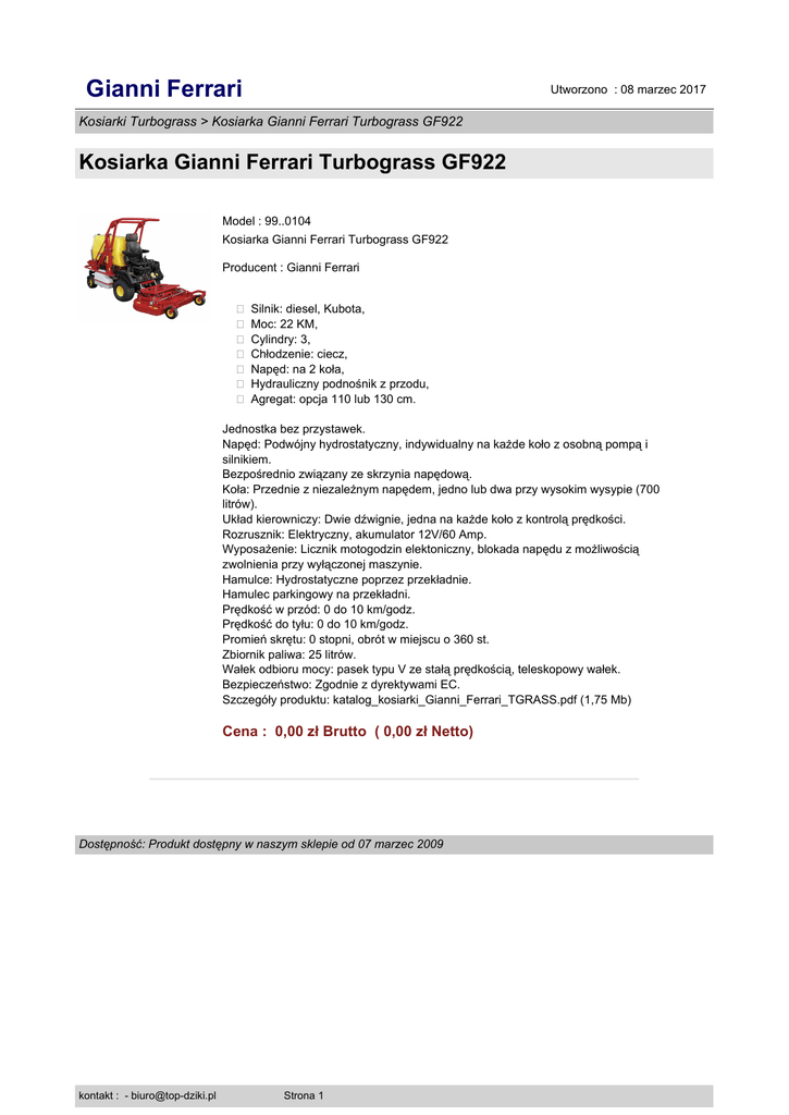 Gianni Ferrari Utworzono : 08 marzec 2017 Kosiarki Turbograss > Kosiarka Gianni Ferrari Turbograss GF922 Kosiarka Gianni Ferrari Turbograss GF922 Model : 99..0104 Kosiarka Gianni Ferrari Turbograss GF922 Producent : Gianni Ferrari � Silnik: diesel, Kubota, � Moc: 22 KM, � Cylindry: 3, � Chłodzenie: ciecz, � Napęd: na 2 koła, � Hydrauliczny podnośnik z przodu, � Agregat: opcja 110 lub 130 cm. Jednostka bez przystawek. Napęd: Podwójny hydrostatyczny, indywidualny na każde koło z osobną pompą i silnikiem. Bezpośrednio związany ze skrzynia napędową. Koła: Przednie z niezależnym napędem, jedno lub dwa przy wysokim wysypie (700 litrów). Układ kierowniczy: Dwie dźwignie, jedna na każde koło z kontrolą prędkości. Rozrusznik: Elektryczny, akumulator 12V/60 Amp. Wyposażenie: Licznik motogodzin elektoniczny, blokada napędu z możliwością zwolnienia przy wyłączonej maszynie. Hamulce: Hydrostatyczne poprzez przekładnie. Hamulec parkingowy na przekładni. Prędkość w przód: 0 do 10 km/godz. Prędkość do tyłu: 0 do 10 km/godz. Promień skrętu: 0 stopni, obrót w miejscu o 360 st. Zbiornik paliwa: 25 litrów. Wałek odbioru mocy: pasek typu V ze stałą prędkością, teleskopowy wałek. Bezpieczeństwo: Zgodnie z dyrektywami EC. Szczegóły produktu: katalog_kosiarki_Gianni_Ferrari_TGRASS.pdf (1,75 Mb) Cena : 0,00 zł Brutto ( 0,00 zł Netto) Dostępność: Produkt dostępny w naszym sklepie od 07 marzec 2009 kontakt : - [email protected] Strona 1