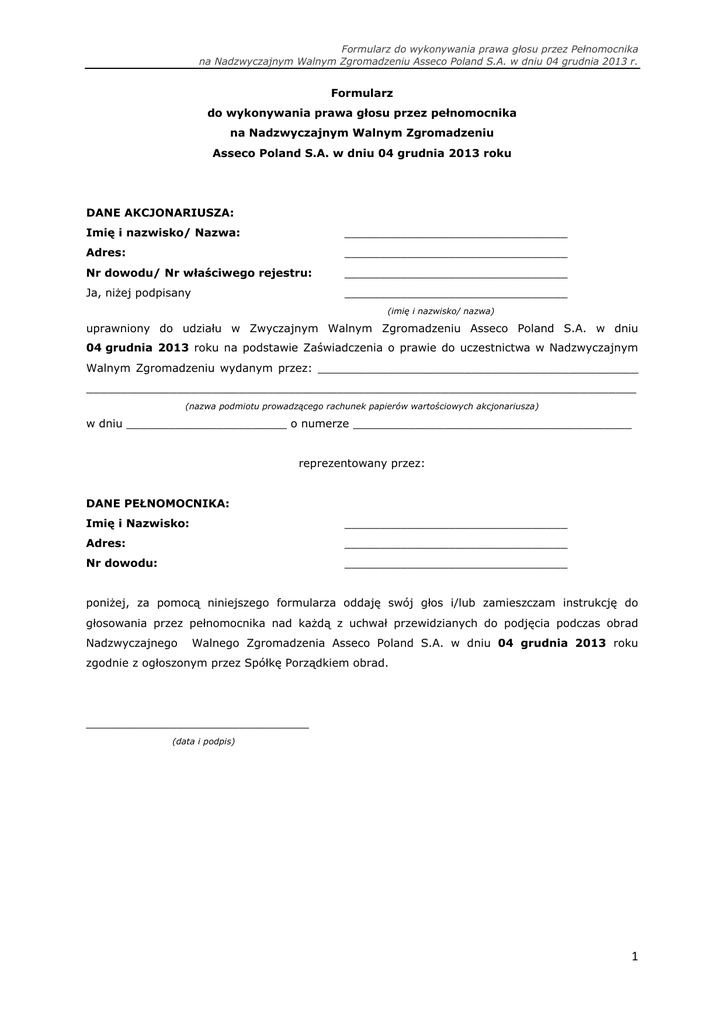 Formularz do wykonywania prawa głosu przez Pełnomocnika na Nadzwyczajnym Walnym Zgromadzeniu Asseco Poland S.A. w dniu 04 grudnia 2013 r. Formularz do wykonywania prawa głosu przez pełnomocnika na Nadzwyczajnym Walnym Zgromadzeniu Asseco Poland S.A. w dniu 04 grudnia 2013 roku DANE AKCJONARIUSZA: Imię i nazwisko/ Nazwa: ________________________________ Adres: ________________________________ Nr dowodu/ Nr właściwego rejestru: ________________________________ Ja, niżej podpisany ________________________________ (imię i nazwisko/ nazwa) uprawniony do udziału w Zwyczajnym Walnym Zgromadzeniu Asseco Poland S.A. w dniu 04 grudnia 2013 roku na podstawie Zaświadczenia o prawie do uczestnictwa w Nadzwyczajnym Walnym Zgromadzeniu wydanym przez: ______________________________________________ _______________________________________________________________________________ (nazwa podmiotu prowadzącego rachunek papierów wartościowych akcjonariusza) w dniu _______________________ o numerze ________________________________________ reprezentowany przez: DANE PEŁNOMOCNIKA: Imię i Nazwisko: ________________________________ Adres: ________________________________ Nr dowodu: ________________________________ poniżej, za pomocą niniejszego formularza oddaję swój głos i/lub zamieszczam instrukcję do głosowania przez pełnomocnika nad każdą z uchwał przewidzianych do podjęcia podczas obrad Nadzwyczajnego Walnego Zgromadzenia Asseco Poland S.A. w dniu 04 grudnia 2013 roku zgodnie z ogłoszonym przez Spółkę Porządkiem obrad. ________________________________ (data i podpis) 1 Formularz do wykonywania prawa głosu przez Pełnomocnika na Nadzwyczajnym Walnym Zgromadzeniu Asseco Poland S.A. w dniu 04 grudnia 2013 r. UCHWAŁA nr 1 Nadzwyczajnego Walnego Zgromadzenia spółki Asseco Poland Spółka Akcyjna z dnia 04 grudnia 2013 r. w sprawie: wyboru Przewodniczącego Walnego Zgromadzenia Głosowanie: Za _____________________ (ilość głosów) Przeciw _____________________ (ilość głosów) Wstrzymuję się _____________________ (ilość głosów) W przypadku głosowania przeciwko uchwale nr 1, Akcjonariusz może poniżej wyrazić sprzeciw z prośbą o wpisanie do protokołu. Treść sprzeciwu*: ______________________________________________________________________ Instrukcje dotyczące sposobu głosowania przez pełnomocnika w sprawie podjęcia uchwały nr 1. Treść instrukcji*: ______________________________________________________________________ _____________________ (podpis Akcjonariusza) * w przypadku nie wyrażania sprzeciwu/braku instrukcji, miejsca wykropkowane należy przekreślić. UCHWAŁA nr 2 Nadzwyczajnego Walnego Zgromadzenia spółki Asseco Poland Spółka Akcyjna z dnia 04 grudnia 2013 r. w sprawie: wyboru Komisji Skrutacyjnej Głosowanie: Za _____________________ (ilość głosów) Przeciw _____________________ (ilość głosów) Wstrzymuję się _____________________ (ilość głosów) W przypadku głosowania przeciwko uchwale nr 2, Akcjonariusz może poniżej wyrazić sprzeciw z prośbą o wpisanie do protokołu. Treść sprzeciwu*: ______________________________________________________________________ Instrukcje dotyczące sposobu głosowania przez pełnomocnika w sprawie podjęcia uchwały nr 2. Treść instrukcji*: ______________________________________________________________________ _____________________ (podpis Akcjonariusza) * w przypadku nie wyrażania sprzeciwu/braku instrukcji, miejsca wykropkowane należy przekreślić. 2 Formularz do wykonywania prawa głosu przez Pełnomocnika na Nadzwyczajnym Walnym Zgromadzeniu Asseco Poland S.A. w dniu 04 grudnia 2013 r. UCHWAŁA nr 3 Nadzwyczajnego Walnego Zgromadzenia spółki Asseco Poland Spółka Akcyjna z dnia 04 grudnia 2013 r. w sprawie: przyjęcia porządku obrad Nadzwyczajnego Walnego Zgromadzenia Głosowanie: Za _____________________ (ilość głosów) Przeciw _____________________ (ilość głosów) Wstrzymuję się _____________________ (ilość głosów) W przypadku głosowania przeciwko uchwale nr 3, Akcjonariusz może poniżej wyrazić sprzeciw z prośbą o wpisanie do protokołu. Treść sprzeciwu*: ______________________________________________________________________ Instrukcje dotyczące sposobu głosowania przez pełnomocnika w sprawie podjęcia uchwały nr 3. Treść instrukcji*: ______________________________________________________________________ _____________________ (podpis Akcjonariusza) * w przypadku nie wyrażania sprzeciwu/braku instrukcji, miejsca wykropkowane należy przekreślić. UCHWAŁA nr 4 Nadzwyczajnego Walnego Zgromadzenia spółki Asseco Poland Spółka Akcyjna z dnia 04 grudnia 2013 r. w sprawie: połączenia Spółki Asseco Poland S.A. ze Spółką PRZEDSIĘBIORSTWO INNOWACYJNO-WDROŻENIOWE „POSTINFO” Sp. z o.o. Głosowanie: Za _____________________ (ilość głosów) Przeciw _____________________ (ilość głosów) Wstrzymuję się _____________________ (ilość głosów) W przypadku głosowania przeciwko uchwale nr 4, Akcjonariusz może poniżej wyrazić sprzeciw z prośbą o wpisanie do protokołu. Treść sprzeciwu*: ______________________________________________________________________ Instrukcje dotyczące sposobu głosowania przez pełnomocnika w sprawie podjęcia uchwały nr 4. Treść instrukcji*: ______________________________________________________________________ _____________________ (podpis Akcjonariusza) * w przypadku nie wyrażania sprzeciwu/braku instrukcji, miejsca wykropkowane należy przekreślić 3 Formularz do wykonywania prawa głosu przez Pełnomocnika na Nadzwyczajnym Walnym Zgromadzeniu Asseco Poland S.A. w dniu 04 grudnia 2013 r. UCHWAŁA nr 5 Nadzwyczajnego Walnego Zgromadzenia spółki Asseco Poland Spółka Akcyjna z dnia 04 grudnia 2013 r. w sprawie: ustalenia wynagrodzenia dla Członków Komitetu Audytu Rady Nadzorczej Asseco Poland S.A. Głosowanie: Za _____________________ (ilość głosów) Przeciw _____________________ (ilość głos