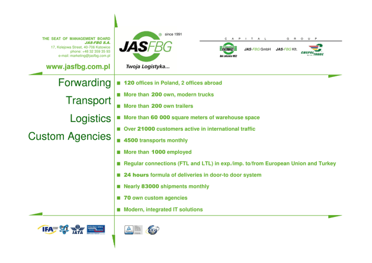 since 1991 THE SEAT OF MANAGEMENT BOARD C A P I T A L G R O U P JAS-FBG S.A. 17, Kolejowa Street, 40-706 Katowice phone: +48 32 359 35 93 e-mail: [email protected] JAS-FBG GmbH JAS-FBG Kft. www.jasfbg.com.pl Forwarding Transport Logistics Custom Agencies 120 offices in Poland, 2 offices abroad More than 200 own, modern trucks More than 200 own trailers More than 60 000 square meters of warehouse space Over 21000 customers active in international traffic 4500 transports monthly More than 1000 employed Regular connections (FTL and LTL) in exp./imp. to/from European Union and Turkey 24 hours formula of deliveries in door-to door system Nearly 83000 shipments monthly 70 own custom agencies Modern, integrated IT solutions since 1991 THE SEAT OF MANAGEMENT BOARD JAS-FBG S.A. 17, Kolejowa Street, 40-706 Katowice phone: +48 32 359 35 93 e-mail: [email protected] www.jasfbg.com.pl PAWŁOWICE WAREHOUSE 8, Krucza Street 43-251 Pawłowice phone: +48 32 473 82 82 fax: +48 32 473 82 82 e-mail: [email protected] Warehouse Manager Dominik Rygała phone: +48 32 473 82 82 fax: +48 32 473 82 82 mobile: +48 506 011 975 e-mail: [email protected] Booking of storage area Anita Polednia Logistics Vice Director mobile: +48 506 011 455 e-mail: [email protected] Mariusz Słowiński Logistics Project Coordinator phone: +48 32 723 33 06 mobile: +48 506 011 430 e-mail: [email protected] [email protected] since 1991 THE SEAT OF MANAGEMENT BOARD JAS-FBG S.A. 17, Kolejowa Street, 40-706 Katowice phone: +48 32 359 35 93 e-mail: [email protected] www.jasfbg.com.pl Offered services: Warehouse services - handling of pallets (unloading/loading); - storage of goods (incl. Cycle counting); - Value Added Services (picking); Additional Services are free of charge - entry of goods to the warehouse and making record list; - accounting in Qguar warehouse managing system; - goods flow and stocks reporting, Labeling Co-packing Co-manufacturing [email protected] since 1991 THE SEAT OF MANAGEMENT BOARD JAS-FBG S.A. 17, Kolejowa Street, 40-706 Katowice phone: +48 32 359 35 93 e-mail: [email protected] www.jasfbg.com.pl Characteristics of the Pawłowice platform: Warehouse total storage area 1 000 sq m Parcel area is 3,5 h – ability to store outside Working hours from 08.00 to 16.00 a day from Monday to Friday or other reconciliation Effective high storage up to 6 m QGUAR warehouse managing system EDI ability - for example with SAP System Possibility of using principal warehouse managing system Goods managing by FIFO, FEFO, LIFO, FILO and by the consignment number Warehouse insurance as well as the running shipments 24 hours a day surveillance and security [email protected] since 1991 THE SEAT OF MANAGEMENT BOARD JAS-FBG S.A. 17, Kolejowa Street, 40-706 Katowice phone: +48 32 359 35 93 e-mail: [email protected] www.jasfbg.com.pl Warehouse equipped with: smooth and dustless floor with resistance up to 5 ton per sq m warehouse dry maneuver yard professional warehouse crew forklifts accidents insurance [email protected] since 1991 THE SEAT OF MANAGEMENT BOARD JAS-FBG S.A. 17, Kolejowa Street, 40-706 Katowice phone: +48 32 359 35 93 e-mail: [email protected] www.jasfbg.com.pl Certyficates Certificate of TÜV Rheinland for establishing and applying quality management system according to ISO 9001:2000 Certificate of TÜV Rheinland for establishing and applying environmental management standards according to ISO 14001:2004 Certificate of TÜV Rheinland for establishing and applying food safety management standards according to ISO 22000:2005 Status of AEO - Authorized Economic Operator recognized by the member states of the European Union. Certificate of NATO Commercial and Government Entity Code NCAGE given by Military Center for Standardization, Quality Assurance and Codification Certificate of Good Company 2008 - Leaders of Corporate Social Responsibility Certificate of Transparent Company since 1991 THE SEAT OF MANAGEMENT BOARD JAS-FBG S.A. 17, Kolejowa Street, 40-706 Katowice phone: +48 32 359 35 93 e-mail: [email protected] www.jasfbg.com.pl PAWŁOWICE WAREHOUSE