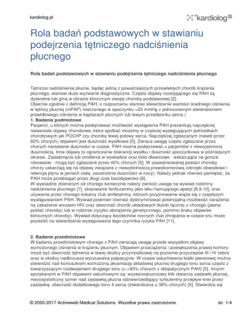 kardiolog.pl Rola badań podstawowych w stawianiu podejrzenia tętniczego nadciśnienia płucnego Rola badań podstawowych w stawianiu podejrzenia tętniczego nadciśnienia płucnego Tętnicze nadciśnienie płucne, będąc jedną z poważniejszych przewlekłych chorób krążenia płucnego, stanowi duże wyzwanie diagnostyczne. Często objawy rozwijającego się PAH są dyskretne lub giną w obrazie klinicznym swojej choroby podstawowej [2]. Obecnie zgodnie z definicją PAH, o rozpoznaniu stanowi stwierdzenie wartości średniego ciśnienia w tętnicy płucnej (mPAP) mierzonego w spoczynku >25 mmHg z jednoczesnym stwierdzeniem prawidłowego ciśnienia w kapilarach płucnych lub lewym przedsionku serca ( 1. Badanie podmiotowe Pacjenci, u których można podejrzewać możliwość wystąpienia PAH prezentują najczęściej nieswoiste objawy chorobowe, które spotkać możemy w częściej występujących jednostkach chorobowych jak POChP czy choroby lewej połowy serca. Najczęściej zgłaszanym (nawet przez 60% chorych) objawem jest duszność wysiłkowa [5]. Zwraca uwagę często zgłaszane przez chorych narastanie duszności w czasie. PAH można podejrzewać u pacjentów z niewyjaśniona dusznością. Inne objawy to ograniczenie tolerancji wysiłku i duszność spoczynkowa w późniejszym okresie. Zasłabnięcia lub omdlenia w wywiadzie oraz bóle dławicowe - wskazujące na gorsze rokowanie - mogą być zgłaszane przez 40% chorych [5]. W zaawansowanej postaci choroby chorzy uskarżają się na objawy związane z niewydolnością prawokomorową (obrzęki obwodowe i retencja płynu w jamach ciała, zaostrzenia duszności w nocy). Należy jednak również pamiętać, że PAH może przebiegać przez długi czas bezobjawowo [6]. W wywiadzie zbieranym od chorego koniecznie należy zwrócić uwagę na wywiad rodzinny nadciśnienia płucnego [7], stosowanie fenfluraminy jako leku hamującego apetyt [8,9,10], oraz używanie przez chorego kokainy i/lub amfetaminy, których przyjmowanie wiąże się z częstszym występowaniem PAH. Wywiad powinien również dyskryminować potencjalną możliwość narażenia na zakażenie wirusem HIV oraz obecność chorób układowych tkanki łącznej u chorego (jawna postać choroby) lub w rodzinie (ryzyko obciążenia genetycznego, pomimo braku objawów klinicznych choroby). Wywiad dotyczący bezdechów nocnych i/lub chrapania w czasie snu może pozwolić na stwierdzenie występowania tego czynnika ryzyka PAH [11]. 2. Badanie przedmiotowe W badaniu przedmiotowym chorego z PAH zwracają uwagę przede wszystkim objawy wzmożonego ciśnienia w krążeniu płucnym. Objawem przeciążenia i powiększenia prawej komory może być obecność tętnienia w lewej okolicy przymostkowej na poziomie przyczepów III i IV żebra oraz w okolicy nadbrzusza wyczuwalna palpacyjnie. W czasie osłuchiwania klatki piersiowej można stwierdzić nad koniuszkiem wzmożoną akcentację składowej płucnej drugiego tonu serca często z towarzyszącym rozdwojeniem drugiego tonu (u >90% chorych z idiopatycznym PAH) [5]. Innymi spotykanymi w PAH objawami osłuchowymi są: wczesnoskurczowy klik otwarcia zastawki płucnej, mezosystoliczny szmer nad zastawką płucna odzwierciedlający turbulentny przepływ krwi przez zastawkę, obecność dodatkowego tonu 4 serca (stwierdzana u 38% chorych) [5]. Stwierdza się © 2000-2017 Activeweb Medical Solutions. Wszelkie prawa zastrzeżone. str. 1/4 kardiolog.pl również obecność wysokiej fali ,,a" w zapisie tętna żylnego nad żyłami szyjnymi jako wykładnik wysokiego ciśnienia napełniania prawej komory serca. W okresie rozwiniętej niewydolności prawokomorowej mogą pojawić się: - sztywne rozdwojenie drugiego tonu serca, - wczesnorozkurczowy trzeci ton serca pochodzenia prawokomorowego (lepiej słyszalny w dolnej części mostka i głośniejszy we wdechu) stwierdzany u 23% chorych [5], - szmer holosystoliczny słyszalny w III i IV międzyżebrzu po stronie lewej, głośniejszy na wdechu wynikającego z poszerzenia pierścienia zastawki trójdzielnej przez rozstrzeń prawej komory - szmer rozkurczowy Grahama Steella słyszalny w II i III lewym międzyżebrzu jako wynik fali zwrotnej krwi przez poszerzony na skutek wysokiego ciśnienia w tętnicy płucnej pierścień zastawki tętnicy płucnej - obrzęki obwodowe (u 32% chorych) [5] i/lub retencja płynów w jamach ciała, - poszerzone żyły szyjne - refluks wątrobowo - szyjny - powiększenie wątroby z obecnością jej tętnienia (wyczuwalne w nadbrzuszu jako rozlane unoszenie) - podwyższone ciśnienie w żyłach szyjnych z uniesioną falą V tętna żylnego. Inne objawy, które spotkać możemy u chorych z PAH, są mniej swoiste. U niektórych chorych stwierdza się obniżenie ciśnienia tętniczego, obniżone ciśnienie tętna, oraz obecność zimnych części dystalnych kończyn górnych i dolnych. Są to objawy wskazujące na zmniejszony rzut serca oraz skurcz naczyń obwodowych [11]. W badaniu chorego należy również zwrócić uwagę na objawy chorób układowych tkanki łącznej a także na obecność ewentualnych śladów po wkłuciach, co mogłoby potencjalnie wskazywać na ryzyko stosowania środków odurzających lub/i narażenia na infekcję wirusem HIV. 3. Badania dodatkowe Przy planowaniu schematu diagnostycznego badań dodatkowych obowiązuje zasada stopniowania badań diagnostycznych. W badaniach przesiewowych [6] należy korzystać z metod mniej złożonych, mniej inwazyjnych, szerzej dostępnych i mniej kosztownych. Takie kryteria spełnia elektrokardiografia, rtg klatki piersiowej czy echokardiografia. W potwierdzaniu rozpoznania współczesna medycyna sięga po metody złożone, jak badanie układu krążenia rezonansem magentycznym z kontrastem [12] czy inwazyjne - jak cewnikowanie prawej połowy serca. Pośrednie miejsce zajmują metody diagnostyczne stosowane do oceny progresji choroby lub obiektywizacji poprawy stanu chorego na skutek leczenia, jak 6-cio minutowy 