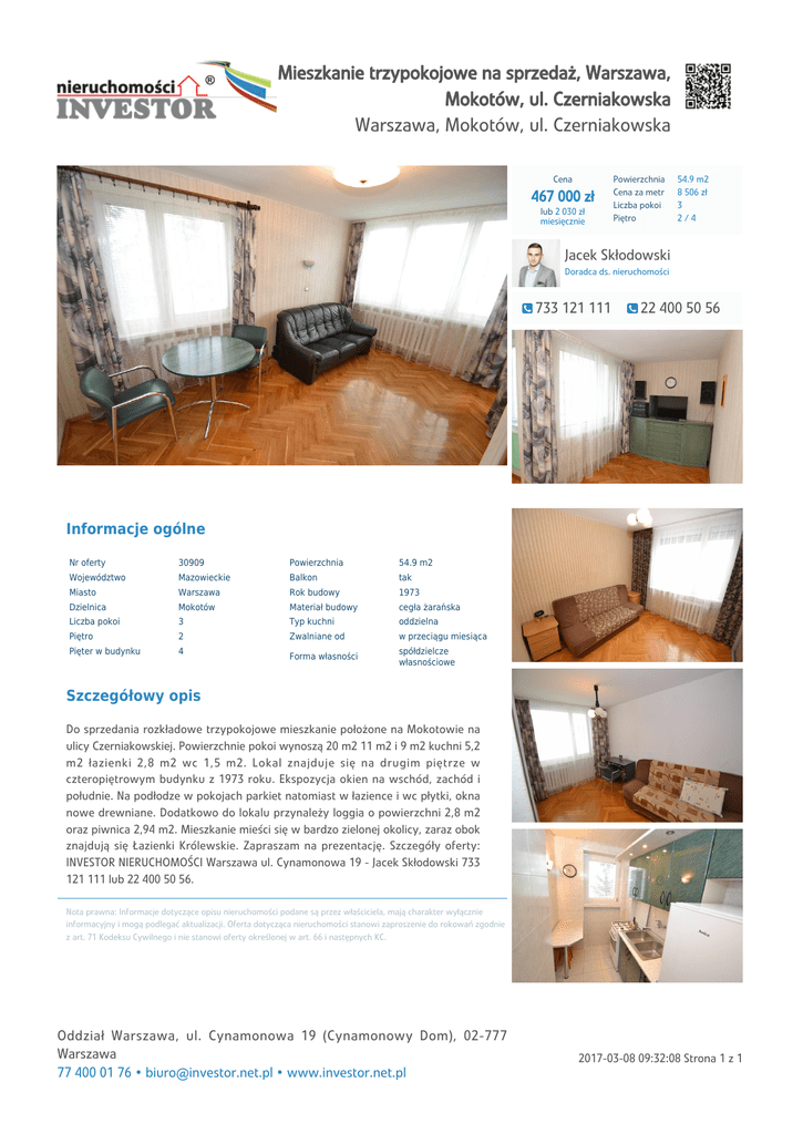 Mieszkanie trzypokojowe na sprzedaż, Warszawa, Mokotów, ul. Czerniakowska Warszawa, Mokotów, ul. Czerniakowska Cena 467 000 zł lub 2 030 zł miesięcznie Powierzchnia Cena za metr Liczba pokoi Piętro 54.9 m2 8 506 zł 3 2/4 Jacek Skłodowski Doradca ds. nieruchomości 733 121 111 22 400 50 56 Informacje ogólne Nr oferty 30909 Powierzchnia 54.9 m2 Województwo Mazowieckie Balkon tak Miasto Warszawa Rok budowy 1973 Dzielnica Mokotów Materiał budowy cegła żarańska Liczba pokoi 3 Typ kuchni oddzielna Piętro 2 Zwalniane od w przeciągu miesiąca Pięter w budynku 4 Forma własności spółdzielcze własnościowe Szczegółowy opis Do sprzedania rozkładowe trzypokojowe mieszkanie położone na Mokotowie na ulicy Czerniakowskiej. Powierzchnie pokoi wynoszą 20 m2 11 m2 i 9 m2 kuchni 5,2 m2 łazienki 2,8 m2 wc 1,5 m2. Lokal znajduje się na drugim piętrze w czteropiętrowym budynku z 1973 roku. Ekspozycja okien na wschód, zachód i południe. Na podłodze w pokojach parkiet natomiast w łazience i wc płytki, okna nowe drewniane. Dodatkowo do lokalu przynależy loggia o powierzchni 2,8 m2 oraz piwnica 2,94 m2. Mieszkanie mieści się w bardzo zielonej okolicy, zaraz obok znajdują się Łazienki Królewskie. Zapraszam na prezentację. Szczegóły oferty: INVESTOR NIERUCHOMOŚCI Warszawa ul. Cynamonowa 19 - Jacek Skłodowski 733 121 111 lub 22 400 50 56. Nota prawna: Informacje dotyczące opisu nieruchomości podane są przez właściciela, mają charakter wyłącznie informacyjny i mogą podlegać aktualizacji. Oferta dotycząca nieruchomości stanowi zaproszenie do rokowań zgodnie z art. 71 Kodeksu Cywilnego i nie stanowi oferty określonej w art. 66 i następnych KC. Oddział Warszawa, ul. Cynamonowa 19 (Cynamonowy Dom), 02-777 Warszawa 77 400 01 76 • [email protected] • www.investor.net.pl 2017-03-08 09:32:08 Strona 1 z 1