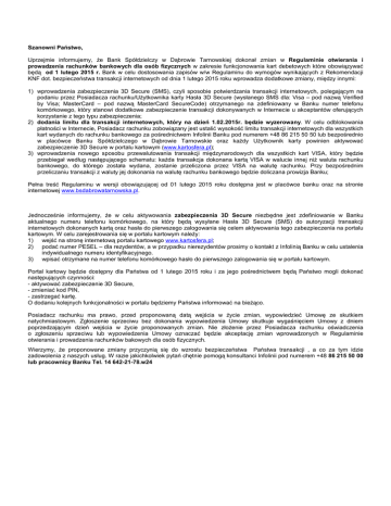 Szanowni Państwo, Uprzejmie informujemy, Ŝe Bank Spółdzielczy w Dąbrowie Tarnowskiej dokonał zmian w Regulaminie otwierania i prowadzenia rachunków bankowych dla osób fizycznych w zakresie funkcjonowania kart debetowych które obowiązywać będą od 1 lutego 2015 r. Bank w celu dostosowania zapisów w/w Regulaminu do wymogów wynikających z Rekomendacji KNF dot. bezpieczeństwa transakcji internetowych od dnia 1 lutego 2015 roku wprowadza dodatkowe zmiany, między innymi: 1) wprowadzenia zabezpieczenia 3D Secure (SMS), czyli sposobie potwierdzania transakcji internetowych, polegającym na podaniu przez Posiadacza rachunku/UŜytkownika karty Hasła 3D Secure (wysłanego SMS dla: Visa – pod nazwą Verified by Visa; MasterCard – pod nazwą MasterCard SecureCode) otrzymanego na zdefiniowany w Banku numer telefonu komórkowego, który stanowi dodatkowe zabezpieczenie transakcji dokonywanych w Internecie u akceptantów oferujących korzystanie z tego typu zabezpieczenia; 2) dodania limitu dla transakcji internetowych, który na dzień 1.02.2015r. będzie wyzerowany. W celu odblokowania płatności w Internecie, Posiadacz rachunku zobowiązany jest ustalić wysokość limitu transakcji internetowych dla wszystkich kart wydanych do rachunku bankowego za pośrednictwem Infolinii Banku pod numerem +48 86 215 50 50 lub bezpośrednio w placówce Banku Spółdzielczego w Dąbrowie Tarnowskie oraz kaŜdy UŜytkownik karty powinien aktywować zabezpieczenie 3D Secure w portalu kartowym (www.kartosfera.pl); 3) wprowadzenia nowego sposobu przewalutowania transakcji międzynarodowych dla wszystkich kart VISA, który będzie przebiegał według następującego schematu: kaŜda transakcja dokonana kartą VISA w walucie innej niŜ waluta rachunku bankowego, do którego została wydana, zostanie przeliczona przez VISA na walutę rachunku. Przy bezpośrednim przeliczaniu transakcji z waluty jej dokonania na walutę rachunku bankowego będzie doliczana prowizja Banku; Pełna treść Regulaminu w wersji obowiązującej od 01 lutego 2015 roku dostępna jest w placówce banku oraz na stronie internetowej www.bsdabrowatarnowska.pl. Jednocześnie informujemy, Ŝe w celu aktywowania zabezpieczenia 3D Secure niezbędne jest zdefiniowanie w Banku aktualnego numeru telefonu komórkowego, na który będą wysyłane Hasła 3D Secure (SMS) do autoryzacji transakcji internetowych dokonanych kartą oraz hasła do pierwszego zalogowania się celem aktywowania tego zabezpieczenia na portalu kartowym. W celu zarejestrowania się w portalu kartowym naleŜy: 1) wejść na stronę internetową portalu kartowego www.kartosfera.pl; 2) podać numer PESEL – dla rezydentów, a w przypadku nierezydentów prosimy o kontakt z Infolinią Banku w celu ustalenia indywidualnego numeru identyfikacyjnego. 3) wpisać otrzymane na numer telefonu komórkowego hasło do pierwszego zalogowania się w portalu kartowym. Portal kartowy będzie dostępny dla Państwa od 1 lutego 2015 roku i za jego pośrednictwem będą Państwo mogli dokonać następujących czynności: - aktywować zabezpieczenie 3D Secure, - zmieniać kod PIN, - zastrzegać kartę. O dodaniu kolejnych funkcjonalności w portalu będziemy Państwa informować na bieŜąco. Posiadacz rachunku ma prawo, przed proponowaną datą wejścia w Ŝycie zmian, wypowiedzieć Umowę ze skutkiem natychmiastowym. Zgłoszenie sprzeciwu bez dokonania wypowiedzenia Umowy skutkuje wygaśnięciem Umowy z dniem poprzedzającym dzień wejścia w Ŝycie proponowanych zmian. Nie złoŜenie przez Posiadacza rachunku oświadczenia o zgłoszeniu sprzeciwu lub wypowiedzenia Umowy oznaczać będzie akceptację zmian wprowadzonych w Regulaminie otwierania i prowadzenia rachunków bakowych dla osób fizycznych. Wierzymy, Ŝe proponowane zmiany przyczynią się do wzrostu bezpieczeństwa Państwa transakcji , a co za tym idzie zadowolenia z naszych usług. W razie jakichkolwiek pytań chętnie pomogą konsultanci Infolinii pod numerem +48 86 215 50 00 lub pracownicy Banku Tel. 14 642-21-78.w24