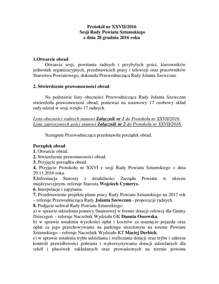 Protokół nr XXVII/2016 Sesji Rady Powiatu Sztumskiego z dnia 28 grudnia 2016 roku 1.Otwarcie obrad Otwarcia sesji, powitania radnych i przybyłych gości, kierowników jednostek organizacyjnych, przedstawicieli prasy i telewizji oraz pracowników Starostwa Powiatowego, dokonała Przewodnicząca Rady Jolanta Szewczun. 2. Stwierdzenie prawomocności obrad Na podstawie listy obecności Przewodnicząca Rady Jolanta Szewczun stwierdziła prawomocność obrad, poniewaŜ na ustawowy 17 osobowy skład rady udział w sesji wzięło 17 radnych. Lista obecności radnych stanowi Załącznik nr 1 do Protokołu nr XXVII/2016. Lista zaproszonych gości stanowi Załącznik nr 2 do Protokołu nr XXVII/2016. Następnie Przewodnicząca przedstawiła porządek obrad. Porządek obrad 1. Otwarcie obrad. 2. Stwierdzenie prawomocności obrad. 3. Przyjęcie porządku obrad. 4. Przyjęcie Protokołu nr XXVI z sesji Rady Powiatu Sztumskiego z dnia 29.11.2016 roku. 5.Informacja Starosty z działalności Zarządu Powiatu w okresie międzysesyjnym- referuje Starosta Wojciech Cymerys. 6. Interpelacje i zapytania. 7. Przedstawienie projektu planu pracy Rady Powiatu Sztumskiego na 2017 rok – referuje Przewodnicząca Rady Jolanta Szewczun.- propozycje radnych. 8. Podjęcie uchwał Rady Powiatu Sztumskiego: a) w sprawie udzielenia pomocy finansowej w formie dotacji celowej dla Gminy Dzierzgoń - referuje Naczelnik Wydziału GK Danuta Ossowska, b) w sprawie ustalenia wysokości opłat i kosztów za usunięcie pojazdu oraz opłat za jego przechowywanie na parkingu strzeŜonym na terenie Powiatu Sztumskiego – referuje Naczelnik Wydziału KT Maciej Derbich, c) w sprawie ustalenia trybu udzielania i rozliczania dotacji oraz trybu i zakresu kontroli prawidłowości pobrania i wykorzystywania dotacji udzielanych dla szkół i placówek zakładanych oraz prowadzonych na terenie powiatu sztumskiego przez podmioty inne niŜ jednostki samorządu terytorialnego – referuje Naczelnik Wydziału EK Aneta Kwiatkowska. d) w sprawie ustalenia wysokości stawek dotacji przedmiotowej dla samorządowego zakładu budŜetowego – Zakładu Aktywności Zawodowej w Sztumie na 2017 r – referuje Skarbnik Lucyna Bednarska, e) w sprawie wydatków budŜetu powiatu, które w 2016 roku nie wygasają z upływem roku budŜetowego – referuje Skarbnik Lucyna Bednarska, f) w sprawie zmiany budŜetu powiatu na 2016 rok r – referuje Skarbnik Lucyna Bednarska. 9. Przedstawienie opinii Komisji Stałych Rady Powiatu w sprawie projektu uchwały dotyczącej przyjęcia Wieloletniej Prognozy Finansowej dla Powiatu Sztumskiego na lata 2017 – 2027 oraz projektu budŜetu powiatu na 2017 rokreferują Przewodniczący Komisji Stałych. 10. Przedstawienie opinii Regionalnej Izby Obrachunkowej w sprawie uchwały o Wieloletniej Prognozie Finansowej Powiatu Sztumskiego na lata 2017-2027 oraz opinii o projekcie uchwały budŜetowej Powiatu Sztumskiego na 2017 rok – referuje Skarbnik Lucyna Bednarska. 11. Przedstawienie autopoprawki do projektu uchwały Rady Powiatu Sztumskiego w sprawie uchwalenia budŜetu Powiatu na 2017 rok - referuje Skarbnik Lucyna Bednarska. 12. Podjęcie uchwał Rady Powiatu Sztumskiego: a) w sprawie przyjęcia Wieloletniej Prognozy Finansowej dla Powiatu Sztumskiego na lata 2017-2027 – referuje Skarbnik Lucyna Bednarska. b) w sprawie uchwalenia budŜetu powiatu na 2017 rok – referuje Skarbnik Lucyna Bednarska. 13. Odpowiedzi na interpelacje i zapytania. 14. Wnioski i oświadczenia. 15. Sprawy róŜne. 16. Zakończenie obrad. Porządek obrad został przez Radę przyjęty 15 głosami przy jednym głosie „wstrzymującym się”. Radny Ryszard Mazerski był nieobecny na sali obrad. Porządek stanowi Załącznik nr 3 do Protokołu nr XXVII/2016. Ad.4 Przyjęcie Protokołu nr XXVI z sesji Rady Powiatu Sztumskiego z dnia 29 listopada 2016 roku. Protokół nr XXVI został przez przyjęty Radę 16 głosami. Radny Mazerski w dalszym ciągu był nieobecny na Sali. Przewodnicząca Rady przystąpiła do prowadzenia dalszych obrad zgodnie z porządkiem sesji. Ad.5 Informacja Starosty z działalności Zarządu Powiatu w okresie międzysesyjnym Zanim Starosta przedstawił informację, dokonał wręczenia aktu nadania stopnia nauczyciela dyplomowanego dla Pani Kamili Lewandowskiej, nauczyciela SOSW w Uśnicach, Ŝycząc jej dalszych sukcesów w pracy. Starosta dodał, Ŝe taki tytuł przyznaje Pomorski Kurator Oświaty. W imieniu Administracji Rządowej, Starosta dokonał wręczenia Panu Dariuszowi Fiołkowi honorowego medalu – ZasłuŜony dla rolnictwa. Przewodnicząca Rady dodała, Ŝe Pan Fiołek jest rolnikiem z Gminy Dzierzgoń zamieszkałym w miejscowości Morany i prowadzi 40 ha gospodarstwo rolne nastawioną głównie na produkcję mleczną. Następnie złoŜyła Panu Fiołkowi gratulacje. Po uroczystej części, Starosta przedstawił informację z działalności Zarządu Powiatu w okresie międzysesyjnym. Poinformował równieŜ o spotkaniach jakie odbyły się w Powiecie i innych instytucjach, w których uczestniczył wraz z Wicestarostą, jak równieŜ o odbytych uroczystościach w grudniu 2016 roku. Podczas przedstawiania informacji na salę przybył radny Ryszard Mazerski. Informacja stanowi Załącznik nr 4 do Protokołu nr XXIV/2016. Ad.6 Interpelacje i zapytania Zapytania radnego Piotra Steca były związane ze szpitalem w Sztumie. Nawiązując do informacji Starosty, radny poprosił o podanie szczegółów w sprawie realizacji systemu ciepłowniczego na terenie szpitala w Sztumie. Ponadto, zapytał o termin rozpoczęcia prac związanych z utworzeniem SOR-u. Poprosił teŜ o podanie wysokości zobowiązania szpitala wobec Powiatu Sztumskiego na koniec roku 2016 z tytułu czynszu dzierŜawnego. Radnego interesowała równieŜ sprawa Oddziału Kardiologii w szpitalu sztumskim. Zapytał o dalsze plany co do tego Oddziału i o ewentualne zmiany organizacyjne. Radny nawiązał do wycinki drzew w obrębie Postolin i złoŜonego w tej sp