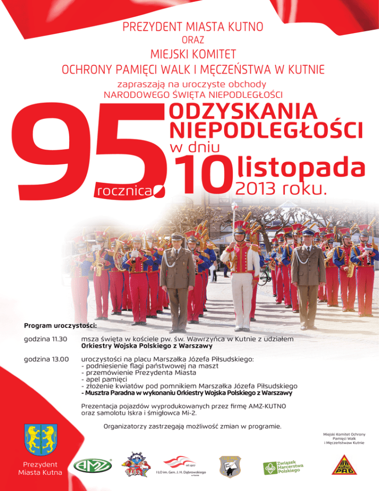 Program uroczystości: godzina 11.30 msza święta w kościele pw. św. Wawrzyńca w Kutnie z udziałem Orkiestry Wojska Polskiego z Warszawy godzina 13.00 uroczystości na placu Marszałka Józefa Piłsudskiego: - podniesienie flagi państwowej na maszt - przemówienie Prezydenta Miasta - apel pamięci - złożenie kwiatów pod pomnikiem Marszałka Józefa Piłsudskiego - Musztra Paradna w wykonaniu Orkiestry Wojska Polskiego z Warszawy Prezentacja pojazdów wyprodukowanych przez firmę AMZ-KUTNO oraz samolotu Iskra i śmigłowca Mi-2. Organizatorzy zastrzegają możliwość zmian w programie. Miejski Komitet Ochrony Pamięci Walk i Męczeństwaw Kutnie Prezydent Miasta Kutna
