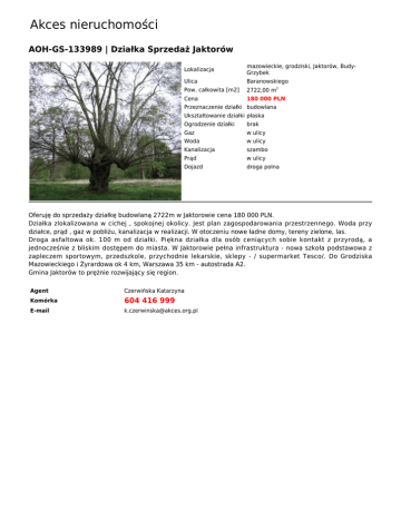Akces nieruchomości AOH-GS-133989 | Działka Sprzedaż Jaktorów Lokalizacja mazowieckie, grodziski, Jaktorów, BudyGrzybek Ulica Baranowskiego Pow. całkowita [m2] 2722,00 m2 Cena 180 000 PLN Przeznaczenie działki budowlana Ukształtowanie działki płaska Ogrodzenie działki brak Gaz w ulicy Woda w ulicy Kanalizacja szambo Prąd w ulicy Dojazd droga polna Oferuję do sprzedaży działkę budowlaną 2722m w Jaktorowie cena 180 000 PLN. Działka zlokalizowana w cichej , spokojnej okolicy. Jest plan zagospodarowania przestrzennego. Woda przy działce, prąd , gaz w pobliżu, kanalizacja w realizacji. W otoczeniu nowe ładne domy, tereny zielone, las. Droga asfaltowa ok. 100 m od działki. Piękna działka dla osób ceniących sobie kontakt z przyrodą, a jednocześnie z bliskim dostępem do miasta. W Jaktorowie pełna infrastruktura - nowa szkoła podstawowa z zapleczem sportowym, przedszkole, przychodnie lekarskie, sklepy - / supermarket Tesco/. Do Grodziska Mazowieckiego i Żyrardowa ok 4 km, Warszawa 35 km - autostrada A2. Gmina Jaktorów to prężnie rozwijający się region. Agent Czerwińska Katarzyna Komórka 604 416 999 E-mail [email protected]
