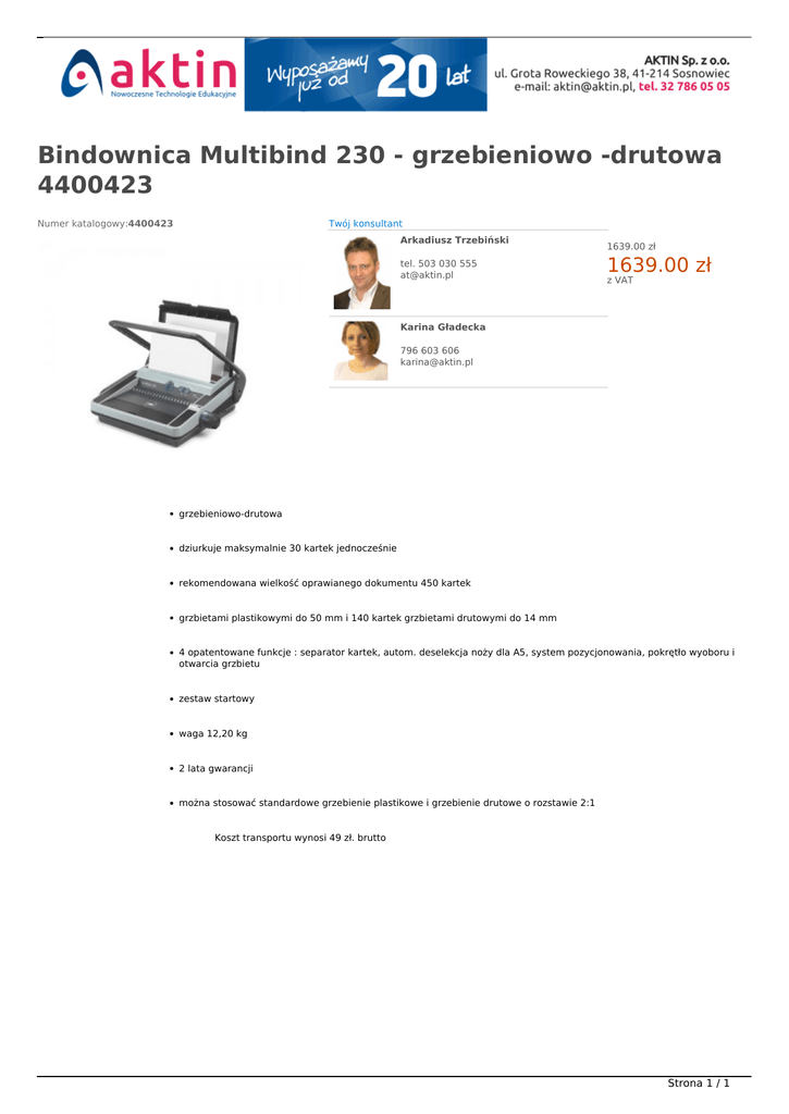 Bindownica Multibind 230 - grzebieniowo -drutowa 4400423 Numer katalogowy:4400423 Twój konsultant Arkadiusz Trzebiński tel. 503 030 555 [email protected] NOWOŚĆ W OFERCIE 1639.00 zł 1639.00 zł z VAT Karina Gładecka 796 603 606 [email protected] grzebieniowo-drutowa dziurkuje maksymalnie 30 kartek jednocześnie rekomendowana wielkość oprawianego dokumentu 450 kartek grzbietami plastikowymi do 50 mm i 140 kartek grzbietami drutowymi do 14 mm 4 opatentowane funkcje : separator kartek, autom. deselekcja noży dla A5, system pozycjonowania, pokrętło wyoboru i otwarcia grzbietu zestaw startowy waga 12,20 kg 2 lata gwarancji można stosować standardowe grzebienie plastikowe i grzebienie drutowe o rozstawie 2:1 Koszt transportu wynosi 49 zł. brutto Strona 1 / 1 Powered by TCPDF (www.tcpdf.org)