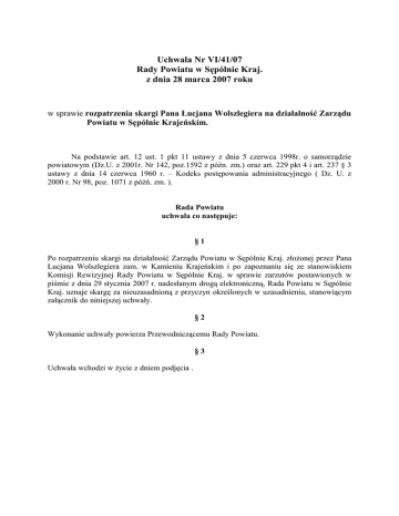 Uchwała Nr VI/41/07 Rady Powiatu w Sępólnie Kraj. z dnia 28 marca 2007 roku w sprawie rozpatrzenia skargi Pana Łucjana Wolszlegiera na działalność Zarządu Powiatu w Sępólnie Krajeńskim. Na podstawie art. 12 ust. 1 pkt 11 ustawy z dnia 5 czerwca 1998r. o samorządzie powiatowym (Dz.U. z 2001r. Nr 142, poz.1592 z późn. zm.) oraz art. 229 pkt 4 i art. 237 § 3 ustawy z dnia 14 czerwca 1960 r. – Kodeks postępowania administracyjnego ( Dz. U. z 2000 r. Nr 98, poz. 1071 z późń. zm. ). Rada Powiatu uchwala co następuje: §1 Po rozpatrzeniu skargi na działalność Zarządu Powiatu w Sępólnie Kraj. złożonej przez Pana Łucjana Wolszlegiera zam. w Kamieniu Krajeńskim i po zapoznaniu się ze stanowiskiem Komisji Rewizyjnej Rady Powiatu w Sępólnie Kraj. w sprawie zarzutów postawionych w piśmie z dnia 29 stycznia 2007 r. nadesłanym drogą elektroniczną, Rada Powiatu w Sępólnie Kraj. uznaje skargę za nieuzasadnioną z przyczyn określonych w uzasadnieniu, stanowiącym załącznik do niniejszej uchwały. §2 Wykonanie uchwały powierza Przewodniczącemu Rady Powiatu. §3 Uchwała wchodzi w życie z dniem podjęcia . Załącznik do uchwały Nr VI/41/07 Rady Powiatu w Sępólnie Krajeńskim z dnia 28 marca 200 7 r. Uzasadnienie Pismem z dnia 29 stycznia 2007 r., przesłanym drogą elektroniczną, Pan Łucjan Wolszlegier zam. w Kamieniu Krajeńskim złożył skargę na Zarząd Powiatu a ściślej na opieszałe działania Starosty wraz z Etatowymi Członkami Zarządu. Treść skargi stanowi załącznik Nr 1 do niniejszego uzasadnienia. Kwintesencją tej skargi jak i prowadzonej uprzednio korespondencji jest domaganie się wypłaty odszkodowania za niezgodne z prawem zdaniem skarżącego –działania urzędników i organów władzy. Celem zwołanego posiedzenia Komisji Rewizyjnej Rady Powiatu w dniu 14 marca 2007 r. było rozpatrzenie tej w sumie wielowątkowej skargi, w tym także pod względem wyżej wymienionego odszkodowania. Obecny na posiedzeniu Pan Łucjan Wolszlegier, przedstawił będące w jego posiadaniu rozliczne dokumenty dotyczące prowadzonego przez niego Ośrodka Szkolenia Kierowców, w tym między innymi : prawo jazdy, legitymacje instruktora, wyroki sądowe, orzeczenia Samorządowego Kolegium Odwoławczego w Bydgoszczy. Przedstawił też swoją wersję cofnięcia przez Starostę zezwolenia na prowadzenie Ośrodka Szkolenia Kierowców. Dyrektor Wydziału Komunikacji i Dróg okazał do wglądu Komisji Rewizyjnej komplet dokumentacji związanej z Ośrodkiem Szkolenia Kierowców – Łucjan Wolszlegier. Fakty wynikające z dokumentów, przedstawiają się następująco : W okresie od 7 marca do 4 kwietnia 2001 r. Starostwo Powiatowe w Sępólnie Kraj. objęte było kontrolą prowadzoną przez Najwyższą Izbę Kontroli – Delegaturę w Bydgoszczy w zakresie prawidłowości szkolenia i egzaminowania kandydatów na kierowców oraz wydawania praw jazdy. W wyniku tej kontroli i polecenia zawartego w wystąpieniu pokontrolnym, dotyczącego przeprowadzenia ponownej weryfikacji wydanych zezwoleń na prowadzenie ośrodków szkolenia kierowców działających na terenie powiatu, do ich cofnięcia włącznie, przeprowadzona została w lipcu 2001 r.( między innymi ) weryfikacja Ośrodka Szkolenia Kierowców prowadzonego przez Pana Łucjana Wolszlegiera. Na wystosowane pismo omawiające występujące w dalszym ciągu uchybienia w OSK i ustalony termin ich wyeliminowania, Pan Łucjan Wolszlegier przysłał pismo o zastosowaniu się do poleceń oraz w przeddzień określonego terminu, prośbę o przedłużenie terminu realizacji, podając zbyt krótki termin do wykonania zaleceń. Zatem ponowna kontrola sprawdzająca wykonanie wniosków pokontrolnych, przeprowadzona została w miesiącu lutym 2002 r. Kontrola ta wykazała ponownie uchybienia w prowadzonym przez zainteresowanego Ośrodku Szkolenia Kierowców. Biorąc pod uwagę fakt, że przeprowadzone kontrole ( w tym sprawdzająca ) nie dawały podstaw do stwierdzenia, że w/w ośrodek funkcjonuje zgodnie z obowiązującymi przepisami, wydana została decyzja, w wyniku której orzeczono cofnięcie zezwolenia wydanego przez Starostę Sępoleńskiego. Samorządowe Kolegium Odwoławcze w Bydgoszczy utrzymało tą decyzję w mocy. O wydanie pozwolenia na prowadzenie szkolenia kierowców kategorii A, A1, B i T wystąpił Pan Ł.Wolszlegier w maju 2003 r. i styczniu 2004 r. W odpowiedzi na w/w pisma Dyrektor Wydziału Budownictwa, Komunikacji i Promocji poinformował go, że zgodnie z art. 104 ustawy Prawo o ruchu drogowym, ponowne zezwolenie na prowadzenie szkolenia kandydatów na kierowców nie może być wydane wcześniej niż po upływie 2 lat od dnia, w którym decyzja o cofnięciu zezwolenia stała się prawomocna, a zatem o wydanie ponownego zezwolenia na tą działalność będzie mógł się ubiegać po dniu 8 maja 2004 r. Odmowną decyzję dotyczącą wydania zezwolenia na szkolenie kierowców ( złożony wniosek w tej sprawie był niekompletny, a na pismo o dostarczenie brakujących dokumentów nie było odzewu ), Samorządowe Kolegium Odwoławcze w Bydgoszczy utrzymało w mocy, natomiast Wojewódzki Sad Administracyjny, na skutek zmiany przepisów wprowadzających ustawę o swobodzie działalności gospodarczej – „postępowanie w sprawie udzielenia zezwolenie na wykonywanie działalności gospodarczej wszczęte i niezakończone przed dniem wejścia w życie tej ustawy, umarza się” ( ustawa weszła w życie 21 sierpnia 2004 r.) - uchylił tę decyzję, którą Samorządowe Kolegium Odwoławcze w Bydgoszczy przekazało do ponownego rozpatrzenia organowi pierwszej instancji ( czyli Staroście Sępoleńskiemu ) a następnie umorzyło postępowanie w tej sprawie. Na tą decyzję organu II instancji, Pan Łucjan Wolszlegier złożył ponownie skargę do Wojewódzkiego Sądu Administracyjnego w Bydgoszczy, który wyrokiem z dnia 16 listopada 2005 r. skargę tą oddalił. Osobną sprawą jest zatrzymanie przez fun