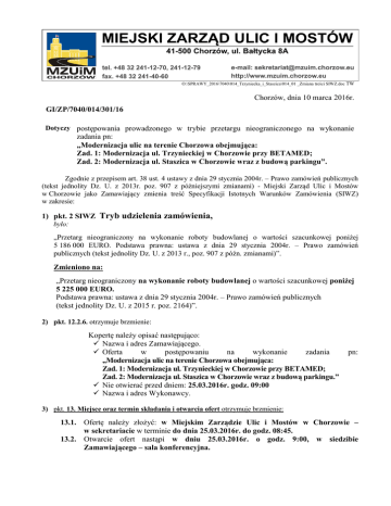 O:\SPRAWY_2016\7040\014_Trzyniecka_i_Staszica\014_01 _Zmiana treści SIWZ.doc TW Chorzów, dnia 10 marca 2016r. GI/ZP/7040/014/301/16 Dotyczy postępowania prowadzonego w trybie przetargu nieograniczonego na wykonanie :zadania pn: „Modernizacja ulic na terenie Chorzowa obejmująca: Zad. 1: Modernizacja ul. Trzynieckiej w Chorzowie przy BETAMED; Zad. 2: Modernizacja ul. Staszica w Chorzowie wraz z budową parkingu”. Zgodnie z przepisem art. 38 ust. 4 ustawy z dnia 29 stycznia 2004r. – Prawo zamówień publicznych (tekst jednolity Dz. U. z 2013r. poz. 907 z późniejszymi zmianami) - Miejski Zarząd Ulic i Mostów w Chorzowie jako Zamawiający zmienia treść Specyfikacji Istotnych Warunków Zamówienia (SIWZ) w zakresie: 1) pkt. 2 SIWZ Tryb udzielenia zamówienia, było: „Przetarg nieograniczony na wykonanie roboty budowlanej o wartości szacunkowej poniżej 5 186 000 EURO. Podstawa prawna: ustawa z dnia 29 stycznia 2004r. – Prawo zamówień publicznych (tekst jednolity Dz. U. z 2013 r., poz. 907 z późn. zmianami)”. Zmieniono na: „Przetarg nieograniczony na wykonanie roboty budowlanej o wartości szacunkowej poniżej 5 225 000 EURO. Podstawa prawna: ustawa z dnia 29 stycznia 2004r. – Prawo zamówień publicznych (tekst jednolity Dz. U. z 2015 r. poz. 2164)”. 2) pkt. 12.2.6. otrzymuje brzmienie: Kopertę należy opisać następująco: Nazwa i adres Zamawiającego. Oferta w postępowaniu na wykonanie zadania „Modernizacja ulic na terenie Chorzowa obejmująca: Zad. 1: Modernizacja ul. Trzynieckiej w Chorzowie przy BETAMED; Zad. 2: Modernizacja ul. Staszica w Chorzowie wraz z budową parkingu.” Nie otwierać przed dniem: 25.03.2016r. godz. 09:00 Nazwa i adres Wykonawcy. pn: 3) pkt. 13. Miejsce oraz termin składania i otwarcia ofert otrzymuje brzmienie: 13.1. Ofertę należy złożyć: w Miejskim Zarządzie Ulic i Mostów w Chorzowie – w sekretariacie w terminie do dnia 25.03.2016r. do godz. 08:45. 13.2. Otwarcie ofert nastąpi w dniu 25.03.2016r. o godz. 9:00, w siedzibie Zamawiającego – sala konferencyjna. 4) pkt. 15.2 „Opis stosowanych kryteriów oraz sposób ich obliczania” poprzez korektę błędu pisarskiego we wzorze określającym ilość punktów przyznanych Wykonawcy na podstawie kryteriów określonych w pkt 15.1 SIWZ - w zakresie kryterium ceny i gwarancji. pkt 15.2. Opis stosowanych kryteriów oraz sposób ich obliczania, otrzymuje brzmienie: Zamawiający przyzna zamówienie Wykonawcy, którego oferta odpowiada zasadom określonym w ustawie z dnia 29 stycznia 2004r. – Prawo zamówień publicznych i Specyfikacji Istotnych Warunków Zamówienia oraz otrzyma największą ilość punktów na podstawie kryteriów określonych powyżej wyliczoną wg niżej podanego wzoru: Punkty będą przyznawane wg następujących zasad: 1% = 1 punkt. a) Kryterium ceny: Oferta z najniższą ceną brutto = 95 punktów Punkty pozostałych ofert liczone będą wg proporcji matematycznej z dokładnością do dwóch miejsc po przecinku: Pc= (Cn/Cb) x 95 gdzie: Pc – ilość punktów w kryterium cena Cn - najniższa cena brutto występująca w ofertach Cb - cena brutto wskazana w rozpatrywanej w ofercie b) Kryterium okresu gwarancja: Ocenie podlegać będzie gwarancja ponad wymagane minimum. Oferta z najdłuższym okresem gwarancji (jednak nie krótszym niż 60 miesięcy i nie dłuższym niż 96 miesięcy) = 5 punków. W przypadku, gdy wykonawca zaoferuje okres gwarancji powyżej wymaganego maksimum zamawiający do oceny ofert przyjmie 96 miesięcy, natomiast do umowy zostanie wpisany okres gwarancji zaproponowany przez wykonawcę. Okres gwarancji pozostałych ofert będzie liczony wg proporcji matematycznej z dokładnością do dwóch miejsc po przecinku: G 60 x5 Pr Gn 60 gdzie: Pr – ilość punktów w kryterium gwarancji G – zaoferowany przez Wykonawcę w ofercie okres gwarancji(w miesiącach) Gn – oferta z najdłuższym okresem gwarancji (jednak nie dłuższym niż 96 miesięcy) Uwaga: wskazany okres gwarancji jest równy okresowi rękojmi. Powyższa zmiana treści SIWZ prowadzi do zmiany treści ogłoszenia o zamówieniu i zgodnie z przepisem art. 38 ust. 4a ustawy – Prawo zamówień publicznych. Ogłoszenie o zmianie ogłoszenia opublikowano w biuletynie BZP pod numerem 54640 – 2016 dniu 10.03.2016r. Z-ca Dyrektora MZUiM ……………………………… mgr inż. Wojciech Osadnik 2