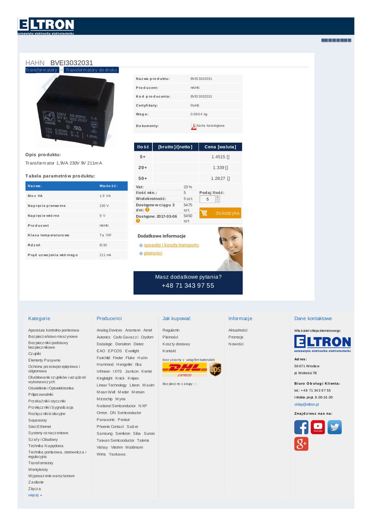 HAHNBVEI3032031 Tr ansfor m ator y > Tr ansfor m ator ydodr uku N a z wa p ro d u ktu : BVEI 3032031 P ro d u c en t: HAHN K o d p ro d u c en ta : BVEI 3032031 C ertyfi ka ty: RoHS Wa g a : 0.08 6 4 kg Ka rta ka ta logowa D o ku m en ty: Ilo ś ć O pis pro duktu: Tr ansfor m ator 1,9VA230V9V211m A T a bela pa ra m etró wpro duktu: N a z wa : Wa rto ś ć : M o c VA 1.9 VA N a p i ęc i ep i erwo tn e [brutto ] /[netto ] Cena [wa luta ] 5+ 1.4515[] 20+ 1.339[] 50+ 1.28 27 [] Vat: Ilośćmin.: 23% 5 Wielokrotność: 5sz t. 230V Dostępnewciąg u 3 d ni: 5475 sz t. N a p i ęc i ewtó rn e 9 V Dostępne:2017-03-06 5450 sz t P ro d u c en t HAHN K l a s a tem p era tu ro wa T a 70F R d z eń EI 30 P rą d u z wo j en i a wtó rn eg o 211mA Pod ajIlość: + 5 - dokosz yka Maszdodatkowepytania? +48713439755 Kategorie Producenci Jakkupować Informacje Danekontaktowe Aparaturakontrolno-pomiarowa AnalogDevices|Ansmann|Atmel Regulamin Aktualności Wła ścicielsklepuinternetowego: Bez piecz eństwomasz ynowe Autonics|CarloGavaz z i|Crydom Płatności Promocje Bez piecz nikiipodstawy bez piecz nikowe Datalogic|Densitron|Diotec Kosz tydostawy N owości EAO|EPCOS |Everlight Kontakt Cz ujniki ElementyPasywne Fairchild|Finder|Fluke|H ahn Korz ysta myz usługfirmkurierskich: Ad res : Ochronaprz eciwprz epięciowai odgromowa H ammond|H engstler|Illca 50-071Wrocła w Infineon|IXYS |Jamicon|Kemet pl.Wolności7B Okablowaniecz ujnikówiurz ądz eń wykonawcz ych Kingbright|Knick|Knipex OświetlenieiOptoelektronika LinearTechnology|Liteon|M axim Bez piecz nez a kupy: B i u ro O b s ł u g i K l i en ta : M eanWell|M eder|M ersen tel.:+ 4 8 7134 39 755 Prz ekaź nikiistycz niki M icrochip|M yrra I nfolinia pn-pt.8 .00-16 .00 Prz ełącz nikiiSygnaliz acja N ationalSemiconductor|N XP [email protected] Roz łącz nikiiz olacyjne Omron|ON Semiconductor Z n a j d z i es z n a s n a : Separatory Panasonic|Pentair SieciEthernet PhoenixContact|Salz er Systemyoz nacz eniowe Samsung|Semikron|Siba |Sunon Sz afyiObudowy TaiwanSemiconductor|Talema TechnikaN apędowa Vishay|Vitrohm|Waldmann Technikapomiarowa,sterownicz ai regulacyjna Wima |Yaskawa | Półprz ewodniki Transformatory Wentylatory Wyposaż eniewarsz tatowe Z asilanie Z łącz a więcej