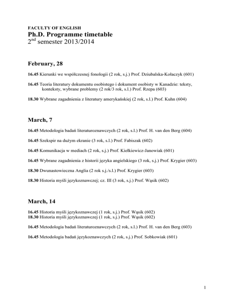 FACULTY OF ENGLISH Ph.D. Programme timetable 2nd semester 2013/2014 February, 28 16.45 Kierunki we współczesnej fonologii (2 rok, s.j.) Prof. Dziubalska-Kołaczyk (601) 16.45 Teoria literatury dokumentu osobistego i dokument osobisty w Kanadzie: teksty, konteksty, wybrane problemy (2 rok/3 rok, s.l.) Prof. Rzepa (603) 18.30 Wybrane zagadnienia z literatury amerykańskiej (2 rok, s.l.) Prof. Kuhn (604) March, 7 16.45 Metodologia badań literaturoznawczych (2 rok, s.l.) Prof. H. van den Berg (604) 16.45 Szekspir na dużym ekranie (3 rok, s.l.) Prof. Fabiszak (602) 16.45 Komunikacja w mediach (2 rok, s.j.) Prof. Kiełkiewicz-Janowiak (601) 16.45 Wybrane zagadnienia z historii języka angielskiego (3 rok, s.j.) Prof. Krygier (603) 18.30 Dwunastowieczna Anglia (2 rok s.j./s.l.) Prof. Krygier (603) 18.30 Historia myśli językoznawczej; cz. III (3 rok, s.j.) Prof. Wąsik (602) March, 14 16.45 Historia myśli językoznawczej (1 rok, s.j.) Prof. Wąsik (602) 18.30 Historia myśli językoznawczej (1 rok, s.j.) Prof. Wąsik (602) 16.45 Metodologia badań literaturoznawczych (2 rok, s.l.) Prof. H. van den Berg (603) 16.45 Metodologia badań językoznawczych (2 rok, s.j.) Prof. Sobkowiak (601) 1 March, 21 16.45 Historia myśli językoznawczej (1 rok, s.j.) Prof. E. Wąsik (602) 18.30 Historia myśli językoznawczej (1 rok, s.j.) Prof. E. Wąsik (602) 16.45 Kierunki we współczesnej fonologii (2 rok, s.j.) Prof. Dziubalska-Kołaczyk (601) 18.30 Kierunki we współczesnej fonologii (2 rok, s.j.) Prof. Dziubalska-Kołaczyk (601) 16.45 Teoria literatury dokumentu osobistego i dokument osobisty w Kanadzie: teksty, konteksty, wybrane problemy (2 rok/3 rok, s.l.) Prof. Rzepa (603) 18.30 Teoria literatury dokumentu osobistego i dokument osobisty w Kanadzie: teksty, konteksty, wybrane problemy (2 rok/3 rok, s.l.) Prof. Rzepa (603) March, 28 16.45 Kierunki we współczesnej fonologii (2 rok, s.j.) Prof. Dziubalska-Kołaczyk (601) 16.45 Teoria literatury dokumentu osobistego i dokument osobisty w Kanadzie: teksty, konteksty, wybrane problemy (2 rok/3 rok, s.l.) Prof. Rzepa (603) 18.30 Metodologia badań językoznawczych (2 rok, s.j.) Prof. Sobkowiak (601) April, 4 16.45 Wybrane zag. z historii kultury Wysp Brytyjskich (1 rok, s.l.) Prof. Lipoński (604) 16.45 Metodologia badań literaturoznawczych (2 rok, s.l.) Prof. H. van den Berg (603) 16.45 Szekspir na dużym ekranie (3 rok, s.l.) Prof. Fabiszak (602) 18.30 Wybrane zagadnienia z literatury amerykańskiej (2 rok, s.l.) Prof. Kuhn (601) April, 11 16.45 Historia myśli językoznawczej (1 rok, s.j.) Prof. E. Wąsik (602) 18.30 Historia myśli językoznawczej (1 rok, s.j.) Prof. E. Wąsik (602) 16.45 Wybrane zag. z historii kultury Wysp Brytyjskich (1 rok, s.l.) Prof. Lipoński (604) 16.45 Metodologia badań językoznawczych (2 rok, s.j.) Prof. Sobkowiak (601) 16.45 Teoria literatury dokumentu osobistego i dokument osobisty w Kanadzie: teksty, konteksty, wybrane problemy (2 rok/3 rok, s.l.) Prof. Rzepa (603) 2 April, 25 16.45 Metodologia badań literaturoznawczych (2 rok, s.l.) Prof. H. van den Berg (604) 16.45 Komunikacja w mediach (2 rok, s.j.) Prof. Kiełkiewicz-Janowiak (601) 16.45 Wybrane zagadnienia z historii języka angielskiego (3 rok, s.j.) Prof. Krygier (603) 18.30 Dwunastowieczna Anglia (2 rok s.j./s.l.) Prof. Krygier (603) 18.30 Historia myśli językoznawczej; cz. III (3 rok, s.j.) Prof. Wąsik (602) May, 9 16.45 Wybrane zag. z historii kultury Wysp Brytyjskich (1 rok, s.l.) Prof. Lipoński (604) 16.45 Metodologia badań literaturoznawczych (2 rok, s.l.) Prof. H. van den Berg (603) 16.45 Metodologia badań językoznawczych (2 rok, s.j.) Prof. Sobkowiak (601) 16.45 Szekspir na dużym ekranie (3 rok, s.l.) Prof. Fabiszak (602) May, 16 16.45 Kierunki we współczesnej fonologii (2 rok, s.j.) Prof. Dziubalska-Kołaczyk (601) 18.30 Kierunki we współczesnej fonologii (2 rok, s.j.) Prof. Dziubalska-Kołaczyk (601) 16.45 Teoria literatury dokumentu osobistego i dokument osobisty w Kanadzie: teksty, konteksty, wybrane problemy (2 rok/3 rok, s.l.) Prof. Rzepa (603) 18.30 Teoria literatury dokumentu osobistego i dokument osobisty w Kanadzie: teksty, konteksty, wybrane problemy (2 rok/3 rok, s.l.) Prof. Rzepa (603) 18.30 Wybrane zagadnienia z literatury amerykańskiej (2 rok, s.l.) Prof. Kuhn (604) May, 23 16.45 Metodologia badań literaturoznawczych (2 rok, s.l.) Prof. H. van den Berg (604) 16.45 Komunikacja w mediach (2 rok, s.j.) Prof. Kiełkiewicz-Janowiak (601) 16.45 Wybrane zagadnienia z historii języka angielskiego (3 rok, s.j.) Prof. Krygier (603) 18.30 Dwunastowieczna Anglia (2 rok s.j./s.l.) Prof. Krygier (603) 18.30 Historia myśli językoznawczej; cz. III (3 rok, s.j.) Prof. Wąsik (602) 3 May, 30 16.45 Metodologia badań literaturoznawczych (2 rok, s.l.) Prof. H. van den Berg (603) 16.45 Wybrane zag. z historii kultury Wysp Brytyjskich (1 rok, s.l.) Prof. Lipoński (604) 16.45 Kierunki we współczesnej fonologii (2 rok, s.j.) Prof. Dziubalska-Kołaczyk (601) 16.45 Szekspir na dużym ekranie (3 rok, s.l.) Prof. Fabiszak (602) 18.30 Wybrane zagadnienia z literatury amerykańskiej (2 rok, s.l.) Prof. Kuhn (604) June, 6 16.45 Metodologia badań literaturoznawczych (2 rok, s.l.) Prof. H. van den Berg (604) 16.45 Komunikacja w mediach (2 rok, s.j.) Prof. Kiełkiewicz-Janowiak (601) 16.45 Wybrane zagadnienia z historii języka angielskiego (3 rok, s.j.) Prof. Krygier (603) 18.30 Dwunastowieczna Anglia (2 rok s.j./s.l.) Prof. Krygier (603) 18.30 Historia myśli językoznawczej; cz. III (3 rok, s.j.) Prof. Wąsik (602) June, 13 16. 45 Kierunki we współczesnej fonologii (2 rok, s.j.) Prof. Dziubalska-Kołaczyk (601) 16.45 Teoria literatury dokumentu osobistego i dokument osobisty w Kanadzie: teksty, konteksty, wybrane problemy (2 rok/3 rok, s.l.) Prof. Rzepa (603) 4