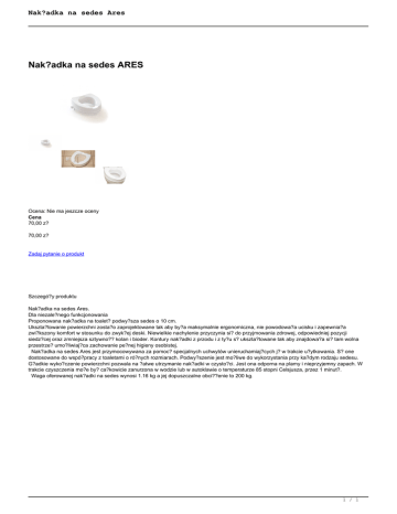 Nak?adka na sedes Ares Nak?adka na sedes ARES Ocena: Nie ma jeszcze oceny Cena 70,00 z? 70,00 z? Zadaj pytanie o produkt Szczegó?y produktu Nak?adka na sedes Ares. Dla niezale?nego funkcjonowania Proponowana nak?adka na toalet? podwy?sza sedes o 10 cm. Ukszta?towanie powierzchni zosta?o zaprojektowane tak aby by?a maksymalnie ergonomiczna, nie powodowa?a ucisku i zapewnia?a zwi?kszony komfort w stosunku do zwyk?ej deski. Niewielkie nachylenie przyczynia si? do przyjmowania zdrowej, odpowiedniej pozycji siedz?cej oraz zmniejsza sztywno?? kolan i bioder. Kontury nak?adki z przodu i z ty?u s? ukszta?towane tak aby znajdowa?a si? tam wolna przestrze? umo?liwiaj?ca zachowanie pe?nej higieny osobistej. Nak?adka na sedes Ares jest przymocowywana za pomoc? specjalnych uchwytów unieruchamiaj?cych j? w trakcie u?ytkowania. S? one dostosowane do wspó?pracy z toaletami o ró?nych rozmiarach. Podwy?szenie jest mo?liwe do wykorzystania przy ka?dym rodzaju sedesu. G?adkie wyko?czenie powierzchni pozwala na ?atwe utrzymanie nak?adki w czysto?ci. Jest ona odporna na plamy i nieprzyjemny zapach. W trakcie czyszczenia mo?e by? ca?kowicie zanurzona w wodzie lub w autoklawie o temperaturze 85 stopni Celsjusza, przez 1 minut?. Waga oferowanej nak?adki na sedes wynosi 1.16 kg a jej dopuszczalne obci??enie to 200 kg. 1 / 1 Powered by TCPDF (www.tcpdf.org)