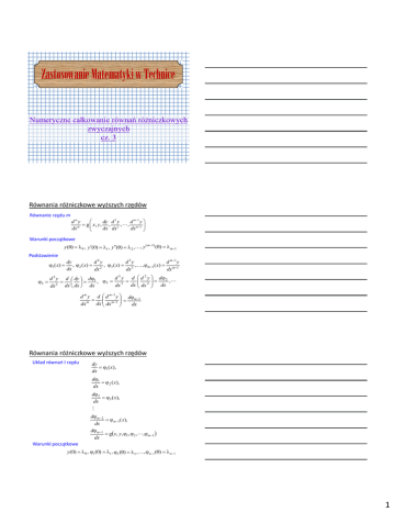 Zastosowanie Matematyki w Technice Numeryczne całkowanie równań różniczkowych zwyczajnych cz. 3 0 Równania różniczkowe wyższych rzędów Równanie rzędu m dmy dy d 2 y d m 1 y g x, y, , 2 , , m 1 m dx dx dx dx Warunki początkowe y (0) 0 , y(0) 1 , y(0) 2 , , y ( m1) (0) m 1 Podstawienie 1 ( x) 2 dy d2y d3y d m1 y , 2 ( x) 2 , 3 ( x) 3 , , m1 ( x) m1 dx dx dx dx 3 2 d 2 y d dy d1 d y d d y d 2 , , 3 3 2 2 dx dx dx dx dx dx dx dx d m y d d m1 y dm1 dx m dx dx m1 dx Równania różniczkowe wyższych rzędów Układ równań I rzędu dy 1 ( x), dx d1 2 ( x), dx d 2 3 ( x), dx d m 2 m1 ( x), dx d m1 g x, y, 1 , 2 , , m1 dx Warunki początkowe y (0) 0 , 1 (0) 1 , 2 (0) 2 , , m 1 (0) m 1 1 Równanie II rzędu Przykład 13 L uz(t) t=0 i C R di u 0 dt u du i C R dt R=60 L=6mH C=200F uz L LC u uz(t)=Umsin(t+) Um=100V =314s‐1 = d 2u L du u U m sin t dt 2 R dt du 1 du u d 2u U m g t , u, sin t dt RC dt LC dt 2 LC i (0) u (0) i (0) u (0) 0 u (0) C RC C Przykład 13 Warunek początkowy dla prądu t<0 L uz(t) i Im U e j Um m R j L Z R i (t ) i (0) Um R 2 (L) 2 Um R 2 (L) 2 Um R 2 L 2 e L j arctg R L sin t arctg R L sin arctg 0,878 A R u(0) 4389 V s Przykład 13 di u 0 dt u du i C R dt uz L metoda Eulera di u z u dt L du i u dt C RC u (0) 0 i (0) 0,878 A ik 1 ik h f1 (tk , ik , uk ) uk 1 uk h f 2 (tk , ik , uk ) f1 (tk , ik , uk ) u z (tk ) uk 100sin 314tk 6 uk L 0,06 f 2 (tk , ik , uk ) ik uk ik uk C RC 2 104 1, 2 102 2 Przykład 13 metoda Adamsa‐Bashfortha i1 i0 h f1 (0, i0 , u0 ) u1 u0 h f 2 (0, i0 , u0 ) h 3 f1 (tk , ik , uk ) f1 (tk 1 , ik 1 , uk 1 ) 2 h uk 1 uk 3 f 2 (tk , ik , uk ) f 2 (tk 1 , ik 1 , uk 1 ) 2 ik 1 ik 30 k 1, 2, h 0,0002 s 250 200 20 150 10 100 50 0 0 i [A] 0,005 0,01 0,015 ‐10 0,02 u [V] 0 ‐50 0 0,005 0,01 0,015 0,02 ‐100 ‐20 ‐150 ‐30 ‐200 ‐40 ‐250 m. Eulera m. Adamsa‐Bashfortha m. Eulera m. Adamsa‐Bashfortha 3
