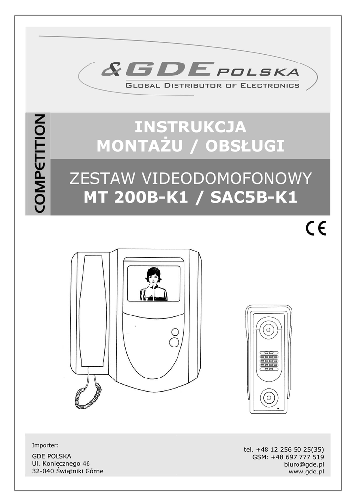INSTRUKCJA MONTAśU / OBSŁUGI ZESTAW VIDEODOMOFONOWY MT 200B-K1 / SAC5B-K1 Importer: GDE POLSKA Ul. Koniecznego 46 32-040 Świątniki Górne tel. +48 12 256 50 25(35) GSM: +48 697 777 519 [email protected] www.gde.pl MT 200B-K1 / SAC5B-K1 Wygląd zewnętrzny Monitor MT 200B-K1 Kamera SAC5B-K1 -2- MT 200B-K1 / SAC5B-K1 ZANIM ROZPOCZNIESZ MONTAś! Nie montuj monitora i kamery w miejscu naraŜonym na kurz, bezpośrednie promieniowanie słoneczne (lub inne oświetlenie), wysokie temperatury (powyŜej 40 stopni) lub duŜą wilgotność. Nie uszczelniaj silikonem kamery. Nie lokuj urządzenia w miejscach naraŜonych na wibracje lub wstrząsy. MontaŜ Monitor MT 200B-K1 1. Wywierć w ścianie otwory odpowiadające rozstawowi otworów w uchwycie monitora 2. Zamocuj na ścianie uchwyt do montaŜu monitora. Wywierć otwór pośrodku uchwytu. Otwór powinien być wystarczająco duŜy dla przeprowadzenia przewodów elektrycznych. 3. Połącz przewody kamery z monitorem. 4. Podłącz przewód słuchawki do monitora 5. Ustaw przycisk POWER w pozycji „wciśnięty” -3- MT 200B-K1 / SAC5B-K1 6. Umieść monitor w uchwytach poprzez ustawienie go ponad hakami znajdującymi się na uchwycie i zsunięcie monitora w dół. Kamera SAC5B-K1 1. Wywierć w ścianie otwory odpowiadające rozstawowi otworów w osłonie kamery 2. Zamocuj osłonę kamery 3. Połącz przewody kamery z monitorem 4. Umieść kamerę w osłonie i zamocuj ją za pomocą śrubki -4- MT 200B-K1 / SAC5B-K1 Schemat połączeń – przykłady Monitor + kamera 2 x monitor + kamera 2 x monitor + kamera + unifon -5- MT 200B-K1 / SAC5B-K1 Obsługa videodomofonu 1. Odwiedzający naciska przycisk wywołania na zewnętrznej kamerze. Przez głośnik monitora rozlega się sygnał - znak czyjejś obecności przed wejściem. 2. Po ujrzeniu obrazu na ekranie monitora moŜesz: • odpowiedzieć - podnieść słuchawkę i rozpocznij rozmowę obraz na monitorze będzie wyświetlany przez około 90 sekund lub do momentu odłoŜenia słuchawki. • nie odpowiadać - nie podnoś słuchawki, obraz na monitorze zgaśnie po około 90 sekundach. 3. Po rozmowie z odwiedzającym, jeŜeli masz elektromagnetyczny, moŜesz nacisnąć przycisk zainstalowany zamek aby otworzyć drzwi. Po otwarciu elektrozamka obraz na monitorze gaśnie. Czas otwarcia zamka wynosi 3 sekundy. 4. JeŜeli w systemie jest zainstalowanych kilka odbiorników (monitorów, unifonów) po odebraniu połączenia z kamery mamy moŜliwość przekazania rozmowy do innego odbiornika. W tym celu podczas rozmowy z kamerą naciśnij przycisk aby wywołać dodatkowy monitor lub unifon. Sygnał wywołania rozlegnie się we wszystkich dodatkowych odbiornikach. Osoba która jako pierwsza odbierze dzwoniący odbiornik nawiąŜe połączenie z kamerą. 5. JeŜeli chcesz na monitorze podglądnąć obraz z przed wejścia podnieś słuchawkę monitora Regulacja jasności i kontrastu. Na tylnej obudowie monitora znajdują się potencjometry do regulacji jasności (Brightness) i kontrastu (Contrast) obrazu. Regulację naleŜy przeprowadzić według własnych potrzeb. Regulacja głośności sygnału wywołania Na tylnej obudowie monitora poniŜej przycisku POWER znajduje się potencjometr regulujący siłę dźwięku wywołania. MoŜliwe jest ustawienie głośności według własnych potrzeb. -6- MT 200B-K1 / SAC5B-K1 Dane techniczne Monitor Zasilanie Pobór prądu Temperatura pracy Wymiary DC 15 V max 700mA ; w stanie czuwania 70mA 0°C do + 40°C 243 x 198 x 79 mm Kamera Zasilanie Optyka Temperatura pracy Wymiary DC 15 V 1/3” CCD 3,6mm -20°C do + 40°C 135 x 58,5 x 40 mm Pozbywanie się starych urządzeń elektrycznych Europejska Dyrektywa 2002/96/EC dotycząca ZuŜytych Elektrycznych i Elektronicznych Urządzeń (WEEE) zakłada zakaz pozbywania się starych urządzeń domowego uŜytku jako nieposortowanych śmieci komunalnych. ZuŜyte urządzenia muszą być osobno zbierane i sortowane w celu zoptymalizowania odzyskiwania oraz ponownego przetworzenia pewnych komponentów i materiałów. Pozwala to ograniczyć zanieczyszczenie środowiska i pozytywnie wpływa na ludzkie zdrowie. Przekreślony symbol „kosza” umieszczony na produkcie przypomina klientowi o obowiązku specjalnego sortowania. Konsumenci powinni kontaktować się z władzami lokalnymi lub sprzedawcą w celu uzyskania informacji dotyczących postępowania z ich zuŜytymi urządzeniami elektrycznymi i elektronicznymi. -7- MT 200B-K1 / SAC5B-K1 (TŁUMACZENIE DEKLARACJI ZGODNOŚCI) Deklaracja zgodności Wyprodukowano przez: Firma i Adres : COMPETITION CO., LTD 11F, Hinhai Building, Yuanlin Roa China Oświadcza się, Ŝe produkty: Typ produktu: Videodomofon Oznaczenie modelu: MT 200B-K1 (monitor) MT 300C-K1 (monitor) SAC5B-K1 (kamera) SAC5C-K1 (kamera) MT 9T-K2 (unifon) Spełniają następujące normy: EMC: EN 61000-6-3:2001+A11:2004 EN 50130-4:1995+A1:1998+A1:2003 EN 61000-3-2:2000 EN 61000-3-3:1995+A1:2001 Dodatkowe informacje: Opisany produkt jest zgodny z dyrektywami: 2004/108/EC 93/68/EEC Osoba odpowiedzialna za sporządzenie deklaracji David Zhou, Manufacture Plant / Manager 3 czerwiec 2007, Hong Kong -8-