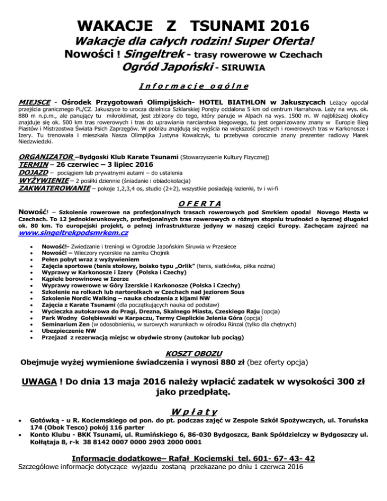 WAKACJE Z TSUNAMI 2016 Wakacje dla całych rodzin! Super Oferta! Nowości ! Singeltrek - trasy rowerowe w Czechach Ogród Japoński - SIRUWIA Informacje ogólne MIEJSCE - Ośrodek Przygotowań Olimpijskich- HOTEL BIATHLON w Jakuszycach Leżący opodal przejścia granicznego PL/CZ. Jakuszyce to urocza dzielnica Szklarskiej Poręby oddalona 5 km od centrum Harrahova. Leży na wys. ok. 880 m n.p.m., ale panujący tu mikroklimat, jest zbliżony do tego, który panuje w Alpach na wys. 1500 m. W najbliższej okolicy znajduje się ok. 500 km tras rowerowych i tras do uprawiania narciarstwa biegowego, tu jest organizowany znany w Europie Bieg Piastów i Mistrzostwa Świata Psich Zaprzęgów. W pobliżu znajdują się wyjścia na większość pieszych i rowerowych tras w Karkonosze i Izery. Tu trenowała i mieszkała Nasza Olimpijka Justyna Kowalczyk, tu przebywa corocznie znany prezenter radiowy Marek Niedzwiedzki. ORGANIZATOR –Bydgoski Klub Karate Tsunami (Stowarzyszenie Kultury Fizycznej) TERMIN – 26 czerwiec – 3 lipiec 2016 DOJAZD – pociągiem lub prywatnymi autami – do ustalenia WYŻYWIENIE – 2 posiłki dziennie (śniadanie i obiadokolacja) ZAKWATEROWANIE – pokoje 1,2,3,4 os, studio (2+2), wszystkie posiadają łazienki, tv i wi-fi OFERTA Nowość! – Szkolenie rowerowe na profesjonalnych trasach rowerowych pod Smrkiem opodal Novego Mesta w Czechach. To 12 jednokierunkowych, profesjonalnych tras rowerowych o różnym stopniu trudności o łącznej długości ok. 80 km. To europejski projekt, o pełnej infrastrukturze jedyny w naszej części Europy. Zachęcam zajrzeć na www.singeltrekpodsmrkem.cz Nowość!- Zwiedzanie i treningi w Ogrodzie Japońskim Siruwia w Przesiece Nowość! – Wieczory rycerskie na zamku Chojnik Pełen pobyt wraz z wyżywieniem Zajęcia sportowe (tenis stołowy, boisko typu „Orlik” (tenis, siatkówka, piłka nożna) Wyprawy w Karkonosze i Izery (Polska i Czechy) Kąpiele borowinowe w Izerze Wyprawy rowerowe w Góry Izerskie i Karkonosze (Polska i Czechy) Szkolenie na rolkach lub nartorolkach w Czechach nad jeziorem Sous Szkolenie Nordic Walking – nauka chodzenia z kijami NW Zajęcia z Karate Tsunami (dla początkujących nauka od podstaw) Wycieczka autokarowa do Pragi, Drezna, Skalnego Miasta, Czeskiego Raju (opcja) Park Wodny Gołębiewski w Karpaczu, Termy Cieplickie Jelenia Góra (opcja) Seminarium Zen (w odosobnieniu, w surowych warunkach w ośrodku Rinzai (tylko dla chętnych) Ubezpieczenie NW Przejazd z rezerwacją miejsc w obydwie strony (autokar lub pociąg) KOSZT OBOZU Obejmuje wyżej wymienione świadczenia i wynosi 880 zł (bez oferty opcja) UWAGA ! Do dnia 13 maja 2016 należy wpłacić zadatek w wysokości 300 zł jako przedpłatę. Wpłaty Gotówką - u R. Kociemskiego od pon. do pt. podczas zajęć w Zespole Szkół Spożywczych, ul. Toruńska 174 (Obok Tesco) pokój 116 parter Konto Klubu - BKK Tsunami, ul. Rumińskiego 6, 86-030 Bydgoszcz, Bank Spółdzielczy w Bydgoszczy ul. Kołłątaja 8, r-k 38 8142 0007 0000 2903 2000 0001 Informacje dodatkowe– Rafał Kociemski tel. 601- 67- 43- 42 Szczegółowe informacje dotyczące wyjazdu zostaną przekazane po dniu 1 czerwca 2016