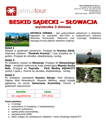 Biuro Podróży Prima Tour s.c. ul. Staszica 1/205, 25-008 Kielce tel/fax 041 344 53 29, kom. 509 222 020 e-mail: [email protected] www.primatour.pl REGON 260135098, NIP 959 17 64 282 BESKID SĄDECKI – SŁOWACJA wycieczka 3 dniowa KRYNICA GÓRSKA – jest uzdrowiskiem położonym w Beskidzie Sądeckim na wysokości 560-720m w malowniczych dolinach Słotwinki, Kryniczanki, Palecznicy oraz Czarnego. Dodatkowo otaczają Krynicę pięknie zalesione wzgórza. Dzień 1 Wyjazd w godzinach porannych. Przejazd do Krynicy Zdrój. Wyprawa szlakiem: "Dookoła Krynicy". Czas przejścia ok. 6 godzin. Przejazd do ośrodka, obiadokolacja, nocleg. Dzień 2 Po śniadaniu wyjazd na Słowację. Przejazd do Słowackiego Raju – przejście malowniczą trasą obejmującą Wąwóz Sucha Bela. Przejazd do Popradu – Park Wodny AQUACITY (pobyt 3 godz.). Powrót do ośrodka, obiadokolacja, nocleg. Dzień 3 Po śniadaniu zwiedzanie Krynicy Zdroju: Park Zdrojowy, Pijalnia Wód Mineralnych, Muzeum Nikifora, wjazd kolejką gądolową na szczyt Jaworzyny Krynickiej. Powrót w godzinach wieczornych. termin cena do uzgodnienia 370 zł/os Cena zawiera: 2 noclegi wyżywienie (2 śniadania, 2 obiadokolacje) transport autokarem, opieka pilota-przewodnika, ubezpieczenie NNW, bilety wstępu do zwiedzanych obiektów i Parku Wodnego AQUACITY