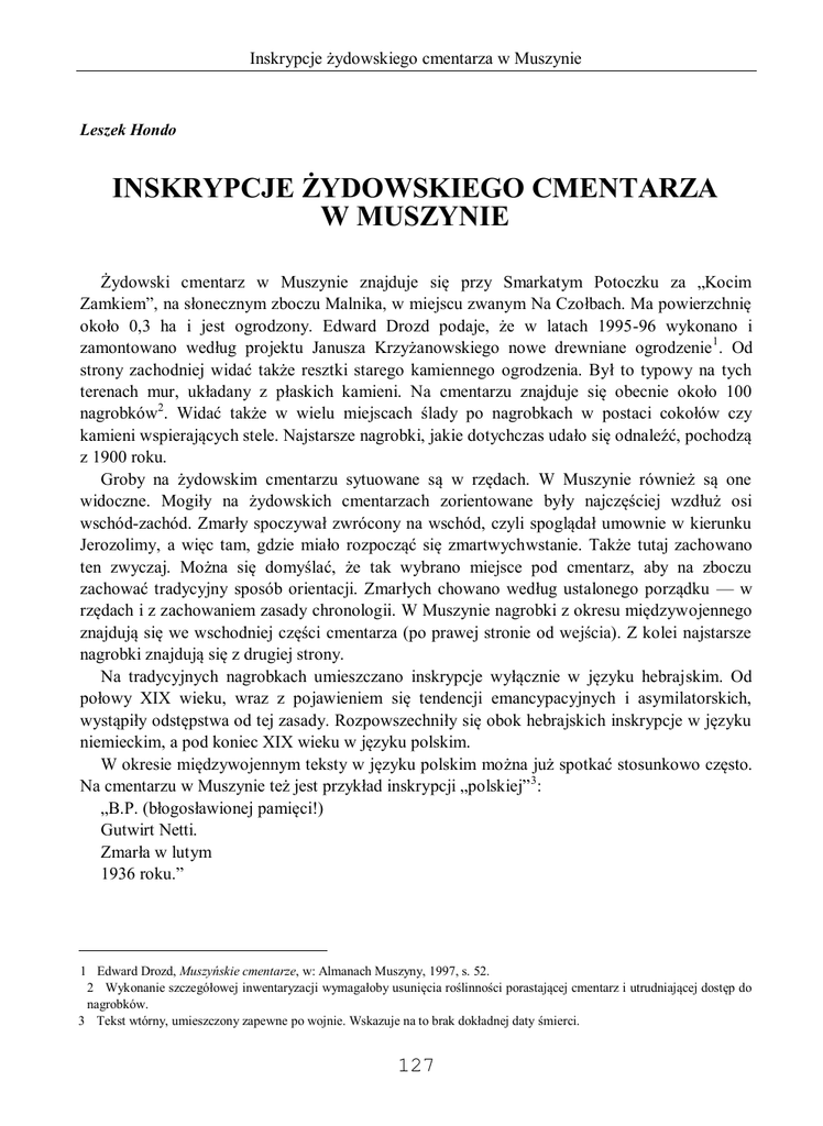 Inskrypcje żydowskiego cmentarza w Muszynie Leszek Hondo INSKRYPCJE ŻYDOWSKIEGO CMENTARZA W MUSZYNIE Żydowski cmentarz w Muszynie znajduje się przy Smarkatym Potoczku za „Kocim Zamkiem‖, na słonecznym zboczu Malnika, w miejscu zwanym Na Czołbach. Ma powierzchnię około 0,3 ha i jest ogrodzony. Edward Drozd podaje, że w latach 1995-96 wykonano i zamontowano według projektu Janusza Krzyżanowskiego nowe drewniane ogrodzenie 1. Od strony zachodniej widać także resztki starego kamiennego ogrodzenia. Był to typowy na tych terenach mur, układany z płaskich kamieni. Na cmentarzu znajduje się obecnie około 100 nagrobków2. Widać także w wielu miejscach ślady po nagrobkach w postaci cokołów czy kamieni wspierających stele. Najstarsze nagrobki, jakie dotychczas udało się odnaleźć, pochodzą z 1900 roku. Groby na żydowskim cmentarzu sytuowane są w rzędach. W Muszynie również są one widoczne. Mogiły na żydowskich cmentarzach zorientowane były najczęściej wzdłuż osi wschód-zachód. Zmarły spoczywał zwrócony na wschód, czyli spoglądał umownie w kierunku Jerozolimy, a więc tam, gdzie miało rozpocząć się zmartwychwstanie. Także tutaj zachowano ten zwyczaj. Można się domyślać, że tak wybrano miejsce pod cmentarz, aby na zboczu zachować tradycyjny sposób orientacji. Zmarłych chowano według ustalonego porządku — w rzędach i z zachowaniem zasady chronologii. W Muszynie nagrobki z okresu międzywojennego znajdują się we wschodniej części cmentarza (po prawej stronie od wejścia). Z kolei najstarsze nagrobki znajdują się z drugiej strony. Na tradycyjnych nagrobkach umieszczano inskrypcje wyłącznie w języku hebrajskim. Od połowy XIX wieku, wraz z pojawieniem się tendencji emancypacyjnych i asymilatorskich, wystąpiły odstępstwa od tej zasady. Rozpowszechniły się obok hebrajskich inskrypcje w języku niemieckim, a pod koniec XIX wieku w języku polskim. W okresie międzywojennym teksty w języku polskim można już spotkać stosunkowo często. Na cmentarzu w Muszynie też jest przykład inskrypcji „polskiej‖ 3: „B.P. (błogosławionej pamięci!) Gutwirt Netti. Zmarła w lutym 1936 roku.‖ 1 Edward Drozd, Muszyńskie cmentarze, w: Almanach Muszyny, 1997, s. 52. 2 Wykonanie szczegółowej inwentaryzacji wymagałoby usunięcia roślinności porastającej cmentarz i utrudniającej dostęp do nagrobków. 3 Tekst wtórny, umieszczony zapewne po wojnie. Wskazuje na to brak dokładnej daty śmierci. 127 Inskrypcje żydowskiego cmentarza w Muszynie Tekst większości inskrypcji ułożony jest według pewnego schematu. Wyrósł on z tradycji, ale nie był wyłącznie obowiązujący i mógł być modyfikowany. Stereotypowa forma przedstawia się w następujący sposób: 1. Formuła pogrzebowa. 2. Epitety i zwroty pochwalne obrazujące cnoty zmarłego. 3. Imię. 4. Data śmierci (czasami data pogrzebu). 5. Zakończenie. Początkiem każdej inskrypcji jest formuła pogrzebowa: „tu pochowany‖. Zazwyczaj występuje jako skrót, który jest często wkomponowany w ornament powyżej właściwej inskrypcji. Inskrypcje, oprócz pojedynczych epitetów, zawierają zwroty pochwalne. Są to najczęściej dosłowne zwroty biblijne lub talmudyczne, albo ich parafrazy. Określają one przede wszystkim cechy charakteru zmarłej osoby. Sporadycznie występują zwroty odnoszące się do wyglądu zewnętrznego. Po ciągu epitetów, a przed imieniem zmarłego, znajdują się dane dotyczące zajęcia i funkcji pełnionych w gminie oraz stopni edukacji religijnej. W Muszynie na nagrobkach występuje w postaci skrótu tytuł „Morenu‖. Jego powszechność sugeruje, że stracił swoje pierwotne znaczenie4 i stał się tytułem honorowym, nadawanym przez rabina starszym członkom gminy. Na tradycyjnych nagrobkach nie spotyka się nazwisk. Tożsamość zmarłego jest podawana w formie zależności np. Icchak, syn Joela lub Lea, córka Icchaka. Również zaznaczana była przynależność do lewitów lub kohenów. Imię ojca lub — czasami w przypadku kobiet — imię męża było jedyną wskazówką identyfikacyjną przynależności rodzinnej. Żydzi w Galicji przyjęli nazwiska rodowe zgodnie z patentem Józefa II z 28 VIII 1787 roku. Brzmienie niemieckie nazwisk było spowodowane tym, że nadawali je austriaccy urzędnicy. Nowe nazwiska tworzone były mechanicznie, często ze swoistym poczuciem humoru (na cmentarzu w Muszynie: Gutwirt — dobry gospodarz). Występują także nazwiska powstałe przez połączenie „wykluczających się‖ członów, np. Rosenzweig (Rosen — róża, Zweig — gałąź). Mimo, że nazwiska stały się obowiązkowe, mimo surowych kar, jakimi patent groził, Żydzi pozostali wierni tradycji i jeszcze w okresie międzywojennym nie było powszechnym zwyczajem umieszczanie nazwiska na nagrobkach. Także w przytoczonych poniżej inskrypcjach tylko jedna zawiera nazwisko. Na nagrobkach osób wywodzących się ze znanych rodów (przede wszystkim chasydzkich), pojawiają się imiona dalszych przodków. Dla przykładu w Muszynie na nagrobku Jehudy, syna Szmuela, zmarłego w 1900 roku, występuje zwrot: następca (dosłownie: prawnuk i wnuk) sprawiedliwego (cadyka) Icchaka Ajzyka 5, przełożonego sądu rabinackiego w Lubartowie. Niezbędnym elementem inskrypcji była data śmierci. Podaje ona dzień miesiąca (często dzień tygodnia), miesiąc i rok, który jest liczony według kalendarza żydowskiego. Innym sposobem podawania daty zgonu, który wypadał w święto, było jego oznaczenie. Kalendarz 4 Tytuł morenu został wprowadzony w XIV wieku jako potwierdzenie kwalifikacji do objęcia urzędu rabina. 5 Chodzi tutaj o Lewiego Izaaka z Berdyczowa, który działał w Lubartowie, i który był prekursorem chasydyzmu na ziemiach polskich. 128 Inskrypcje żydowskiego cmentarza w Muszynie Inskrypcje żydowskiego cmentarza w Muszynie żydowski jest oparty na syntezie systemu lunearnego z solar- nym. Żydowski rok ma 12 lub 13 mies