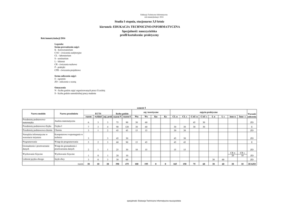 Edukacja Techniczno Informatyczna rok immatrykulacji: 2016 Studia I stopnia, stacjonarne 3,5 letnie kierunek: EDUKACJA TECHNICZNO-INFORMATYCZNA Specjalność: nauczycielska profil kształcenia: praktyczny Rok immatrykulacji 2016 Legenda: forma prowadzenia zajęć: K - konwersatorium CAU - ćwiczenia audytoryjne CL - laboratorium S - seminarium L - lektorat CR - ćwiczenia ruchowe P - praktyki CPR - ćwiczenia projektowe forma zaliczenia zajęć: E - egzamin ZO - zaliczenie z oceną Oznaczenia N - liczba godzin zajęć organizowanych przez Uczelnię S - liczba godzin samodzielnej pracy studenta semestr I Nazwa modułu Nazwa przedmiotu razem Przedmioty podstawowematematyka Analiza matematyczna Przedmioty podstawowe-fizyka ECTS liczba godzin wykład zaj. prak razem N razem S zajęcia praktyczne zaj. teoretyczne Wn Ws Kn Ks CL n CL s Ln Ls inne n Warunki Inne s zaliczenia CAU n CAU s 45 30 ZO 30 30 E 6 3 3 75 90 30 60 Fizyka I 7 3 4 90 120 30 60 30 30 Przedmioty podstawowe-chemia Chemia 3 1 2 45 45 15 15 30 30 ZO Narzędzia informatyczne w warsztacie inżyniera Komputerowe wspomaganie w technice 3 3 45 30 45 30 ZO Programowanie Wstęp do programowania 5 2 3 60 90 15 45 45 45 E Gromadzenie i przetwarzanie danych Wstęp do gromadzenia i przetwarzania danych 2 1 1 25 30 10 15 15 15 ZO Wychowanie fizyczne Wychowanie fizyczne Lektorat języka obcego Język obcy razem 1 0 1 20 10 3 0 3 30 60 30 10 20 390 475 CR n 20 100 195 0 0 165 specjalność: Edukacja Techniczno Informatyczna nauczycielska 150 75 60 30 60 30 60 CR s 10 ZO ZO 20 10 2E/6ZO Edukacja Techniczno Informatyczna rok immatrykulacji: 2016 Nazwa modułu Nazwa przedmiotu razem ECTS liczba godzin wykład zaj. prak razem N razem S zajęcia praktyczne zaj. teoretyczne Wn Ws Kn Ks CL n CL s Ln Ls inne n Warunki Inne s zaliczenia CAU n CAU s 45 30 ZO 30 30 E semestr II Przedmioty podstawoweAnaliza matematyczna matematyka Przedmioty podstawowe - fizyka Fizyka II Narzędzia informatyczne w Grafika inżynierska I warsztacie inżyniera 4 1 3 60 45 15 15 5 1 4 80 70 20 10 2 45 2 Wprowadzenie do informatyki i metod obliczeniowych zaawansowane zastosowanie arkusza kalkucyjnego Wprowadzenie do informatyki i metod obliczeniowych 30 30 15 45 15 ZO 45 15 ZO 30 30 E 2 0 2 45 15 Podstawy informatyki i systemów informatycznych 4 2 2 60 60 Programowanie Programowanie I 3 3 45 45 45 45 ZO Gromadzenie i przetwarzanie danych Gromadzenie i przetwarzanie danych I Wstęp do inżynierii oprogramowania i analizy wymagań 1 1 15 15 15 15 ZO 1 1 30 30 15 15 E 0 5 4 3 25 30 410 0 60 355 Inżynieria oprogramowania praktyka zawodowa praktyka zawodowa Lektorat języka obcego Język obcy razem 2 4 3 30 30 30 15 65 55 15 15 15 225 165 30 60 Praktyka zawodowa 120 godzin 30 60 75 60 30 60 0 0 ZO ZO 3E/7ZO semestr III Wprowadzenie do informatyki i metod obliczeniowych Algorytmy i metody programowania (struktury danych) 5 2 3 45 105 15 45 Przedmioty techniczne Podstawy nauk technicznych I 4 2 2 75 45 30 30 Programowanie Przedmioty podstawowematematyka Wprowadzenie do informatyki i metod obliczeniowych Programowanie II 4 1 3 45 75 15 15 Matematyka dyskretna 2 2 15 45 Sieci kopmuterowe i aplikacje sieciowe 5 2 3 45 95 Lektorat języka obcego Język obcy 3 0 3 30 60 Swobodnego wyboru Wykład z oferty ogólnouczelnianej typu A lub B 2 15 45 15 45 ogólne przygotowanie psychologiczno-pedagogiczne ogólne przygotowanie psychologiczno-pedagogiczne ogólne przygotowanie psychologiczno-pedagogiczne Psychologia Pedagogika Emisja głosu razem 2 0 15 ZO 45 35 15 E 30 60 E 15 45 ZO 30 60 ZO 30 60 ZO ZO 2 1 1 40 20 20 10 20 10 ZO 2 1 1 40 20 20 10 20 10 ZO 11 1 19 10 360 20 530 190 10 50 20 40 ZO 2E/8ZO 1 30 130 0 0 105 specjalność: Edukacja Techniczno Informatyczna nauczycielska 225 45 15 30 60 Edukacja Techniczno Informatyczna rok immatrykulacji: 2016 Nazwa modułu Nazwa przedmiotu razem ECTS liczba godzin wykład zaj. prak razem N razem S zajęcia praktyczne zaj. teoretyczne Wn Ws Kn Ks CL n CL s CAU n CAU s Ln Ls inne n Warunki Inne s zaliczenia semestr IV Interfejsy graficzne Elementy grafiki komputerowej 2 Wprowadzenie do informatyki i metod obliczeniowych Projektowanie aplikacji internetowych 3 Przedmioty techniczne Podstawy nauk technicznych II Przedmioty techniczne 2 20 30 20 30 ZO 0 3 30 60 30 60 ZO 4 2 2 75 45 30 30 Elektrotechnika i elektronika 5 2 3 60 90 30 30 Etapy edukacyjne Psychologia etapów edukacyjnych 2 1 1 30 30 15 15 15 15 ZO Etapy edukacyjne Pedagogika etapów edukacyjnych 2 1 1 30 30 15 15 15 15 ZO Etapy edukacyjne Praktyka pedagogiczna etapów edukacyjnych 1 0 1 0 30 Dydaktyka ogólna Dydaktyka ogólna 2 1 1 30 30 Praktyka zawodowa Praktyka zawodowa 4 0 4 0 120 Lektorat języka obcego Język obcy 3 0 3 30 60 Swobodnego wyboru Wykład z oferty ogólnouczelnianej typu A lub B 2 15 45 15 45 razem 30 320 570 125 145 2 9 0 21 45 30 15 ZO 60 E Praktyka pedagogiczna (I) = 30 godzin 20 10 10 ZO 20 ZO Praktyka zawodowa 120 godzin 30 ZO 60 E ZO 0 0 80 150 85 95 0 0 30 30 2E/9ZO semestr V Narzędzia informatyczne w warsztacie inżyniera Narzędzia informatyczne w warsztacie inżyniera Wspomaganie obliczeń inżynierskich 4 4 30 70 30 70 ZO Grafika inżynierska II 5 5 45 80 45 80 ZO Narzędzia i metody informatyki w Multimedia w edukacji warsztacie nauczyciela 3 3 30 60 30 60 ZO Modelowanie podstawowych Narzędzia i metody informatyki w zjawisk w technice i innych warsztacie nauczyciela dziedzinach wiedzy 5 5 45 80 45 80 ZO Podstawy biznesu 3 3 30 45 Dydaktyka techniki w szkole podstawowej 8 5 60 150 15 60 Wykład z oferty ogólnouczelnianej typu A lub B 2 15 45 15 45 razem 30 255 530 30 105 Wprowadzenie do ekonomii i finansów Przygotowanie w zakresie dydaktycznym Swobodnego wyboru 3 2 5 0 25 30 0 0 180 specjalność: Edukacja Techniczno Informatyczna nauczycielska 45 335 30 45 ZO 15 45 ZO 90 ZO 7ZO 45 0 0 0 0 Edukacja Techniczno Informatyczna rok immatrykulacji: 2016 Nazwa modułu Nazwa przedmiotu razem ECTS liczba godzin wykład zaj. prak razem N razem S zajęcia praktyc