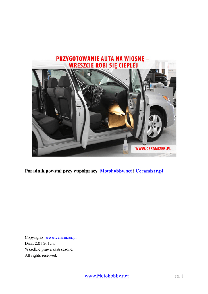 Poradnik powstał przy współpracy Motohobby.net i Ceramizer.pl Copyrights: www.ceramizer.pl Data: 2.01.2012 r. Wszelkie prawa zastrzeżone. All rights reserved. www.Motohobby.net str. 1 Wstęp Gdy dni są coraz dłuższe, temperatura zaczyna sprzyjać spacerom, a na drzewach pojawiają się zielone pąki, najwyższy czas pomyśleć o przygotowaniu naszego samochodu do sezonu letniego. Wbrew pozorom i pewnie wielu innym podobnym poradnikom, wcale nie trzeba oddawać auta w ręce fachowców, a wiele rzeczy można zrobić samemu. Najpierw dokładnie umyj pojazd W naszym klimacie, przez kilka zimowych miesięcy auto pracuje w bardzo trudnych warunkach. Zmienne temperatury dobowe, srogi mróz, opady atmosferyczne jak śnieg, deszcz lub grad, a także działalność naszych drogowców, którzy wysypują na drogi sól, mają wpływ na stan wizualny naszego pojazdu jak i w pewnym stopniu jego stan techniczny. Dlatego jednym z pierwszych kroków podczas naszego wiosennego przeglądu będzie umycie pojazdu oraz zajęcie się jego wnętrzem. Starajmy się to zrobić, gdy temperatura dobowa nie spada poniżej zera. Unikniemy dzięki temu niepotrzebnych konsekwencji związanych z zamarzniętymi zamkami czy przymarzniętymi drzwiami, a sama praca będzie po prostu dużo przyjemniejsza. Mycie wiosenne jest o tyle istotne, że pozwala usunąć nagromadzone na naszym pojeździe nieczystości. Będą to pozostałości środków do utrzymania dróg w ruchu, w tym soli drogowej czy chemicznych preparatów do rozpuszczania błota poślizgowego jak również po prostu z zwykłego brudu. Warto umyć zarówno nadwozie jak i podwozie auta poprzez oczyszczenie powłoki z zalegającej soli, która sprzyja procesom korozji. Zacznijmy od dokładnego opłukania naszego samochodu. Nie omijajmy przy tym żadnych zakamarków. Rozpoczynając od dachu, dokładnie wypłukujmy brud z: • szpar międzydrzwiowych; • kratek wlotu powietrza; • listew ozdobnych (sugerujemy strumień wody skierować zarówno od dołu jak i od góry listwy); • nadkoli oraz podwozia (jeśli mamy dostęp); • progów; • felgi wraz z oponami; • wszelkich szczelin i zakamarków (np. łączenia zderzaków z karoserią) gdzie mógł zebrać się brud. www.Motohobby.net str. 2 Jak działa myjnia samoobsługowa? Nie każdy posiada w domu specjalistyczny sprzęt (np. myjkę podciśnieniową) dlatego sugerujemy skorzystanie z coraz łatwiej dostępnych myjni samoobsługowych (tzw. bezdotykowych). Koszt będzie niski a przy tym zyskamy satysfakcję, iż sami zadbaliśmy o nasze auto oraz pewność, że wszystko zostało wykonane z odpowiednią dokładnością i uwagą. Zazwyczaj korzystanie z takich myjni kosztuje 1 zł za 1 minutę. Na dosyć dokładne umycie auta przeciętnych gabarytów powinno wystarczyć 10-12 minut. Obsługa tych myjni jest bardzo prosta, wystarczy wrzucić ilość monet która odpowiada ilości minut w przeciągu których będziemy myć auto (dla przykładu dwie monety 5 złotowe to 10-ciu minutowe mycie auta). Następnie włączamy jeden z kilku przycisków (które są podpisane). Każdy z nich do czego innego służy, np. gdy przyciśniemy przycisk (program) 1, z myjki leci zazwyczaj ciepła woda z chemią rozpuszczającą wszelki brud, przycisk 2 uaktywnia ciepłą wodę do spłukiwania itd. Co myjnia to obyczaj, dlatego w różnych myjniach dany przycisk (program) może oznaczać co innego. Po umyciu pojazdu Po dokładnym umyciu okaże się, jak zima wpłynęła na stan powłoki blacharsko-lakierniczej. Wraz z umyciem nadwozia powinniśmy dokładnie przyjrzeć się karoserii. Piasek, żwir, błoto mogły zostawić różne ślady w postaci rys i odprysków na lakierze. Należy odtłuścić te miejsca i zabezpieczyć je produktami do odprysków czy rys lakieru. Jeśli zauważymy „rude” naloty korozji, trzeba dodatkowo oczyścić te miejsca z rdzy i nałożyć powłokę ochronną (np. podkład i lakier przy użyciu malutkiego pędzelka). Wnętrze Czyszczenie wnętrza pojazdu ma na celu podnieść komfort estetyczny użytkowania pojazdu, co wcale nie jest takie bagatelne. Udowodniono, że jakość prowadzenia pojazdu uzależniona jest m.in. od samopoczucia kierowcy, na co z całą pewnością ma wpływ czystość czy zapach wewnątrz pojazdu. Postarajmy się dokładnie odkurzyć podłogę kabiny, nie omijać trudno dostępnych miejsc pod siedzeniami czy w okolicy pedałów. Nagromadzony piasek wraz z naniesioną solą i błotem pośniegowym oraz utrzymująca się na dywanikach i zapewne pod nimi wilgoć, wpływa korodująco na elementy metalowe, w tym między innymi na wewnętrzną cześć podłogi. Postarajmy się wysuszyć tapicerkę nim położymy na niej letnie dywaniki. W przypadku niewielkiej ilości wilgoci, wystarczy w słoneczny dzień odsłonić mokre elementy podłogi, włączyć nawiew gorącego powietrza „na nogi” oraz pozostawić otwarte drzwi na kilka godzin. W trudniejszych przypadkach konieczne będzie skorzystanie z dodatkowego nadmuchu ciepłego powietrza (np. „farelki” czy suszarki) lub w ostateczności skorzystanie z usług profesjonalnej firmy. www.Motohobby.net str. 3 Samo czyszczenie deski rozdzielczej, elementów drzwi itp. pozostawiamy Państwa fantazji. Jest dostępnych wiele preparatów przystosowanych do tego celu oraz gustu zapachowego nabywcy, więc każdy znajdzie coś dla siebie. Ważne jednak, abyśmy zadbali o nasze bezpieczeństwo na drodze, czyli o widoczność, poprzez umycie szyb (zarówno od wewnętrznej jak i zewnętrznej strony). Za wilgoć jak i zapach w kabinie odpowiada tzw. filtr kabinowy oraz klimatyzacyjny. Jego zadaniem jest zbieranie zanieczyszczeń zewnętrznych przez dostaniem się do obiegu układu wentylacyjnego i klimatyzacji. Jest on zazwyczaj umieszczony w podszybiu naszego autka. Aby go wymienić należy po otwarciu maski, usunąć plastikową kratkę zabezpieczającą umieszczoną najczęściej po stronie pasażera. Przy okazji możemy odgrzybić nasz