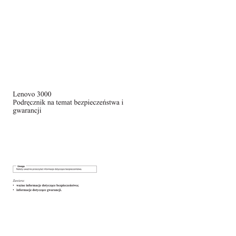 Lenovo 3000 Podręcznik na temat bezpieczeństwa i gwarancji Uwaga Należy uważnie przeczytać informacje dotyczące bezpieczeństwa. Zawiera: v ważne informacje dotyczące bezpieczeństwa; v informacje dotyczące gwarancji. Lenovo 3000 Podręcznik na temat bezpieczeństwa i gwarancji Uwaga Przed użyciem produktu przeczytaj Rozdział 1, “Ważne informacje dotyczące bezpieczeństwa”, na stronie 1. Wydanie drugie (Sierpień 2006) © Copyright Lenovo 2006. Wszelkie prawa zastrzeżone. Spis treści Przeczytaj zanim zaczniesz . . . . . Rozdział 1. Ważne informacje dotyczące bezpieczeństwa . . . . . . . . . Zdarzenia wymagające natychmiastowej reakcji Ogólne wytyczne dotyczące bezpieczeństwa . Naprawa . . . . . . . . . . . Kable zasilające i zasilacze . . . . . Przedłużacze i urządzenia powiązane . . Wtyczki i gniazda zasilające . . . . . Baterie i akumulatory . . . . . . . Ciepło i wentylacja produktu . . . . . © Copyright Lenovo 2006 . . v . . 1 . . 1 . . 2 . . 2 . . 3 . . 4 . . 4 . . 5 . . 5 Bezpieczeństwo napędów CD i DVD . . . . 6 Dodatkowe informacje dotyczące bezpieczeństwa . 6 Oświadczenie o zgodności z normami dla produktów laserowych . . . . . . . . 10 Rozdział 2. Informacje dotyczące gwarancji Warunki Ograniczonej Gwarancji Lenovo . . . Część 1 - Warunki ogólne . . . . . . . Część 2 - Warunki specyficzne dla poszczególnych krajów . . . . . . . . Część 3 - Informacje gwarancyjne . . . . . Załącznik dotyczący gwarancji dla Meksyku . . 13 13 13 17 32 37 iii iv Lenovo 3000 Podręcznik na temat bezpieczeństwa i gwarancji Przeczytaj zanim zaczniesz Komputera ani żadnej części rozgrzewającej się podczas działania nie należy trzymać przez dłuższy czas na kolanach ani w kontakcie z inną częścią ciała, gdy komputer jest włączony albo gdy ładuje się akumulator. Zasilacz podłączony do gniazda elektrycznego i komputera, wytwarza ciepło. Nie powinien pozostawać w kontakcie z jakąkolwiek częścią ciała podczas używania. Nie należy go używać do ogrzewania ciała. Dłuższy kontakt z ciałem, nawet przez ubranie, może spowodować oparzenie skóry. Kable zasilacza, myszy, klawiatury, drukarki czy jakiegokolwiek innego urządzenia elektronicznego czy linie komunikacyjne należy ułożyć tak, aby nie przycisnąć ich komputerem ani innym przedmiotem, przydepnąć, potknąć się o nie ani podziałać na nie w żaden inny sposób mogący zakłócić pracę komputera. Działanie na kable dużą siłą może spowodować ich uszkodzenie lub zerwanie. Aby zapobiec uszkodzeniu dysku twardego i utracie danych, przed przenoszeniem komputera naciśnij klawisze Fn+F4, aby przełączyć go w tryb gotowości lub wyłączyć. Przed przenoszeniem upewnij się, że świeci się (na zielono) kontrolka statusu gotowości. Na komputerze, ekranie oraz na urządzeniach zewnętrznych nie wolno kłaść żadnych ciężkich przedmiotów; takich przedmiotów nie wolno też rzucać na komputer, przesuwać ich po nim ani przyciskać ich do komputera. © Copyright Lenovo 2006 v Wskazane jest przenoszenie komputera w dobrej gatunkowo torbie z wkładkami ochronnymi, zapewniającej bezpieczeństwo komputera podczas transportu. Komputera nie wolno wkładać do ciasno upakowanej walizki lub torby. W pobliżu komputera nie wolno trzymać żadnych płynów, aby nie wylały się one na komputer, a także nie wolno zbliżać się z nim do wody, aby uniknąć niebezpieczeństwa porażenia prądem elektrycznym. vi Lenovo 3000 Podręcznik na temat bezpieczeństwa i gwarancji Rozdział 1. Ważne informacje dotyczące bezpieczeństwa Uwaga Należy uważnie przeczytać informacje dotyczące bezpieczeństwa. Niniejsze informacje pomagają bezpiecznie korzystać z komputera osobistego notebook. Należy zachować wszelkie informacje dołączone do komputera i stosować się do nich. Informacje zamieszczone w niniejszym dokumencie nie wpływają ani na warunki zawarte w umowie nabycia, ani na Warunki Ograniczonej Gwarancji Lenovo. Bezpieczeństwo klienta jest bardzo ważne. Nasze produkty są projektowane tak, aby były skuteczne i bezpieczne w użytkowaniu. Jednak komputery osobiste są urządzeniami elektronicznymi. Kable zasilające, zasilacze i inne elementy mogą stanowić potencjalne zagrożenie bezpieczeństwa i przy niewłaściwym użytkowaniu mogą spowodować obrażenia lub szkody materialne. Aby zmniejszyć to zagrożenie, należy postępować zgodnie z instrukcjami dołączonymi do produktu, przestrzegać ostrzeżeń znajdujących się na produkcie i w instrukcjach obsługi oraz przejrzeć dokładnie informacje zawarte w niniejszym dokumencie. Uważne stosowanie się do informacji zawartych w niniejszym dokumencie i dostarczonych wraz z produktem pomoże ochronić się przed niebezpieczeństwem i utworzyć bezpieczne środowisko pracy z komputerem. Uwaga: Informacje te zawierają odniesienia do zasilaczy i baterii. Oprócz komputerów notebook, niektóre dostarczane produkty, takie jak głośniki i monitory, są wyposażone w zewnętrzny zasilacz. Do nich właśnie odnoszą się informacje z tego rozdziału. Ponadto w komputerze może znajdować się wewnętrzna bateria wielkości monety zapewniająca zasilanie zegarowi systemowemu w czasie, gdy komputer jest wyłączony, dlatego uwagi związane z baterią i dotyczące bezpieczeństwa odnoszą się do wszystkich komputerów. Zdarzenia wymagające natychmiastowej reakcji Produkty mogą ulec uszkodzeniu wskutek niewłaściwego użytkowania lub zaniedbania. Niektóre uszkodzenia są poważne i wymagają, aby zaprzestać używania produktu do czasu jego przeglądu oraz, jeśli niezbędna okaże się naprawa, do czasu jej wykonania przez autoryzowany serwis. Podobnie jak na każde urządzenie elektroniczne, na produkt należy zwracać szczególną uwagę, gdy jest on włączony. W bardzo rzadkich przypadkach można poczuć jakiś zapach, zauważyć smugę dymu lub iskrzenie wydobywające się z maszyny. Czase