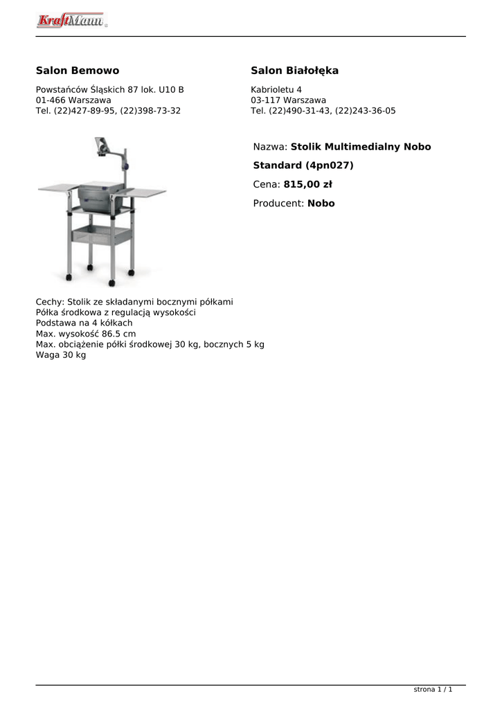 Salon Bemowo Salon Białołęka Powstańców Śląskich 87 lok. U10 B 01-466 Warszawa Tel. (22)427-89-95, (22)398-73-32 Kabrioletu 4 03-117 Warszawa Tel. (22)490-31-43, (22)243-36-05 Nazwa: Stolik Multimedialny Nobo Standard (4pn027) Cena: 815,00 zł Producent: Nobo Cechy: Stolik ze składanymi bocznymi półkami Półka środkowa z regulacją wysokości Podstawa na 4 kółkach Max. wysokość 86.5 cm Max. obciążenie półki środkowej 30 kg, bocznych 5 kg Waga 30 kg strona 1 / 1 Powered by TCPDF (www.tcpdf.org)