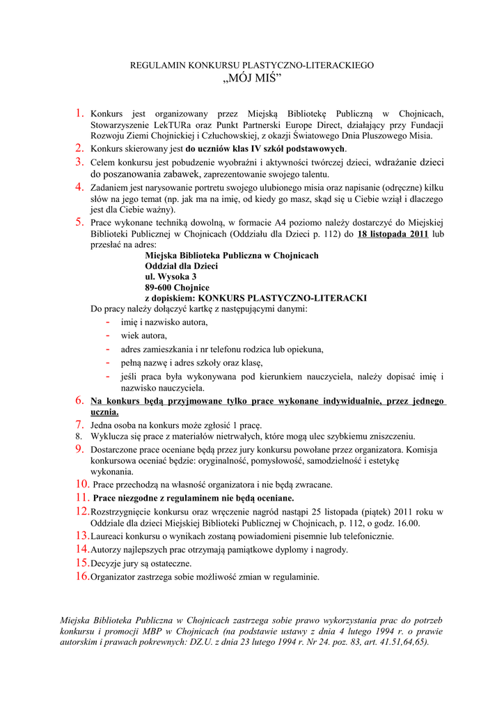 REGULAMIN KONKURSU PLASTYCZNO-LITERACKIEGO „MÓJ MIŚ” 1. Konkurs jest organizowany przez Miejską Bibliotekę Publiczną w Chojnicach, Stowarzyszenie LekTURa oraz Punkt Partnerski Europe Direct, działający przy Fundacji Rozwoju Ziemi Chojnickiej i Człuchowskiej, z okazji Światowego Dnia Pluszowego Misia. 2. Konkurs skierowany jest do uczniów klas IV szkół podstawowych. 3. Celem konkursu jest pobudzenie wyobraźni i aktywności twórczej dzieci, wdrażanie dzieci do poszanowania zabawek, zaprezentowanie swojego talentu. 4. Zadaniem jest narysowanie portretu swojego ulubionego misia oraz napisanie (odręczne) kilku słów na jego temat (np. jak ma na imię, od kiedy go masz, skąd się u Ciebie wziął i dlaczego jest dla Ciebie ważny). 5. Prace wykonane techniką dowolną, w formacie A4 poziomo należy dostarczyć do Miejskiej Biblioteki Publicznej w Chojnicach (Oddziału dla Dzieci p. 112) do 18 listopada 2011 lub przesłać na adres: Miejska Biblioteka Publiczna w Chojnicach Oddział dla Dzieci ul. Wysoka 3 89-600 Chojnice z dopiskiem: KONKURS PLASTYCZNO-LITERACKI Do pracy należy dołączyć kartkę z następującymi danymi: - imię i nazwisko autora, - wiek autora, - adres zamieszkania i nr telefonu rodzica lub opiekuna, - pełną nazwę i adres szkoły oraz klasę, - jeśli praca była wykonywana pod kierunkiem nauczyciela, należy dopisać imię i nazwisko nauczyciela. 6. Na konkurs będą przyjmowane tylko prace wykonane indywidualnie, przez jednego ucznia. 7. Jedna osoba na konkurs może zgłosić 1 pracę. 8. Wyklucza się prace z materiałów nietrwałych, które mogą ulec szybkiemu zniszczeniu. 9. Dostarczone prace oceniane będą przez jury konkursu powołane przez organizatora. Komisja konkursowa oceniać będzie: oryginalność, pomysłowość, samodzielność i estetykę wykonania. 10. Prace przechodzą na własność organizatora i nie będą zwracane. 11. Prace niezgodne z regulaminem nie będą oceniane. 12. Rozstrzygnięcie konkursu oraz wręczenie nagród nastąpi 25 listopada (piątek) 2011 roku w Oddziale dla dzieci Miejskiej Biblioteki Publicznej w Chojnicach, p. 112, o godz. 16.00. 13. Laureaci konkursu o wynikach zostaną powiadomieni pisemnie lub telefonicznie. 14. Autorzy najlepszych prac otrzymają pamiątkowe dyplomy i nagrody. 15. Decyzje jury są ostateczne. 16. Organizator zastrzega sobie możliwość zmian w regulaminie. Miejska Biblioteka Publiczna w Chojnicach zastrzega sobie prawo wykorzystania prac do potrzeb konkursu i promocji MBP w Chojnicach (na podstawie ustawy z dnia 4 lutego 1994 r. o prawie autorskim i prawach pokrewnych: DZ.U. z dnia 23 lutego 1994 r. Nr 24. poz. 83, art. 41.51,64,65).