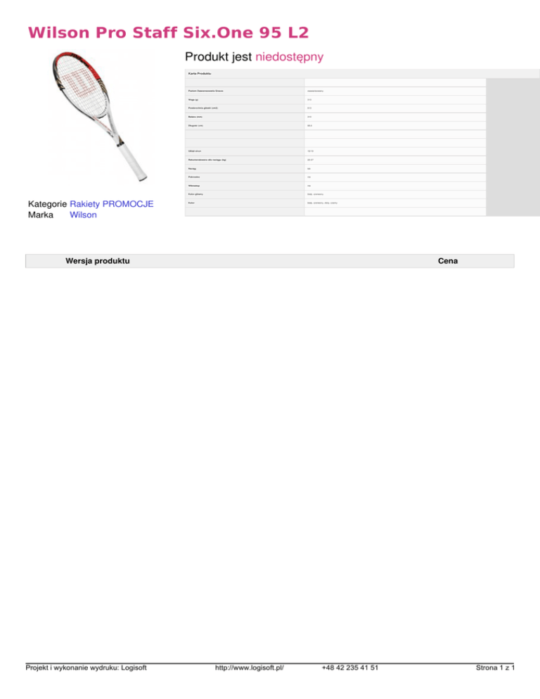 Wilson Pro Staff Six.One 95 L2 Produkt jest niedostępny Karta Produktu Kategorie Rakiety PROMOCJE Marka Wilson Poziom Zaawansowania Gracza zaawansowany Waga (g) 313 Powierzchnia główki (cm2) 613 Balans (mm) 310 Długość (cm) 68,6 Układ strun 16/19 Rekomendowana siła naciągu (kg) 22-27 Naciąg tak Pokrowiec nie Wibrastop nie Kolor główny biały, czerwony Kolor biały, czerwony, złoty, czarny Wersja produktu Projekt i wykonanie wydruku: Logisoft Powered by TCPDF (www.tcpdf.org) Cena http://www.logisoft.pl/ +48 42 235 41 51 Strona 1 z 1