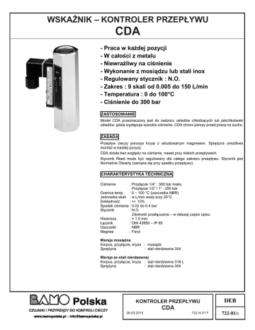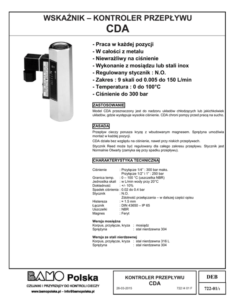 WSKAŹNIK – KONTROLER PRZEPŁYWU CDA - Praca w każdej pozycji - W całości z metalu - Niewrażliwy na ciśnienie - Wykonanie z mosiądzu lub stali inox - Regulowany stycznik : N.O. - Zakres : 9 skali od 0.005 do 150 L/min - Temperatura : 0 do 100°C - Ciśnienie do 300 bar ZASTOSOWANIE Model CDA przeznaczony jest do nadzoru układów chłodzących lub jakichkolwiek układów, gdzie występuje wysokie ciśnienie. CDA chroni pompy przed pracą na sucho. ZASADA Przepływ cieczy porusza kryzę z wbudowanym magnesem. Sprężyna umożliwia montaż w każdej pozycji. CDA działa bez względu na ciśnienie, nawet przy niskich przepływach. Stycznik Reed może być regulowany dla całego zakresu przepływu. Stycznik jest Normalnie Otwarty (zamyka się przy spadku przepływu). CHARAKTERYSTYKA TECHNICZNA Ciśnienie : Przyłącze 1/4” : 300 bar maks. Przyłącze 1/2” i 1” : 250 bar Granica temp. : 0 – 100 °C (uszczelka NBR) Jednostka skali : w L/min wody przy 20°C Dokładność : +/- 10% Spadek ciśnienia : 0.02 do 0.4 bar Stycznik : N.O. Zdolność przełączania – w dalszej części opisu Histereza : ≈ 1.5 mm Łącznik : DIN 43650 – IP 65 Uszczelki : NBR Magnes : Feryt Wersja mosiężna Korpus, przyłącze, kryza : mosiądz Sprężyna : stal nierdzewna 304 Wersja ze stali nierdzewnej Korpus, przyłącze, kryza : stal nierdzewna 316 L Sprężyna : stal nierdzewna 304 KONTROLER PRZEPŁYWU DEB CDA 26-03-2015 722 I4 01 F 722-01/1 STYCZNIKI : Opis i parametry techniczne Uwaga : Stycznik Reed jest w zamontowany w obudowie poliamidowej. Należy chronić przed pęknięciem. Regulacja poprzez przesuwanie stycznika wzdłuż prowadnicy. Po otrzymaniu wymaganej pozycji stycznik dokręcić śrubokrętem. Łącznik typu DIN 43650, IP 65. Stycznik N.O., zamykany przy spadku przepływu Przyłącze 1” : 230 V / 1 A / 50 VA Styczniki typu switch (opcja) Przyłącze 1/2”: Przyłącze 1/4”: Przyłącze 1/2” i 1” : 230 V / 3 A / 60 VA 200 V / 1 A / 20 VA 250 V / 1/.5 A / 50 VA Strefa Ex (opcja); stycznik ATEX, EEx m IIC T6 Przyłącze 1/4”: Przyłącze 1/2” i 1” : 200 V / 1 A / 20 VA Switch : 250 V /1 A / 30 VA N.O. : 250 V / 2 A/ 60 VA KODY PRODUKTU I NUMERY REFERENCYJNE Typ Przyłącze Kod Mosiądz AISI 316 Zakres L D Masa L/min H2O [ mm ] [ mm ] [g] CDA 01 722 100 722 200 1/4” 0,005 – 0,060 65 17 140 CDA 02 722 102 722 202 1/4” 0,04 – 0,13 65 17 140 CDA 06 722 106 722 206 1/4” 0,1 – 0,6 65 17 140 CDA 3 722 108 722 208 1/4” 0,5 – 3 65 17 140 CDA 7 722 127 722 227 1/2” 2–7 90 31 350 CDA 20 722 129 722 229 1/2” 4 – 20 90 31 350 CDA 45 722 133 722 233 1” 15 – 45 130 47 1050 CDA 90 722 136 722 236 1” 30 – 90 130 47 1050 CDA 150 722 139 722 239 1” 60 - 150 130 47 1050 Skale specjalne : sprężone powietrze Dostępne dla 1 bar abs. Przy 20 °C Przyłącze 1/4” 1/2” 1” Zakres NL/min Powietrze 0.6 … 2.2 1.7 … 6 2.5 … 8 3 … 12 3 … 22 7 … 24 12 … 34 16 … 56 20 … 80 2.5 … 10 5.5 … 20 8 … 30 10 … 35 24 … 90 55 … 220 65 … 240 80 … 300 140 … 525 60 … 180 100 … 300 200 … 650 MONTAŻ Seria CDA jest przeznaczona do montażu w rurociągach hydraulicznych w pozycji pionowej i poziomej. Ciecz nie może zawierać cząstek stałych, zalecamy montaż odpowiedniego filtra przed wlotem. Kontroler musi być zamontowany z dala od działania pola magnetycznego. Jakiekolwiek części zawierające żelazo muszą być umieszczone na minimalną odległość 10 cm od stycznika. Należy stosować się do podanej zdolności wyłączania. Możliwe jest zastosowanie przekaźnika wzmacniającego (ES2001); prosimy o zapoznanie się z kartą produktu 250-02. Ustawienie punktu styku : na froncie urządzenia. KONTROLER PRZEPŁYWU DEB CDA 26-03-2015 722 I4 01 F 722-01/2