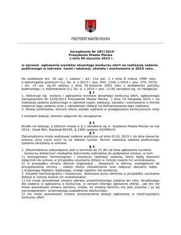 Zarządzenie Nr 187/2015 Prezydenta Miasta Płocka z dnia 09 stycznia 2015 r. w sprawie ogłoszenia wyników otwartego konkursu ofert na realizację zadania publicznego w zakresie nauki i edukacji, oświaty i wychowania w 2015 roku. Na podstawie art. 30 ust. 1 ustawy i art. 11a ust. 3 z dnia 8 marca 1990 roku o samorządzie gminnym (t.j. Dz. U. z 2013 r. poz. 594, 1318, z 2014 r. poz. 379, 1072) i art. 15 ust. 2g-2h ustawy z dnia 24 kwietnia 2003 roku o działalności pożytku publicznego i o wolontariacie (t.j. Dz. U. z 2014 r. poz. 1118) zarządza się, co następuje: §1 1. Dokonuje się wyboru i ogłoszenia wyników otwartego konkursu ofert, ogłoszonego Zarządzeniem Nr 5220/2014 Prezydenta Miasta Płocka z dnia 19 listopada 2014 r. na realizację zadania publicznego w zakresie nauki, edukacji, oświaty i wychowania w formie wsparcia tego zadania wraz z udzieleniem dotacji na dofinansowanie jego realizacji. 2. Wykaz podmiotów, których oferty zostały wybrane w postępowaniu konkursowym wraz z kwotami dotacji, stanowi załącznik do zarządzenia. §2 Środki na dotacje, o których mowa w § 1 określone są w budżecie Miasta Płocka na rok 2014, Dział 801, Rozdział 80195, § 2360 zadanie 03/WEK/G. §3 Zleceniobiorca może realizować zadanie publiczne od dnia 02.01.2015 r. do dnia zawarcia umowy, przy czym czyni to na własne ryzyko. Termin realizacji zadania publicznego zostanie określony w umowie. §4 1. Zleceniobiorca zobowiązany jest w terminie do 21 dni od dnia ogłoszenia wyników konkursu dostarczyć niezbędne dokumenty potrzebne do podpisania umowy, w tym: 1) skorygowany harmonogram i kosztorys realizacji zadania, które będą stanowić załączniki do umowy w przypadku uzyskania dotacji w niższej kwocie niż wnioskowana, 2) w przypadku zmiany danych organizacji , zawartych w ofercie, niezbędnych do przygotowania umowy , należy złożyć oświadczenie oraz załączyć aktualny odpis z Krajowego Rejestru Sądowego, innego rejestru lub ewidencji. 2. Korekta harmonogramu i kosztorysu dokonana przez oferenta w przypadku uzyskania dotacji w niższej kwocie niż wnioskowana: 1) nie może powodować zmiany zakresu przedmiotowego zadania ani celu, określonego dla zadania w ogłoszeniu o konkursie, w ramach którego zgłoszono ofertę , jak też nie może powodować zmiany terminu, chyba, że zmiana terminu nie jest znaczna i za jej wprowadzeniem przemawiają uzasadnione okoliczności. 2) nie może powodować zmiany przeznaczenia dotacji ogłoszonej w rozstrzygnięciu konkursu ofert. §5 Ogłoszenie o konkursie publikuje się poprzez jego zamieszczenie: 1) w Biuletynie Informacji Publicznej; 2) na tablicy ogłoszeń Urzędu Miasta Płocka; 3) na stronie internetowej Miasta Płocka www.plock.eu/cwop. §6 Wykonanie zarządzenia powierza się Zastępcy Prezydenta Miasta Płocka ds. Polityki Społecznej. §7 Zarządzenie wchodzi w życie z dniem podpisania. Prezydent Miasta Płocka /-/ Andrzej Nowakowski Załącznik nr 1 do Zarządzenia Nr 187/2015 Prezydenta Miasta Płocka z dnia 09 stycznia 2015 r. Lp. 1. 2. 3. 4. 5. wnioskodawca Tytuł zadania Stowarzyszenie Rodziców Nauczycieli i Przyjaciół Szkoły Podstawowej nr 12 w Płocku pod nazwą ,,Szkoła pod Brzozami” Od myślenia do tworzenia – pomóżmy dzieciom rozwinąć pasje. Projekt edukacyjny dla dzieci szczególnie uzdolnionych – Stowarzyszenie Inicjatyw DELTAKLUB. Edukacyjnych ,,Delta” Projekty: ,,Szkoła wspierająca uzdolnienia” oraz ,,Przedszkole wspierające uzdolnienia” Towarzystwo Wychowanków , Wakacyjne warsztaty Wychowawców, i Przyjaciół matematyczno – Gimnazjum i Liceum im. Marszałka informatyczne dla Stanisława Małachowskiego w uczniów płockich szkół Płocku średnich wybitnie uzdolnionych w dziedzinie matematyki. Klub Inteligencji Katolickiej Razem Płockie skarby piśmiennictwawarsztaty. Kwota udzielonej dotacji w złotych 11.000,00 58.000,00 16.000,00 7.000,00 8.000,00 100.000,00