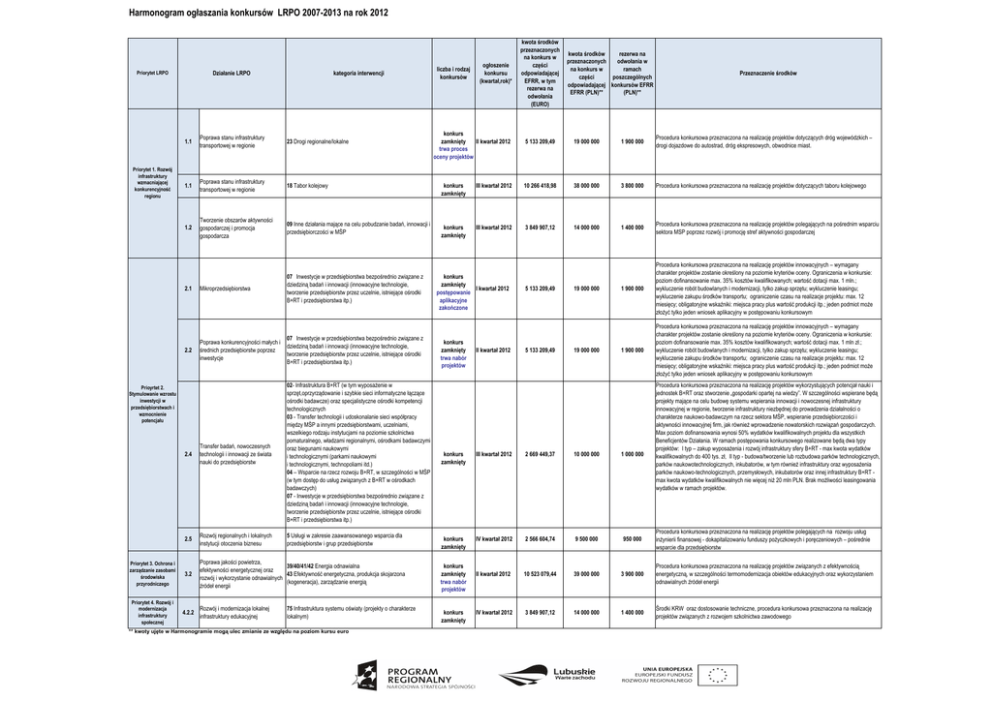 Harmonogram ogłaszania konkursów w ramach LRPO na rok 2012