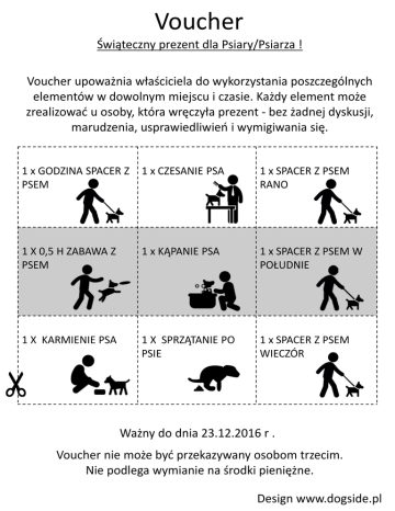 Voucher Świąteczny prezent dla Psiary/Psiarza ! Voucher upoważnia właściciela do wykorzystania poszczególnych elementów w dowolnym miejscu i czasie. Każdy element może zrealizować u osoby, która wręczyła prezent - bez żadnej dyskusji, marudzenia, usprawiedliwień i wymigiwania się. 1 x GODZINA SPACER Z PSEM 1 x CZESANIE PSA 1 x SPACER Z PSEM RANO 1 X 0,5 H ZABAWA Z PSEM 1 x KĄPANIE PSA 1 x SPACER Z PSEM W POŁUDNIE 1 X KARMIENIE PSA 1 X SPRZĄTANIE PO PSIE 1 x SPACER Z PSEM WIECZÓR Ważny do dnia 23.12.2016 r . Voucher nie może być przekazywany osobom trzecim. Nie podlega wymianie na środki pieniężne. Design www.dogside.pl