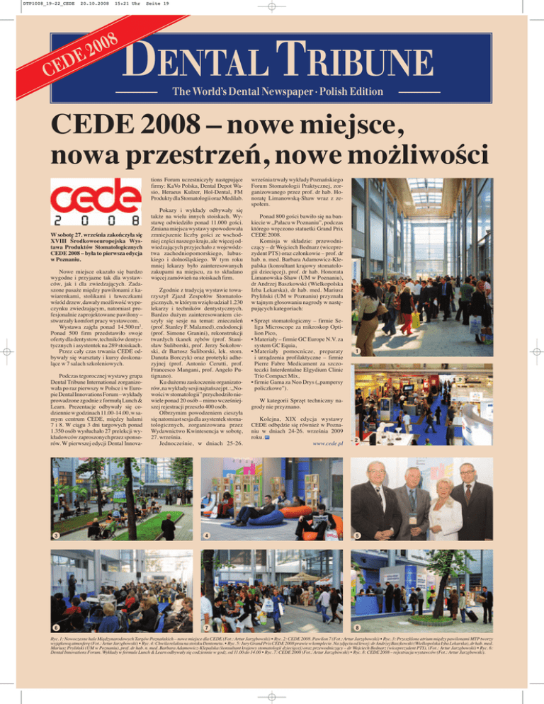 DTP1008_19-22_CEDE 20.10.2008 15:21 Uhr 8 0 0 2 E D E C Seite 19 DENTAL TRIBUNE The World’s Dental Newspaper · Polish Edition CEDE 2008 – nowe miejsce, nowa przestrzeń, nowe możliwości tions Forum uczestniczyły następujące firmy: KaVo Polska, Dental Depot Wasio, Heraeus Kulzer, Hol-Dental, FM Produkty dla Stomatologii oraz Medilab. W sobotę 27. września zakończyła się XVIII Środkowoeuropejska Wystawa Produktów Stomatologicznych CEDE 2008 – była to pierwsza edycja w Poznaniu. Nowe miejsce okazało się bardzo wygodne i przyjazne tak dla wystawców, jak i dla zwiedzających. Zadaszone pasaże między pawilonami z kawiarenkami, stolikami i ławeczkami wśród drzew, dawały możliwość wypoczynku zwiedzającym, natomiast profesjonalnie zaprojektowane pawilony – stwarzały komfort pracy wystawcom. Wystawa zajęła ponad 14.500 m2. Ponad 500 firm przedstawiło swoje oferty dla dentystow, techników dentystycznych i asystentek na 289 stoiskach. Przez cały czas trwania CEDE odbywały się warsztaty i kursy doskonalące w 7 salach szkoleniowych. Podczas tegorocznej wystawy grupa Dental Tribune International zorganizowała po raz pierwszy w Polsce i w Europie Dental Innovations Forum – wykłady prowadzone zgodnie z formułą Lunch & Learn. Prezentacje odbywały się codziennie w godzinach 11.00-14.00, w samym centrum CEDE, między halami 7 i 8. W ciągu 3 dni targowych ponad 1.350 osób wysłuchało 27 prelekcji wykładowców zaproszonych przez sponsorów. W pierwszej edycji Dental Innova- Pokazy i wykłady odbywały się także na wielu innych stoiskach. Wystawę odwiedziło ponad 11.000 gości. Zmiana miejsca wystawy spowodowała zmniejszenie liczby gości ze wschodniej części naszego kraju, ale więcej odwiedzających przyjechało z województwa zachodniopomorskiego, lubuskiego i dolnośląskiego. W tym roku mniej lekarzy było zainteresowanych zakupami na miejscu, za to składano więcej zamówień na stoiskach firm. Zgodnie z tradycją wystawie towarzyszył Zjazd Zespołów Stomatologicznych, w którym wzięło udział 1.230 lekarzy i techników dentystycznych. Bardzo dużym zainteresowaniem cieszyły się sesje na temat: znieczuleń (prof. Stanley F. Malamed), endodoncji (prof. Simone Granini), rekonstrukcji twardych tkanek zębów (prof. Stanisław Suliborski, prof. Jerzy Sokołowski, dr Bartosz Suliborski, lek. stom. Danuta Borczyk) oraz protetyki adhezyjnej (prof. Antonio Cerutti, prof. Francesco Mangani, prof. Angelo Putignano). Ku dużemu zaskoczeniu organizatorów, na wykłady sesji najtańszej pt. :„Nowości w stomatologii” przychodziło niewiele ponad 20 osób – mimo wcześniejszej rejestracji przeszło 400 osób. Olbrzymim powodzeniem cieszyła się natomiast sesja dla asystentek stomatologicznych, zorganizowana przez Wydawnictwo Kwintesencja w sobotę, 27. września. Jednocześnie, w dniach 25-26. września trwały wykłady Poznańskiego Forum Stomatologii Praktycznej, zorganizowanego przez prof. dr hab. Honoratę Limanowską-Shaw wraz z zespołem. Ponad 800 gości bawiło się na bankiecie w „Pałacu w Poznaniu”, podczas którego wręczono statuetki Grand Prix CEDE 2008. Komisja w składzie: przewodniczący – dr Wojciech Bednarz (wiceprezydent PTS) oraz członkowie – prof. dr hab. n. med. Barbara Adamowicz-Klepalska (konsultant krajowy stomatologii dziecięcej), prof. dr hab. Honorata Limanowska-Shaw (UM w Poznaniu), dr Andrzej Baszkowski (Wielkopolska Izba Lekarska), dr hab. med. Mariusz Pryliński (UM w Poznaniu) przyznała w tajnym głosowaniu nagrody w następujących kategoriach: • Sprzęt stomatologiczny – firmie Seliga Microscope za mikroskop Optilion Pico, • Materiały – firmie GC Europe N.V. za system GC Equia, • Materiały pomocnicze, preparaty i urządzenia profilaktyczne – firmie Pierre Fabre Medicament za szczoteczki Interdentalne Elgydium Clinic Trio Compact Mix, • firmie Gama za Neo Drys („pampersy policzkowe”). 1 W kategorii Sprzęt techniczny nagrody nie przyznano. Kolejna, XIX edycja wystawy CEDE odbędzie się również w Poznaniu w dniach 24-26. września 2009 roku. DT www.cede.pl 2 3 4 5 6 7 8 Ryc. 1: Nowoczesne hale Międzynarodowych Targów Poznańskich – nowe miejsce dla CEDE (Fot.: Artur Jarzębowski) • Ryc. 2: CEDE 2008. Pawilon 7 (Fot.: Artur Jarzębowski) • Ryc. 3: Przeszklone atrium między pawilonami MTP tworzy wyjątkową atmosferę (Fot.: Artur Jarzębowski) • Ryc. 4: Chwila relaksu na stoisku Dentonetu. • Ryc. 5: Jury Grand Prix CEDE 2008 prawie w komplecie. Na zdjęciu od lewej: dr Andrzej Baszkowski (Wielkopolska Izba Lekarska), dr hab. med. Mariusz Pryliński (UM w Poznaniu), prof. dr hab. n. med. Barbara Adamowicz-Klepalska (konsultant krajowy stomatologii dziecięcej) oraz przewodniczący – dr Wojciech Bednarz (wiceprezydent PTS), (Fot.: Artur Jarzębowski) • Ryc. 6: Dental Innovations Forum. Wykłady w formule Lunch & Learn odbywały się codziennie w godz. od 11.00 do 14.00 • Ryc. 7: CEDE 2008 (Fot.: Artur Jarzębowski) • Ryc. 8: CEDE 2008 – rejestracja wystawców (Fot.: Artur Jarzębowski).
