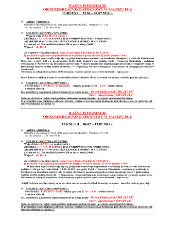 WAŻNE INFORMACJE OBÓZ REKREACYJNO-SPORTOWY W MAUSZU 2016 TURNUS I : 25.06 – 04.07 2016 r. ADRES OŚRODKA: Ośrodek wypoczynkowy DAL-SOL nad jeziorem MAUSZ , Parchowo 77-124 tel. do ośrodka : 0 58 684 40 41 MIEJSCE I GODZINA WYJAZDU: Wyjazd dnia 25.06.2016r. ( sobota ) ZBIÓRKA : GODZ. 10.00 PRZY HALI WIDOWISKOWO - SPORTOWEJ AKADEMII WYCHOWANIA FIZYCZNEGO I SPORTU W GDAŃSKU ( wjazd od ul. Grunwaldzkiej około 200 m przed stacją Shell ) Wyjazd : ok. 10.30 Ze względów organizacyjnych : sugerowany dzień odwiedzin to 03.07.2016 r. tj. niedziela w godzinach popołudniowych najlepiej w porze obiadu tj. około godziny 14.00. W tym dniu zajęcia odbywają się wg. programu obozowego tzn .: po śniadaniu planujemy wyjście do Kościoła na Mszę Św. o godz.11.30 , a po powrocie (13.30-14.00) obiad i o ok. godziny 16.00 – Obozowa Olimpiada – rodzinna rywalizacja w Parchowie na obiektach sportowych( w miarę możliwości organizacyjnych zostanie rozegrany mecz w piłkę nożną rodzice kontra kadra obozowa) . <> Organizację Obozowej Olimpiady uzależniamy od sprzyjających warunków pogodowych. Wieczorem po kolacji około godziny 20.00 planujemy wspólne ognisko z pieczeniem kiełbasek – zapraszamy! Jeżeli Państwo mieliby ochotę to na ośrodku można zamówić obiad dzwoniąc na numer ośrodka podany powyżej. MIEJSCE I GODZINA POWROTU : Powrót dnia : 04.07.2016 r. poniedziałek - między godziną 13.45 – 14.15 - odbiór dzieci z miejsca zbiórki. Tel. kontaktowy z trenerami odpowiedzialnymi za naszą grupę Paweł Chybczyński 502 283 597 Piotr Staszkiewicz 609 609 435 Podczas odwiedzin rodzic musi podpisać dokument potwierdzający przejęcie opieki nad dzieckiem. W przypadku wcześniejszego odbioru dziecka z placówki wypoczynku konieczna jest obecność obojga rodziców lub inne wcześniejsze ustalenia !!! WAŻNE INFORMACJE OBÓZ REKREACYJNO-SPORTOWY W MAUSZU 2016 TURNUS II : 04.07 – 13.07 2016 r. ADRES OŚRODKA: Ośrodek wypoczynkowy DAL-SOL nad jeziorem MAUSZ , Parchowo 77-124 tel. do ośrodka : 0 58 684 40 41 MIEJSCE I GODZINA WYJAZDU: Wyjazd dnia 4.07.2016r. ( poniedziałek ) ZBIÓRKA : GODZ. 10.00 PRZY HALI WIDOWISKOWO SPORTOWEJ AKADEMII WYCHOWANIA FIZYCZNEGO I SPORTU W GDAŃSKU ( wjazd od ul. Grunwaldzkiej około 200 m przed stacją Shell ) Wyjazd : ok. 10.30 Ze względów organizacyjnych : sugerowany dzień odwiedzin to 10.07.2016 r. tj. niedziela w godzinach popołudniowych najlepiej w porze obiadu tj. około godziny 14.00. W tym dniu zajęcia odbywają się wg. programu obozowego dopołudnia w niedzielę jest wyjście do kościoła na godzinę 11.30 po powrocie obiad ( 13.30- 14.00 ) i ok. godz. 16.00 – Obozowa Olimpiada – rodzinna rywalizacja w Parchowie na obiektach sportowych( w miarę możliwości organizacyjnych zostanie rozegrany mecz w piłkę nożną rodzice kontra kadra obozowa) . <> Organizację Obozowej Olimpiady uzależniamy od sprzyjających warunków pogodowych. Wieczorem po kolacji około godziny 20.00 planujemy wspólne ognisko z pieczeniem kiełbasek – zapraszamy! Jeżeli Państwo mieliby ochotę to na ośrodku można zamówić obiad dzwoniąc na numer ośrodka podany powyżej. MIEJSCE I GODZINA POWROTU : Powrót dnia : 13.07.2016 r. środa między godziną 12.30 – 13.00 - odbiór dzieci z miejsca zbiórki. Tel. kontaktowy z trenerami odpowiedzialnymi za naszą grupę Paweł Chybczyński 502 283 597 Piotr Staszkiewicz 609 609 435 Podczas odwiedzin rodzic musi podpisać dokument potwierdzający przejęcie opieki nad dzieckiem . W przypadku wcześniejszego odbioru dziecka z placówki wypoczynku konieczna jest obecność obojga rodziców lub inne wcześniejsze ustalenia !!!