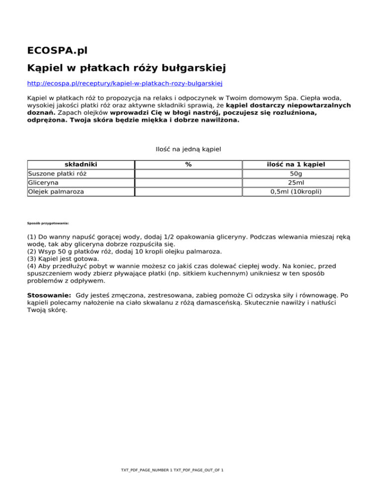 ECOSPA.pl Kąpiel w płatkach róży bułgarskiej http://ecospa.pl/receptury/kapiel-w-platkach-rozy-bulgarskiej Kąpiel w płatkach róż to propozycja na relaks i odpoczynek w Twoim domowym Spa. Ciepła woda, wysokiej jakości płatki róż oraz aktywne składniki sprawią, że kąpiel dostarczy niepowtarzalnych doznań. Zapach olejków wprowadzi Cię w błogi nastrój, poczujesz się rozluźniona, odprężona. Twoja skóra będzie miękka i dobrze nawilżona. Ilość na jedną kąpiel składniki % ilość na 1 kąpiel Suszone płatki róż 50g Gliceryna 25ml Olejek palmaroza 0,5ml (10kropli) Sposób przygotowania: (1) Do wanny napuść gorącej wody, dodaj 1/2 opakowania gliceryny. Podczas wlewania mieszaj ręką wodę, tak aby gliceryna dobrze rozpuściła się. (2) Wsyp 50 g płatków róż, dodaj 10 kropli olejku palmaroza. (3) Kąpiel jest gotowa. (4) Aby przedłużyć pobyt w wannie możesz co jakiś czas dolewać ciepłej wody. Na koniec, przed spuszczeniem wody zbierz pływające płatki (np. sitkiem kuchennym) unikniesz w ten sposób problemów z odpływem. Stosowanie: Gdy jesteś zmęczona, zestresowana, zabieg pomoże Ci odzyska siły i równowagę. Po kąpieli polecamy nałożenie na ciało skwalanu z różą damasceńską. Skutecznie nawilży i natłuści Twoją skórę. TXT_PDF_PAGE_NUMBER 1 TXT_PDF_PAGE_OUT_OF 1
