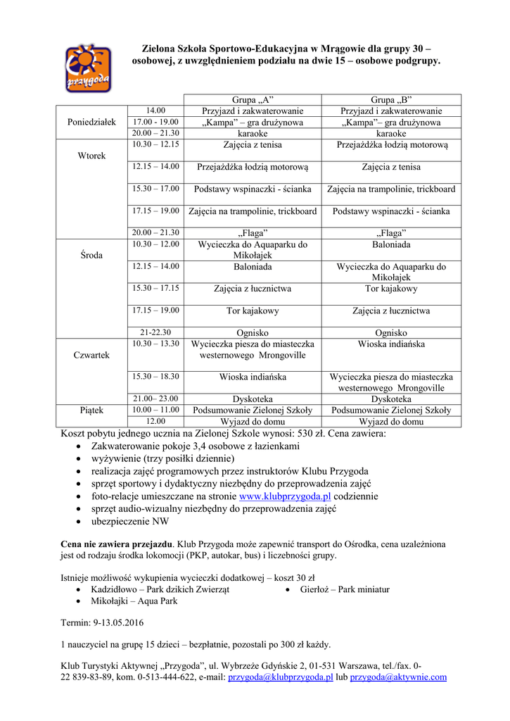 Zielona Szkoła Sportowo-Edukacyjna w Mrągowie dla grupy 30 – osobowej, z uwzględnieniem podziału na dwie 15 – osobowe podgrupy. Poniedziałek 14.00 17.00 - 19.00 20.00 – 21.30 10.30 – 12.15 Grupa „A” Przyjazd i zakwaterowanie „Kampa” – gra drużynowa karaoke Zajęcia z tenisa Grupa „B” Przyjazd i zakwaterowanie „Kampa”– gra drużynowa karaoke Przejażdżka łodzią motorową 12.15 – 14.00 Przejażdżka łodzią motorową Zajęcia z tenisa 15.30 – 17.00 Podstawy wspinaczki - ścianka Zajęcia na trampolinie, trickboard 17.15 – 19.00 Zajęcia na trampolinie, trickboard Podstawy wspinaczki - ścianka 20.00 – 21.30 10.30 – 12.00 „Flaga” Baloniada 12.15 – 14.00 „Flaga” Wycieczka do Aquaparku do Mikołajek Baloniada 15.30 – 17.15 Zajęcia z łucznictwa Wycieczka do Aquaparku do Mikołajek Tor kajakowy 17.15 – 19.00 Tor kajakowy Zajęcia z łucznictwa 21-22.30 10.30 – 13.30 Ognisko Wycieczka piesza do miasteczka westernowego Mrongoville Ognisko Wioska indiańska 15.30 – 18.30 Wioska indiańska 21.00– 23.00 10.00 – 11.00 12.00 Dyskoteka Podsumowanie Zielonej Szkoły Wyjazd do domu Wycieczka piesza do miasteczka westernowego Mrongoville Dyskoteka Podsumowanie Zielonej Szkoły Wyjazd do domu Wtorek Środa Czwartek Piątek Koszt pobytu jednego ucznia na Zielonej Szkole wynosi: 530 zł. Cena zawiera: Zakwaterowanie pokoje 3,4 osobowe z łazienkami wyżywienie (trzy posiłki dziennie) realizacja zajęć programowych przez instruktorów Klubu Przygoda sprzęt sportowy i dydaktyczny niezbędny do przeprowadzenia zajęć foto-relacje umieszczane na stronie www.klubprzygoda.pl codziennie sprzęt audio-wizualny niezbędny do przeprowadzenia zajęć ubezpieczenie NW Cena nie zawiera przejazdu. Klub Przygoda może zapewnić transport do Ośrodka, cena uzależniona jest od rodzaju środka lokomocji (PKP, autokar, bus) i liczebności grupy. Istnieje możliwość wykupienia wycieczki dodatkowej – koszt 30 zł Kadzidłowo – Park dzikich Zwierząt Gierłoż – Park miniatur Mikołajki – Aqua Park Termin: 9-13.05.2016 1 nauczyciel na grupę 15 dzieci – bezpłatnie, pozostali po 300 zł każdy. Klub Turystyki Aktywnej „Przygoda”, ul. Wybrzeże Gdyńskie 2, 01-531 Warszawa, tel./fax. 022 839-83-89, kom. 0-513-444-622, e-mail: [email protected] lub [email protected]