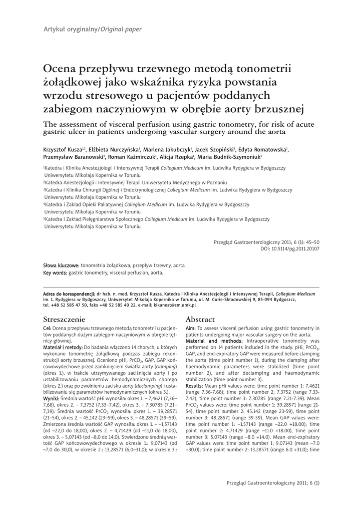 Artykuł oryginalny/Original paper Ocena przepływu trzewnego metodą tonometrii żołądkowej jako wskaźnika ryzyka powstania wrzodu stresowego u pacjentów poddanych zabiegom naczyniowym w obrębie aorty brzusznej The assessment of visceral perfusion using gastric tonometry, for risk of acute gastric ulcer in patients undergoing vascular surgery around the aorta Krzysztof Kusza1,2, Elżbieta Nurczyńska1, Marlena Jakubczyk1, Jacek Szopiński3, Edyta Romatowska1, Przemysław Baranowski4, Roman Kaźmirczuk1, Alicja Rzepka1, Maria Budnik-Szymoniuk5 1Katedra i Klinika Anestezjologii i Intensywnej Terapii Collegium Medicum im. Ludwika Rydygiera w Bydgoszczy Uniwersytetu Mikołaja Kopernika w Toruniu 2Katedra Anestezjologii i Intensywnej Terapii Uniwersytetu Medycznego w Poznaniu 3Katedra i Klinika Chirurgii Ogólnej i Endokrynologicznej Collegium Medicum im. Ludwika Rydygiera w Bydgoszczy Uniwersytetu Mikołaja Kopernika w Toruniu 4Katedra i Zakład Opieki Paliatywnej Collegium Medicum im. Ludwika Rydygiera w Bydgoszczy Uniwersytetu Mikołaja Kopernika w Toruniu 5Katedra i Zakład Pielęgniarstwa Społecznego Collegium Medicum im. Ludwika Rydygiera w Bydgoszczy Uniwersytetu Mikołaja Kopernika w Toruniu Przegląd Gastroenterologiczny 2011; 6 (1): 45–50 DOI: 10.5114/pg.2011.20107 Słowa kluczowe: tonometria żołądkowa, przepływ trzewny, aorta. Key words: gastric tonometry, visceral perfusion, aorta. A dres d o korespond enc ji : dr hab. n. med. Krzysztof Kusza, Katedra i Klinika Anestezjologii i Intensywnej Terapii, Collegium Medicum im. L. Rydygiera w Bydgoszczy, Uniwersytet Mikołaja Kopernika w Toruniu, ul. M. Curie-Skłodowskiej 9, 85-094 Bydgoszcz, tel. +48 52 585 47 50, faks +48 52 585 40 22, e-mail: [email protected] Streszczenie Abstract Cel: Ocena przepływu trzewnego metodą tonometrii u pacjentów poddanych dużym zabiegom naczyniowym w obrębie tętnicy głównej. Materiał i metody: Do badania włączono 14 chorych, u których wykonano tonometrię żołądkową podczas zabiegu rekonstrukcji aorty brzusznej. Oceniono pHi, PrCO2, GAP, GAP końcowowydechowe przed zamknięciem światła aorty (clamping) (okres 1.), w trakcie utrzymywanego zaciśnięcia aorty i po ustabilizowaniu parametrów hemodynamicznych chorego (okres 2.) oraz po zwolnieniu zacisku aorty (declamping) i ustabilizowaniu się parametrów hemodynamicznych (okres 3.). Wyniki: Średnia wartość pHi wynosiła: okres 1. – 7,4621 (7,36– 7,68), okres 2. – 7,3752 (7,33–7,42), okres 3. – 7,30785 (7,21– 7,39). Średnia wartość PrCO2 wynosiła: okres 1. – 39,28571 (21–54), okres 2. – 45,142 (23–59), okres 3. – 48,28571 (39–59). Zmierzona średnia wartość GAP wynosiła: okres 1. – –1,57143 (od –22,0 do 18,00), okres 2. – 4,71429 (od –11,0 do 18,00), okres 3. – 5,07143 (od –8,0 do 14,0). Stwierdzono średnią wartość GAP końcowowydechowego w okresie 1.: 9,07143 (od –7,0 do 30,0), w okresie 2.: 13,28571 (6,0–31,0); w okresie 3.: Aim: To assess visceral perfusion using gastric tonometry in patients undergoing major vascular surgery on the aorta. Mat erial an d meth ods : Intraoperative tonometry was performed on 14 patients included in the study. pHi, PrCO2, GAP, and end-expiratory GAP were measured before clamping the aorta (time point number 1), during the clamping after haemodynamic parameters were stabilized (time point number 2), and after declamping and haemodynamic stabilization (time point number 3). Results: Mean pHi values were: time point number 1: 7.4621 (range 7.36-7.68); time point number 2: 7.3752 (range 7.337.42), time point number 3: 7.30785 (range 7.21-7.39). Mean PrCO2 values were: time point number 1: 39.28571 (range 2154), time point number 2: 45.142 (range 23-59), time point number 3: 48.28571 (range 39-59). Mean GAP values were: time point number 1: –1.57143 (range –22.0 +18.00); time point number 2: 4.71429 (range –11.0 +18.00), time point number 3: 5.07143 (range –8.0 +14.0). Mean end-expiratory GAP values were: time point number 1: 9.07143 (mean –7.0 +30.0); time point number 2: 13.28571 (range 6.0 +31.0); time Przegląd Gastroenterologiczny 2011; 6 (1) 46 Krzysztof Kusza, Elżbieta Nurczyńska, Marlena Jakubczyk, Jacek Szopiński, Edyta Romatowska, Przemysław Baranowski, Roman Kaźmirczuk, Alicja Rzepka, Maria Budnik-Szymoniuk 14,07143 (od –1 do 21). Różnice pomiędzy wynikami były istotne statystycznie. Wnioski: Tonometria żołądkowa umożliwia wykrycie zaburzeń przepływu trzewnego u chorych podczas zabiegów rekonstrukcji aorty brzusznej, co pozwala na optymalizację śródoperacyjnej płynoterapii oraz odpowiedni dobór technik znieczulenia. point number 3: 14.07143 (range –1 +21). The differences between the analysed groups were statistically significant. Conclusions: Gastric tonometry allows detection of visceral perfusion impairment in patients undergoing reconstructive surgery of the abdominal aorta. Intraoperative tonometry may be helpful for adequate fluid resuscitation and choice of appropriate type of anaesthesia. Wstęp trzewnym i niedostatecznej perfuzji w przewodzie pokarmowym; • PrCO2 – regionalna prężność CO2 w błonie śluzowej, wzrost powyżej 45 mm Hg świadczy o hipoperfuzji trzewnej; • GAP (PrCO2 – PaCO2) – różnica między prężnością regionalną i tętniczą CO2, nazywana również luką wodorowęglanową. Wartość fizjologiczna wynosi poniżej 7 mm Hg, wartości 7–20 świadczą o umiarkowanym zaburzeniu perfuzji trzewnej, natomiast > 20 o ciężkich zaburzeniach w perfuzji i w przepływie trzewnym krwi. Wskaźnik ten jest bardziej miarodajny od samej oceny pHi lub PrCO2. Wzrost prężności CO2 we krwi tętniczej (PaCO2), jako np. rezultat hipowentylacji pęcherzykowej, koresponduje ze wzrostem wartości prężności regionalnej CO2 w błonie śluzowej żołądka (PrCO2) bez zmian w przepływie trzewnym; • GAP końcowowydechowe (PrCO2 – EtCO2) – różnica między prężności