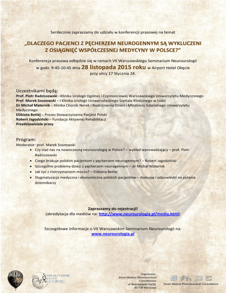 Serdecznie zapraszamy do udziału w konferencji prasowej na temat „DLACZEGO PACJENCI Z PĘCHERZEM NEUROGENNYM SĄ WYKLUCZENI Z OSIĄGNIĘĆ WSPÓŁCZESNEJ MEDYCYNY W POLSCE?” Konferencja prasowa odbędzie się w ramach VII Warszawskiego Seminarium Neurourologii w godz. 9:45-10:45 dnia 28 listopada 2015 roku w Airport Hotel Okęcie przy ulicy 17 Stycznia 24. Uczestnikami będą: Prof. Piotr Radziszewski –Klinika Urologii Ogólnej i Czynnościowej Warszawskiego Uniwersytetu Medycznnego Prof. Marek Sosnowski – I Klinika Urologii Uniwersyteckiego Szpitala Klinicznego w Łodzi Dr Michał Maternik – Klinika Chorób Nerek i Nadciśnienia Dzieci i Młodzieży Gdańskiego Uniwersytetu Medycznego Elżbieta Betlej – Prezes Stowarzyszenia Pacjent Polski Robert Jagodziński – Fundacja Aktywnej Rehabilitacji Przedstawiciele prasy Program: Moderator: prof. Marek Sosnowski • Czy stać nas na nowoczesną neurourologię w Polsce? – wykład wprowadzający – prof. Piotr Radziszewski • Czego brakuje polskim pacjentom z pęcherzem neurogennym? – Robert Jagodziński • Szczególne problemy dzieci z pęcherzem neurogennym – dr Michał Maternik • Jak żyć z nietrzymaniem moczu? – Elżbieta Betlej • Stygmatyzacja medyczna i ekonomiczna polskich pacjentów – dyskusja i odpowiedzi na pytania dziennikarzy Zapraszamy do rejestracji! (akredytacja dla mediów na: http://www.neurourologia.pl/media.html) Szczegółowe informacje o VII Warszawskim Seminarium Neurourologii na: www.neurourologia.pl Organizator: Smart Medical Pharmaceutical Consultations ul. Bobrowiecka 3a/20, 00-728 Warszawa