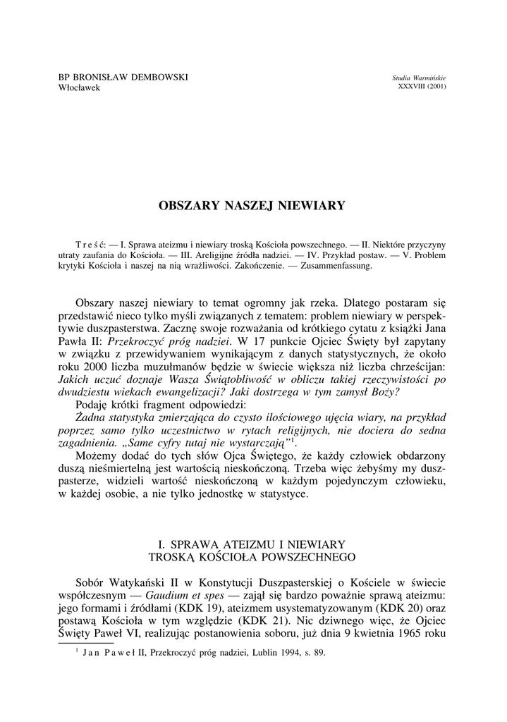 BP BRONISŁAW DEMBOWSKI Włocławek Studia Warmińskie XXXVIII (2001) OBSZARY NASZEJ NIEWIARY T r e ś ć: — I. Sprawa ateizmu i niewiary troska Kościoła powszechnego. — II. Niektóre przyczyny utraty zaufania do Kościoła. — III. Areligijne źródła nadziei. — IV. Przykład postaw. — V. Problem krytyki Kościoła i naszej na nia wraz liwości. Zakończenie. — Zusammenfassung. Obszary naszej niewiary to temat ogromny jak rzeka. Dlatego postaram sie przedstawić nieco tylko myśli zwiazanych z tematem: problem niewiary w perspektywie duszpasterstwa. Zaczne swoje rozwaz ania od krótkiego cytatu z ksiaz ki Jana Pawła II: Przekroczyć próg nadziei. W 17 punkcie Ojciec Świety był zapytany w zwiazku z przewidywaniem wynikajacym z danych statystycznych, z e około roku 2000 liczba muzułmanów bedzie w świecie wieksza niz liczba chrześcijan: Jakich uczuć doznaje Wasza Światobliwość w obliczu takiej rzeczywistości po dwudziestu wiekach ewangelizacji? Jaki dostrzega w tym zamysł Bozy? Podaje krótki fragment odpowiedzi: Zadna statystyka zmierzajaca do czysto ilościowego ujecia wiary, na przykład poprzez samo tylko uczestnictwo w rytach religijnych, nie dociera do sedna zagadnienia. „Same cyfry tutaj nie wystarczaja”1. Moz emy dodać do tych słów Ojca Świetego, z e kaz dy człowiek obdarzony dusza nieśmiertelna jest wartościa nieskończona. Trzeba wiec z ebyśmy my duszpasterze, widzieli wartość nieskończona w kaz dym pojedynczym człowieku, w kaz dej osobie, a nie tylko jednostke w statystyce. I. SPRAWA ATEIZMU I NIEWIARY TROSKA KOŚCIOŁA POWSZECHNEGO Sobór Watykański II w Konstytucji Duszpasterskiej o Kościele w świecie współczesnym — Gaudium et spes — zajał sie bardzo powaz nie sprawa ateizmu: jego formami i źródłami (KDK 19), ateizmem usystematyzowanym (KDK 20) oraz postawa Kościoła w tym wzgledzie (KDK 21). Nic dziwnego wiec, z e Ojciec Świety Paweł VI, realizujac postanowienia soboru, juz dnia 9 kwietnia 1965 roku 1 J a n P a w e ł II, Przekroczyć próg nadziei, Lublin 1994, s. 89. 222 BP BRONISŁAW DEMBOWSKI ustanowił Sekretariat dla Niewierzacych z zadaniem studiowania ateizmu, jego form i przyczyn, oraz nawiazania z niewierzacymi dialogu. Pod terminem „niewierzacy” rozumie sie tych wszystkich, którzy w teorii i praktyce nie wyznaja z adnej religii: ateistów, agnostyków, obojetnych itd. Oczywiście spotkanie i dialog wierzacych z niewierzacymi moz e sie urzeczywistniać jedynie na podstawie wspólnego przyjmowania autentycznych wartości ogólnoludzkich i dobrej woli ich realizowania. Dialog ten nie jest jakaś forma prozelityzmu, nawracania, lecz jednym z bodźców, który pomagajac lepiej rozumieć dzisiejsze przyczyny niewiary, a takz e i wiary, skłania wierzacych do refleksji teologiczno-pastoralnej nad sposobami przekazywania oredzia chrześcijańskiego współczesnym ludziom. W 1988 roku nastapiła reorganizacja Kurii Rzymskiej i obecnie kompetencje Sekretariatu dla Niewierzacych przejeła Papieska Rada ds. Kultury majaca dwa wydziały: Wiara i Kultura oraz Dialog z Kultura. Charakterystyczne, z e w nazwie tej rady nie uz yto słowa „niewierzacy”. Połoz ono natomiast akcent na dialog członków Kościoła z przedstawicielami róz nych kultur i orientacji myślowych, w tym takz e niewierzacych, dla wzajemnego zrozumienia i przezwyciez enia uprzedzeń. W Polsce Komisja Episkopatu ds. Dialogu z Niewierzacymi została powołana w 1976 roku. Jej pierwszym przewodniczacym był bp Kazimierz Majdański. Waz nym wydarzeniem było sympozjum na temat: Niewierzacy a Kościół zorganizowane przez te komisje. Odbyło sie ono 31 maja 1988 roku w siedzibie Sekretariatu Episkopatu Polski. Gościem był kard. Paul Poupard, przewodniczacy Papieskiej Rady ds. Kultury2. Kolejnymi przewodniczacymi Komisji ds. Dialogu z Niewierzacymi byli bp Alfons Nossol i bp Bohdan Bejze. Sekretarzem od 1980 roku był ks. Bronisław Dembowski. Powaz nym osiagnieciem Komisji pod przewodnictwem bpa Bohdana Bejzego było opublikowanie w 1993 roku ksiaz ki Jak dzisiejszemu człowiekowi mówić o Bogu?3 zawierajacej odpowiedzi na kwestionariusz ogłoszony przez Papieska Rade ds. Kultury. W czerwcu 1996 roku, 283 Zebranie Plenarne Episkopatu Polski ustanowiło nowy układ komisji i rad Episkopatu. Powstała wtedy takz e Rada ds. Dialogu Religijnego pod przewodnictwem bpa Stanisława Gadeckigo, składajaca sie z trzech sekcji, nazwanych komitetami: Dialogu z Judaizmem (przewodniczacy bp Stanisław Gadecki), Dialogu z Religiami Niechrześcijańskimi, Ruchami Religijnymi i Sektami (przewodniczacy bp Zygmunt Pawłowicz) i Dialogu z Niewierzacymi (przewodniczacy bp Bronisław Dembowski). Inspiracja dla prac Komitetu Dialogu z Niewierzacymi jest miedzy innymi stale aktualna wypowiedź Soboru Watykańskiego II mówiaca na temat źródeł ateizmu, obok czego nie moz na przejść obojetnie: Zapewne nie sa wolni od winy ci, którzy dobrowolnie usiłuja bronić Bogu dostepu do swego serca i unikać zagadnień religijnych, nie idac za głosem swego sumienia [podkreślam: dobrowolnie i nie idac za głosem sumienia]; jednakze i sami 2 Materiały tego sympozjum zostały opublikowane w miesieczniku Znak 405–406(1989). Jak dzisiejszemu człowiekowi mówić o Bogu?, pr. zb., red. bp Bohdan B e j z e, Wyd. ATK, Warszawa 1993, Wyd. drugie — poprawione i poszerzone, Wyd. „Civitas Christiana”, Warszawa 1994. 3 OBSZARY NASZEJ NIEWIARY 223 wierzacy ponosza czesto za to pewna odpowiedzialność. Ateizm bowiem wziety w całości nie jest czymś pierwotnym, lecz raczej powstaje z róznych przyczyn, do których zalicza sie tez krytyczna reakcja przeciw religiom, a w niektórych krajach szczególnie przeciw religii chrześcijańskiej. Dlatego w takiej genezie ateizmu niemały udział moga mieć wierzacy, o ile skutkiem zaniedbań w wychowaniu religijnym, albo fałszywego przedstawiania nauki wiary, albo tez braków w ich własnym zyciu religijnym, moralnym, i społeczny