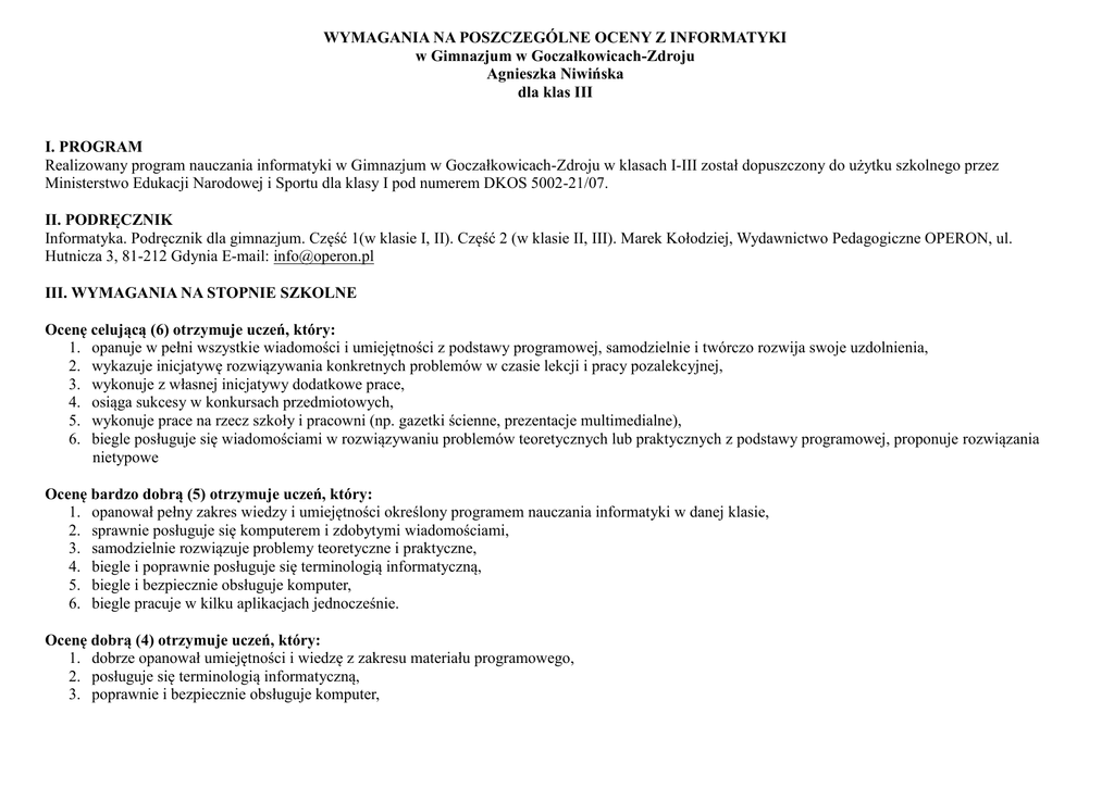 WYMAGANIA NA POSZCZEGÓLNE OCENY Z INFORMATYKI w Gimnazjum w Goczałkowicach-Zdroju Agnieszka Niwińska dla klas III I. PROGRAM Realizowany program nauczania informatyki w Gimnazjum w Goczałkowicach-Zdroju w klasach I-III został dopuszczony do użytku szkolnego przez Ministerstwo Edukacji Narodowej i Sportu dla klasy I pod numerem DKOS 5002-21/07. II. PODRĘCZNIK Informatyka. Podręcznik dla gimnazjum. Część 1(w klasie I, II). Część 2 (w klasie II, III). Marek Kołodziej, Wydawnictwo Pedagogiczne OPERON, ul. Hutnicza 3, 81-212 Gdynia E-mail: [email protected] III. WYMAGANIA NA STOPNIE SZKOLNE Ocenę celującą (6) otrzymuje uczeń, który: 1. opanuje w pełni wszystkie wiadomości i umiejętności z podstawy programowej, samodzielnie i twórczo rozwija swoje uzdolnienia, 2. wykazuje inicjatywę rozwiązywania konkretnych problemów w czasie lekcji i pracy pozalekcyjnej, 3. wykonuje z własnej inicjatywy dodatkowe prace, 4. osiąga sukcesy w konkursach przedmiotowych, 5. wykonuje prace na rzecz szkoły i pracowni (np. gazetki ścienne, prezentacje multimedialne), 6. biegle posługuje się wiadomościami w rozwiązywaniu problemów teoretycznych lub praktycznych z podstawy programowej, proponuje rozwiązania nietypowe Ocenę bardzo dobrą (5) otrzymuje uczeń, który: 1. opanował pełny zakres wiedzy i umiejętności określony programem nauczania informatyki w danej klasie, 2. sprawnie posługuje się komputerem i zdobytymi wiadomościami, 3. samodzielnie rozwiązuje problemy teoretyczne i praktyczne, 4. biegle i poprawnie posługuje się terminologią informatyczną, 5. biegle i bezpiecznie obsługuje komputer, 6. biegle pracuje w kilku aplikacjach jednocześnie. Ocenę dobrą (4) otrzymuje uczeń, który: 1. dobrze opanował umiejętności i wiedzę z zakresu materiału programowego, 2. posługuje się terminologią informatyczną, 3. poprawnie i bezpiecznie obsługuje komputer, 4. z pomocą nauczyciela rozwiązuje problemy wynikające w trakcie wykonywania zadań programowych, 5. pracuje w kilku aplikacjach jednocześnie. Ocenę dostateczną (3) otrzymuje uczeń, który: 1. w sposób zadowalający opanował umiejętności i wiedzę z zakresu materiału programowego, 2. zna terminologię informatyczną, ale ma trudności z jej zastosowaniem, 3. poprawnie i bezpiecznie obsługuje komputer, 4. nie potrafi rozwiązać problemów wynikających w trakcie wykonywania zadań programowych, nawet z pomocą nauczyciela, 5. poprawnie pracuje tylko w jednej aplikacji jednocześnie. Ocenę dopuszczającą (2) otrzymuje uczeń, który: 1. częściowo opanował umiejętności i wiedzę z zakresu materiału programowego, 2. częściowo zna terminologię informatyczną, ale nie potrafi jej zastosować, 3. bezpiecznie obsługuje komputer, 4. zadaną pracę wykonuje z pomocą nauczyciela, 5. ma problemy przy pracy w najprostszych aplikacjach, 6. poprawnie uruchamia komputer i zamyka system, 7. poprawnie uruchamia i zamyka proste aplikacje. Ocenę niedostateczną (1) otrzymuje uczeń, który: 1. nie opanował umiejętności i wiedzy z zakresu materiału programowego, 2. nie zna terminologii informatycznej, 3. nie stosuje bezpiecznej obsługi komputera, 4. nie potrafi poprawnie uruchomić komputera i zamknąć systemu. IV. ZASADY I FORMY SPRAWDZANIA I OCENIANIA, SPOSOBY I TERMINY KONTROLI 1. Uczeń powinien aktywnie uczestniczyć w zajęciach i w swojej pracy dążyć do poszerzania i pogłębiania zdobytych umiejętności i wiadomości wykorzystując dostępne metody i formy pracy. 2. Uczeń ma prawo 1 raz w semestrze być nieprzygotowanym do zajęć. Fakt ten może zostać odnotowany w dzienniku i/lub zeszycie ucznia, jednakże nie ma on wpływu na ocenę. 3. Na początku roku uczniowi zostaje przedstawiona informacja na temat form sprawdzania umiejętności i wiadomości, sposobów dokonywania oceny. 4. Uczeń ma prawo do uzyskania dodatkowych wyjaśnień dotyczących wystawionej oceny cząstkowej. 5. Wprowadza się symbol zero „0” stosowany w wypadku, gdy uczeń nie zgłosi się na zapowiedziany pisemny sprawdzian wiadomości, kartkówkę, projekt itp. Uczeń ma obowiązek uzupełnić daną pracę w terminie uzgodnionym z nauczycielem i wówczas symbol „0” zastąpiony zostanie jedną z ocen cząstkowych zgodnie z ustaloną powyżej skalą ocen cząstkowych. Jeśli uczeń nie dopełni obowiązku uzupełnienia materiału objętego sprawdzianem, symbol „0” nie zostanie anulowany i będzie brany pod uwagę przy ustalaniu oceny śródrocznej (rocznej). 2 6. Uczeń ma obowiązek uzupełnienie zaległości wynikłych z nieobecności, na zasadach w i terminie ustalonym przez prowadzącego zajęcia zgodnie z WSO. Sprawdziany teoretyczne i praktyczne umiejętności pracy na komputerze, wskazane przez nauczyciela karty pracy (kartkówki) są obowiązkowe. 7. Uczeń gromadzi wykonane przez siebie zadania w utworzonych folderze wyznaczonym przez nauczyciela. Odpowiada za sposób i czytelność przechowywania informacji. 8. W przypadku błędnego zapisu pliku lub jego brak na wskazanym do zapisu nośniku danych w celu oceny pracy jest równoznaczne z otrzymaniem przez ucznia oceny niedostatecznej. 9. Kopiowanie prac oraz ingerencja w folder innych uczniów jest zabronione. W przypadku stwierdzenia naruszenia praw autorskich praca własna ucznia oceniana jest jako niedostateczna. 10. Za systematyczne, co najmniej kilkumiesięczne, podejmowanie działań wykorzystujących umiejętności związane z informatyką na rzecz podniesienia jakości pracy szkoły uczeń może uzyskać dodatkowo ocenę (oceny) cząstkowe umożliwiające uzyskanie oceny klasyfikacyjnej o notę wyższą. 11. Formy oceniania bieżącej pracy ucznia na lekcji to: karty ćwiczeń (np. krzyżówka), notatki w zeszycie, wykonywanie bieżących ćwiczeń na lekcji na komputerze. 12. W trakcie semestru uczniowie piszą karty pracy (kartkówki) bez wcześniejszego uprzedzenia (sprawdzające systematyczną pracę ucznia i bieżące pr