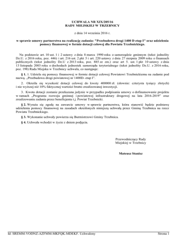UCHWAŁA NR XIX/205/16 RADY MIEJSKIEJ W TRZEBNICY z dnia 14 września 2016 r. w sprawie umowy partnerstwa na realizację zadania: "Przebudowa drogi 1400 D etap I" oraz udzielenia pomocy finansowej w formie dotacji celowej dla Powiatu Trzebnickiego. Na podstawie art. 10 ust. 1 i 2 ustawy z dnia 8 marca 1990 roku o samorządzie gminnym (tekst jednolity Dz.U. z 2016 roku, poz. 446) i art. 216 ust. 2 pkt 5 i art. 220 ustawy z dnia 27 sierpnia 2009 roku o finansach publicznych (tekst jednolity Dz.U z 2013 roku, poz. 885 ze zm.) oraz art 5. ust. 1 pkt 10 ustawy z dnia 13 listopada 2003 roku o dochodach jednostek samorządu terytorialnego (tekst jednolity Dz.U. z 2016 roku, poz. 198) Rada Miejska w Trzebnicy uchwala, co następuje: § 1. 1. Udziela się pomocy finansowej w formie dotacji celowej Powiatowi Trzebnickiemu na zadanie pod nazwą. „Przebudowa drogi powiatowej nr 1400D- etap I”. 2. Określa się wysokość dotacji celowej do kwoty 400000 zł. (słownie: czterysta tysięcy złotych) i nie wyższej niż 10% faktycznej wartości brutto zrealizowanej inwestycji. 3. Kwota dotacji zostanie przekazana jedynie w przypadku podpisania umowy o dofinansowanie projektu w ramach „Programu rozwoju gminnej i powiatowej infrastruktury drogowej na lata 2016-2019” oraz zrealizowaniu zadania przez beneficjenta t.j. Powiat Trzebnicki. § 2. Wyraża się zgodę na zawarcie umowy w sprawie partnerstwa, która stanowić będzie podstawę udzielenia pomocy finansowej na zasadach określonych niniejszą uchwałą przez Gminą Trzebnica na rzecz Powiatu Trzebnickiego. § 3. Wykonanie uchwały powierza się Burmistrzowi Gminy Trzebnica. § 4. Uchwała wchodzi w życie z dniem podjęcia. Przewodniczący Rady Miejskiej w Trzebnicy Mateusz Stanisz Id: SREMM-VODNZ-AZFMM-MKFQK-MDEKF. Uchwalony Strona 1