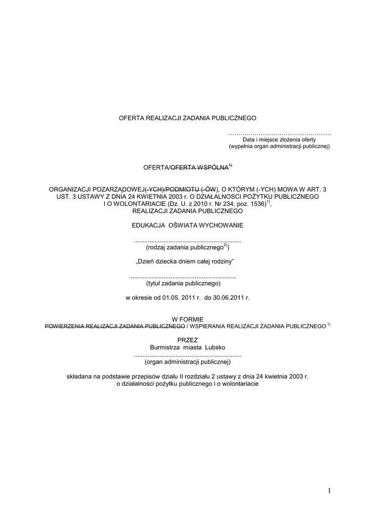 OFERTA REALIZACJI ZADANIA PUBLICZNEGO ………..………………………………… Data i miejsce złożenia oferty (wypełnia organ administracji publicznej) 1) OFERTA/OFERTA WSPÓLNA ORGANIZACJI POZARZĄDOWEJ(-YCH)/PODMIOTU (-ÓW), O KTÓRYM (-YCH) MOWA W ART. 3 UST. 3 USTAWY Z DNIA 24 KWIETNIA 2003 r. O DZIAŁALNOSCI POŻYTKU PUBLICZNEGO 1) I O WOLONTARIACIE (Dz. U. z 2010 r. Nr 234, poz. 1536) , REALIZACJI ZADANIA PUBLICZNEGO EDUKACJA OŚWIATA WYCHOWANIE .............................................................. 2) (rodzaj zadania publicznego ) „Dzień dziecka dniem całej rodziny” .............................................................. (tytuł zadania publicznego) w okresie od 01.05. 2011 r. do 30.06.2011 r. W FORMIE POWIERZENIA REALIZACJI ZADANIA PUBLICZNEGO / WSPIERANIA REALIZACJI ZADANIA PUBLICZNEGO 1) PRZEZ Burmistrza miasta Lubsko .............................................................. (organ administracji publicznej) składana na podstawie przepisów działu II rozdziału 2 ustawy z dnia 24 kwietnia 2003 r. o działalności pożytku publicznego i o wolontariacie 1 I. Dane oferenta/oferentów 1), 3) 1) nazwa:”Stowarzyszenie Przyjaciół Wsi Grabków” 4) 2) forma prawna: ( x ) stowarzyszenie ( ) fundacja ( ) kościelna osoba prawna ( ) kościelna jednostka organizacyjna ( ) spółdzielnia socjalna ( ) inna………………………………… 5) 3) numer w Krajowym Rejestrze Sądowym, w innym rejestrze lub ewidencji: ...0000299080............................................................................................. 6) 4) data wpisu, rejestracji lub utworzenia: 5) nr NIP: 9282013342 26.02.2008 r. nr REGON: 080244010 6) adres: miejscowość: Grabków 49 7) dzielnica lub inna jednostka pomocnicza: ……………………………………….. 8) gmina: Lubsko powiat: Żary województwo: Lubuskie kod pocztowy: 68-300 7) tel.:683729314 poczta: Lubsko faks: ..................................................... e-mail: ................................ http:// ............................................... 8) numer rachunku bankowego: 63109015640000000109026649 nazwa banku: BZ WBK oddział Lubsko 1) 9) nazwiska i imiona osób upoważnionych do reprezentowania oferenta/oferentów : a) Joanna Ostapowicz b) Grażyna Mazurkiewicz c) ……………………………………………………………………………..…. 10) nazwa, adres i telefon kontaktowy jednostki organizacyjnej bezpośrednio wykonującej zadanie, 9) o którym mowa w ofercie: „ Stowarzyszenie Przyjaciół Wsi Grabków” 68-372 93 14 2 11) osoba upoważniona do składania wyjaśnień dotyczących oferty (imię i nazwisko oraz nr telefonu kontaktowego) Joanna Ostapowicz tel. 669855154 12) przedmiot działalności pożytku publicznego: a) działalność nieodpłatna pożytku publicznego -inicjowanie aktywności publicznej-integracja społeczności lokalnej -inicjowanie i wspieranie działalności kulturalnej -organizacja imprez dla i z udziałem członków lokalnej społeczności -działalnośc stowarzyszenia oparta jest przede wszystkim na pracy społecznej członków 1) 1) 13) jeżeli oferent /oferenci prowadzi/prowadzą działalność gospodarczą: a) numer wpisu do rejestru przedsiębiorców ………………………………………………………….. b) przedmiot działalności gospodarczej Nie dotyczy II. Informacja o sposobie reprezentacji oferentów wobec organu administracji publicznej wraz 10) z przytoczeniem podstawy prawnej Nie dotyczy 3 III. Szczegółowy zakres rzeczowy zadania publicznego proponowanego do realizacji 1. Krótka charakterystyka zadania publicznego „Dzień dziecka ” – celem zadania jest urozmaicenie i uatrakcyjnienie szczególnego Dnia w życiu najmłodszych mieszkańców naszej wioski. 2. Opis potrzeb wskazujących na konieczność wykonania zadania publicznego, opis ich przyczyn oraz skutków Dotacja pozwoli uatrakcyjnić i zorganizować zabawę dla dzieci, zakupić słodycze i upominki. 3. Opis grup adresatów zadania publicznego Członkowie stowarzyszenia. Rada sołecka. Mieszkańcy wioski. 4. Uzasadnienie potrzeby dofinansowania z dotacji inwestycji związanych z realizacją zadania publicznego, w szczególności ze wskazaniem w jaki sposób przyczyni się to do podwyższenia 11) standardu realizacji zadania. Środki z dotacji pozwolą zakupić słodycze i podarunki dla dzieci. 1) 5. Informacja, czy w ciągu ostatnich 5 lat oferent/oferenci 1) otrzymał/otrzymali dotację na dofinansowanie inwestycji związanych z realizacją zadania publicznego z podaniem inwestycji, które 11) zostały dofinansowane, organu który udzielił dofinansowania oraz daty otrzymania dotacji . 4 „Święto pieczonego kartofla” -Urząd miasta Lubsko-sierpień 2009 r. „Dzień dziecka” –Urząd miasta Lubsko –maj 2010 r. „Święto pieczonego Kartofla” – Urząd miasta Lubsko –lipiec 2010 r. 6. Zakładane cele realizacji zadania publicznego oraz sposób ich realizacji Celem zorganizowania imprezy jest: „podtrzymywanie tradycji narodowej, obywatelskiej i Kulturowej” oraz rozwój wspólnoty gminnej. 7. Miejsce realizacji zadania publicznego Świetlica wiejska i teren wokół niej -wieś Grabków. 8. Opis poszczególnych działań w zakresie realizacji zadania publicznego 12) 1. Przygotowanie planu działania oraz przebiegu uroczystości. 2.Spotkanie grupy osób odpowiedzialnych za wykonanie zadania i podział obowiązkow. 3. Zakup towaru potrzebnego do wykonania zadania. 4. Przygotowanie miejsca i udekorowanie. 5.Wykonanie zadania. 6. Rozliczenie projektu. 9. Harmonogram 13) 5 Zadanie publiczne realizowane w okresie od01.05.2011 r. do 31.06.2011 r. Poszczególne działania w zakresie Terminy realizacji Oferent lub inny podmiot odpowiedzialny za realizowanego zadania poszczególnych 14) działanie w zakresie realizowanego zadania publicznego działań publicznego Pozyskiwanie środków Maj 2011 r. Oferent Spotkanie grupy wykonawczej M