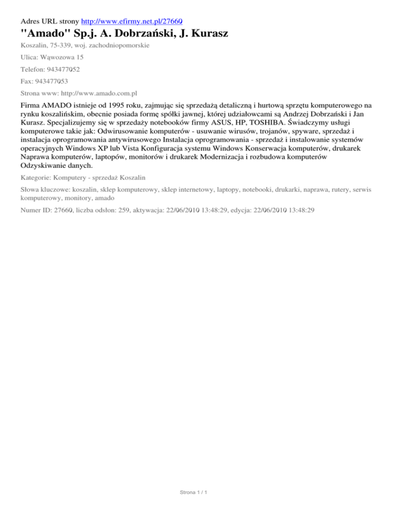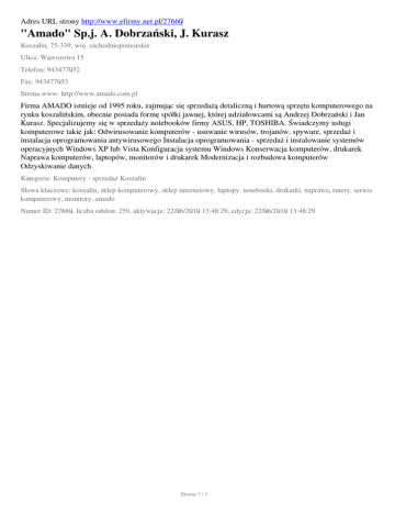 Adres URL strony http://www.efirmy.net.pl/27660 "Amado" Sp.j. A. Dobrzański, J. Kurasz Koszalin, 75-339, woj. zachodniopomorskie Ulica: Wąwozowa 15 Telefon: 943477052 Fax: 943477053 Strona www: http://www.amado.com.pl Firma AMADO istnieje od 1995 roku, zajmując się sprzedażą detaliczną i hurtową sprzętu komputerowego na rynku koszalińskim, obecnie posiada formę spółki jawnej, której udziałowcami są Andrzej Dobrzański i Jan Kurasz. Specjalizujemy się w sprzedaży notebooków firmy ASUS, HP, TOSHIBA. Świadczymy usługi komputerowe takie jak: Odwirusowanie komputerów - usuwanie wirusów, trojanów, spyware, sprzedaż i instalacja oprogramowania antywirusowego Instalacja oprogramowania - sprzedaż i instalowanie systemów operacyjnych Windows XP lub Vista Konfiguracja systemu Windows Konserwacja komputerów, drukarek Naprawa komputerów, laptopów, monitorów i drukarek Modernizacja i rozbudowa komputerów Odzyskiwanie danych. Kategorie: Komputery - sprzedaż Koszalin Słowa kluczowe: koszalin, sklep komputerowy, sklep internetowy, laptopy, notebooki, drukarki, naprawa, rutery, serwis komputerowy, monitory, amado Numer ID: 27660, liczba odsłon: 259, aktywacja: 22/06/2010 13:48:29, edycja: 22/06/2010 13:48:29 Strona 1 / 1